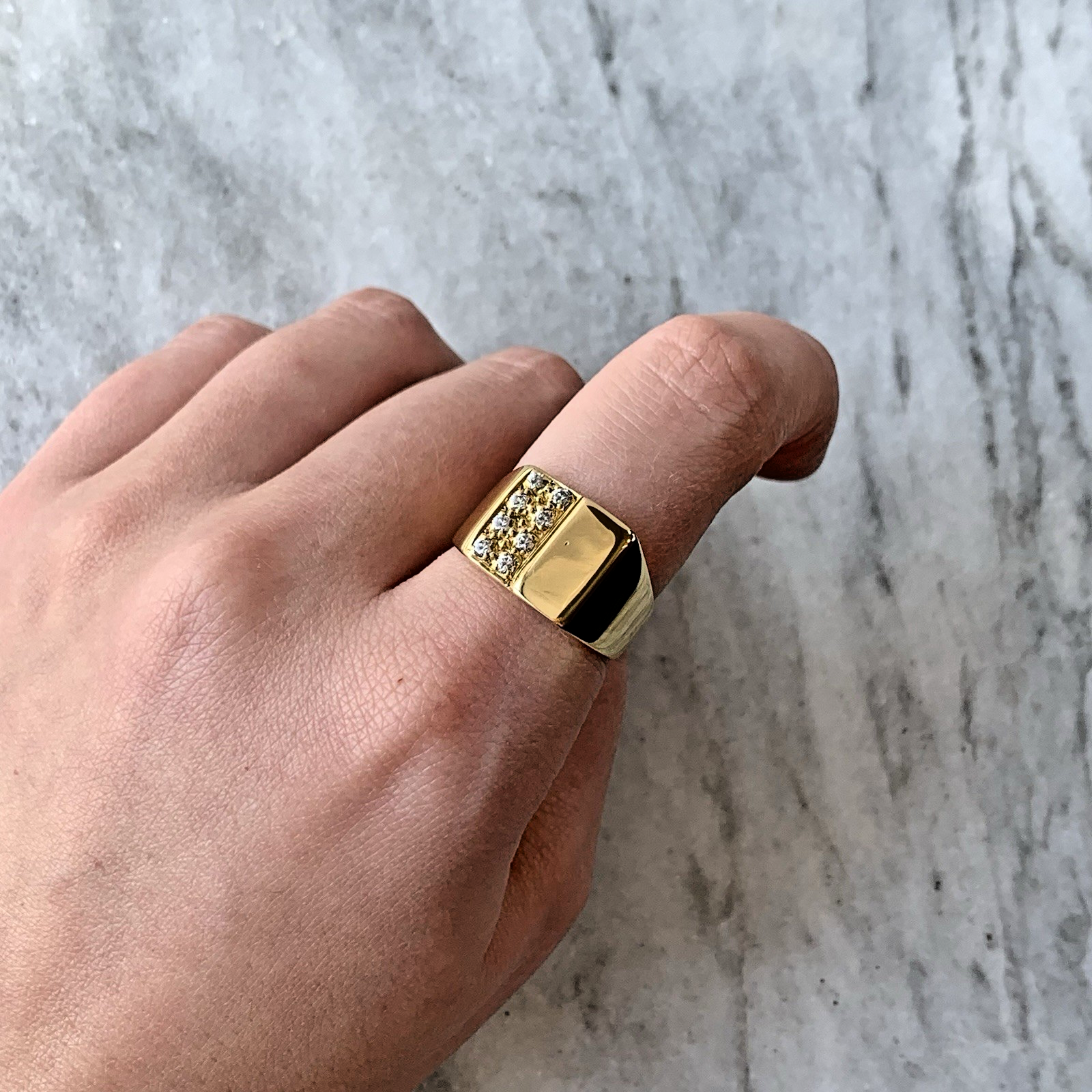 A classic retro signet ring in 18ct gold with a cluster of sparkling cubic zirconia stones.