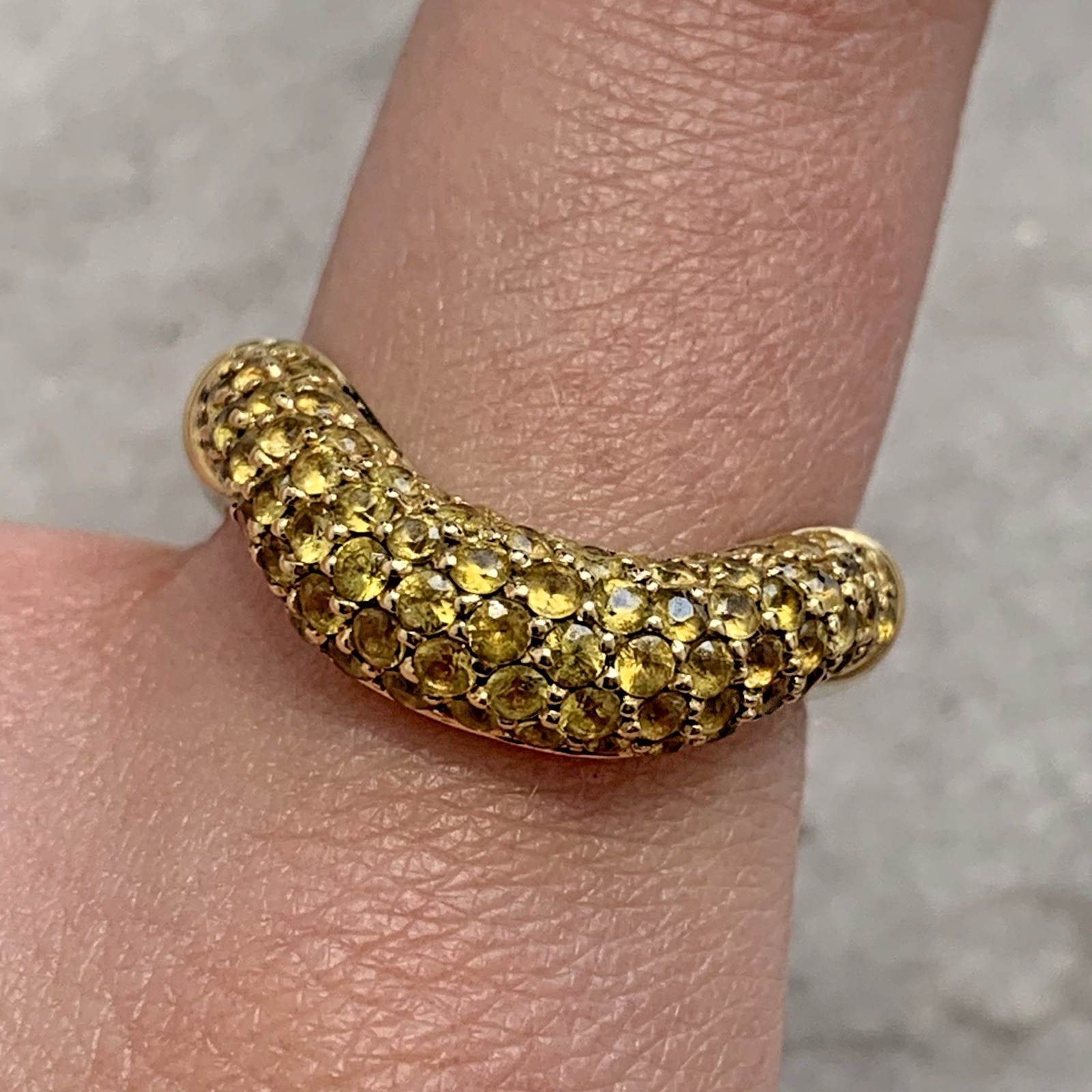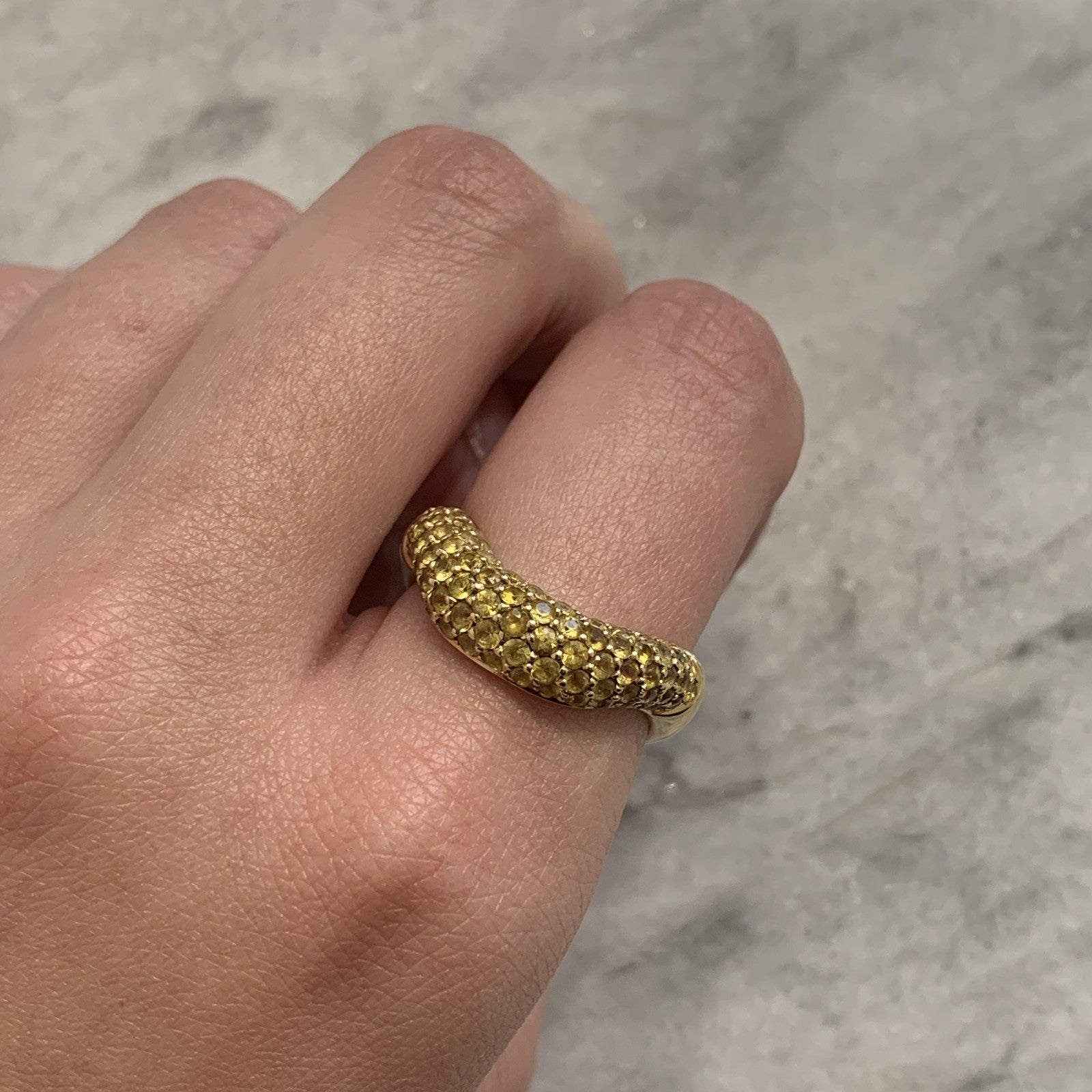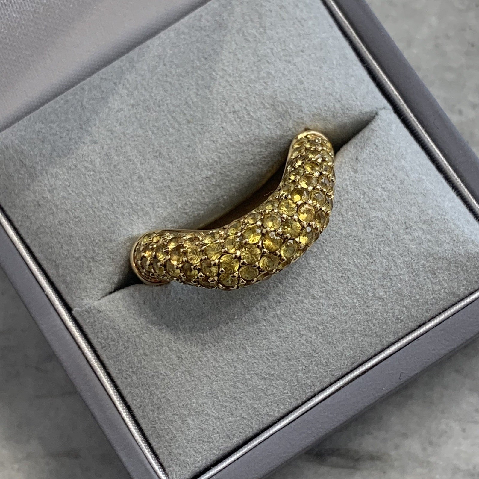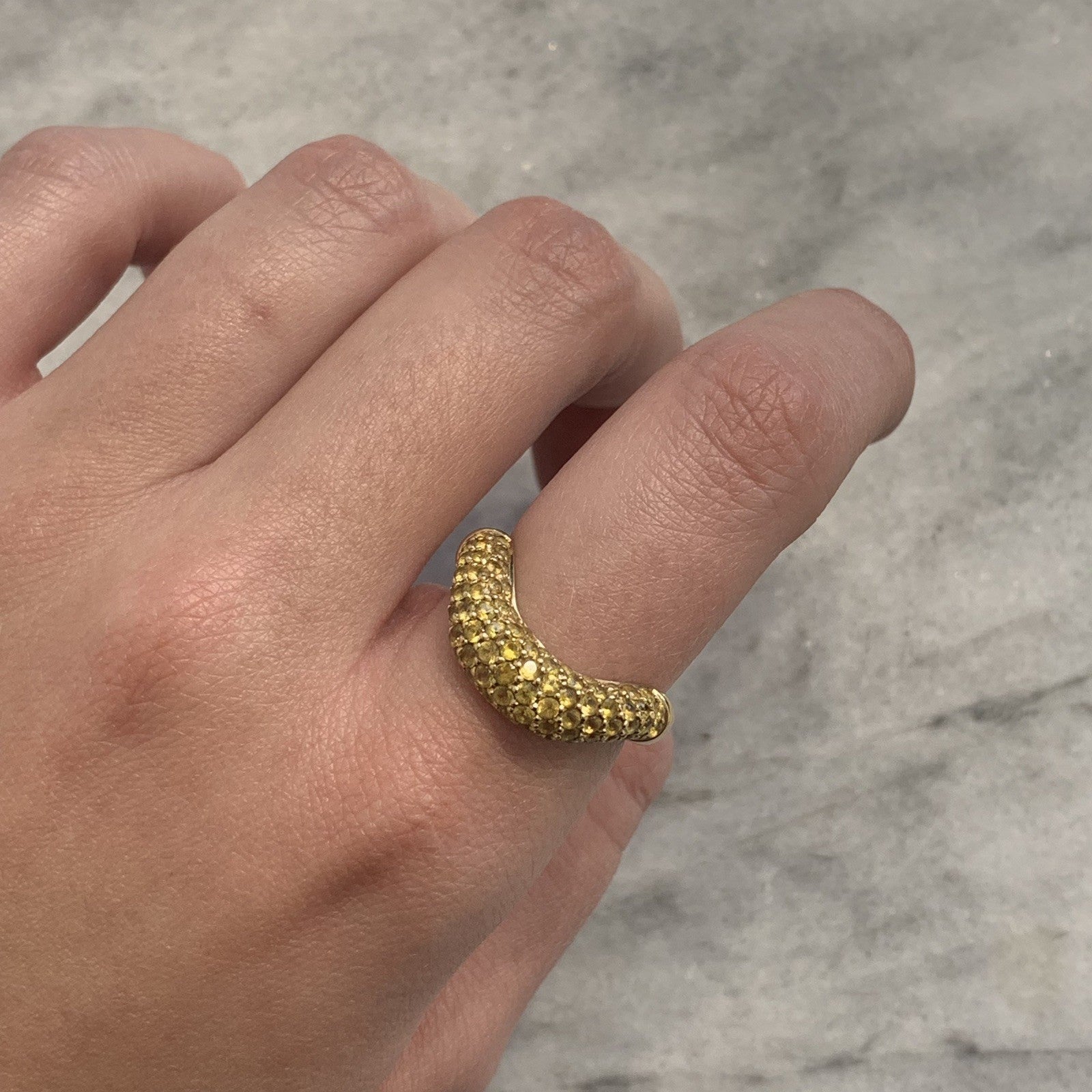A beautifully crafted 18ct gold ring in a curved wishbone shape with a pave-set collection of vibrant yellow sapphire gemstones.
