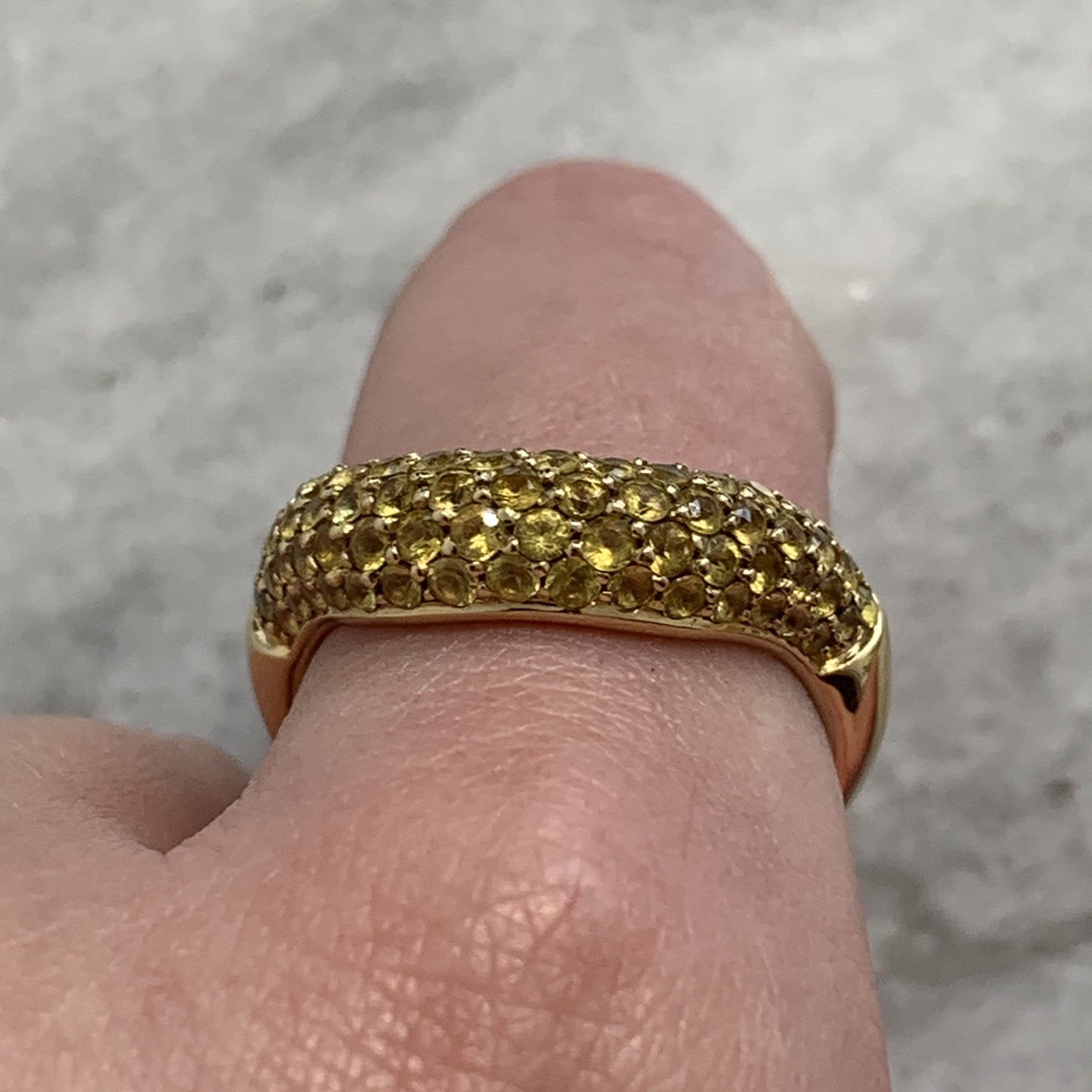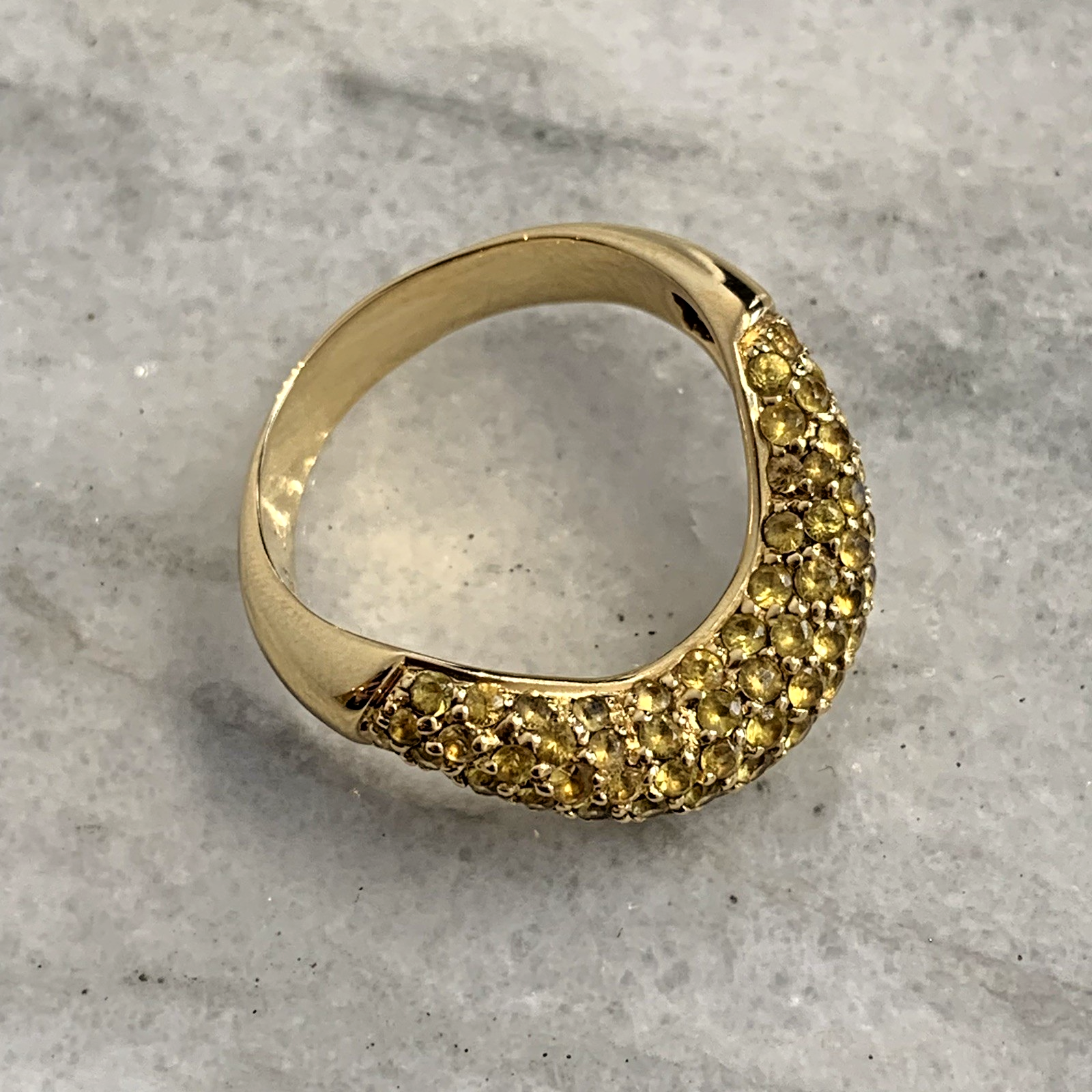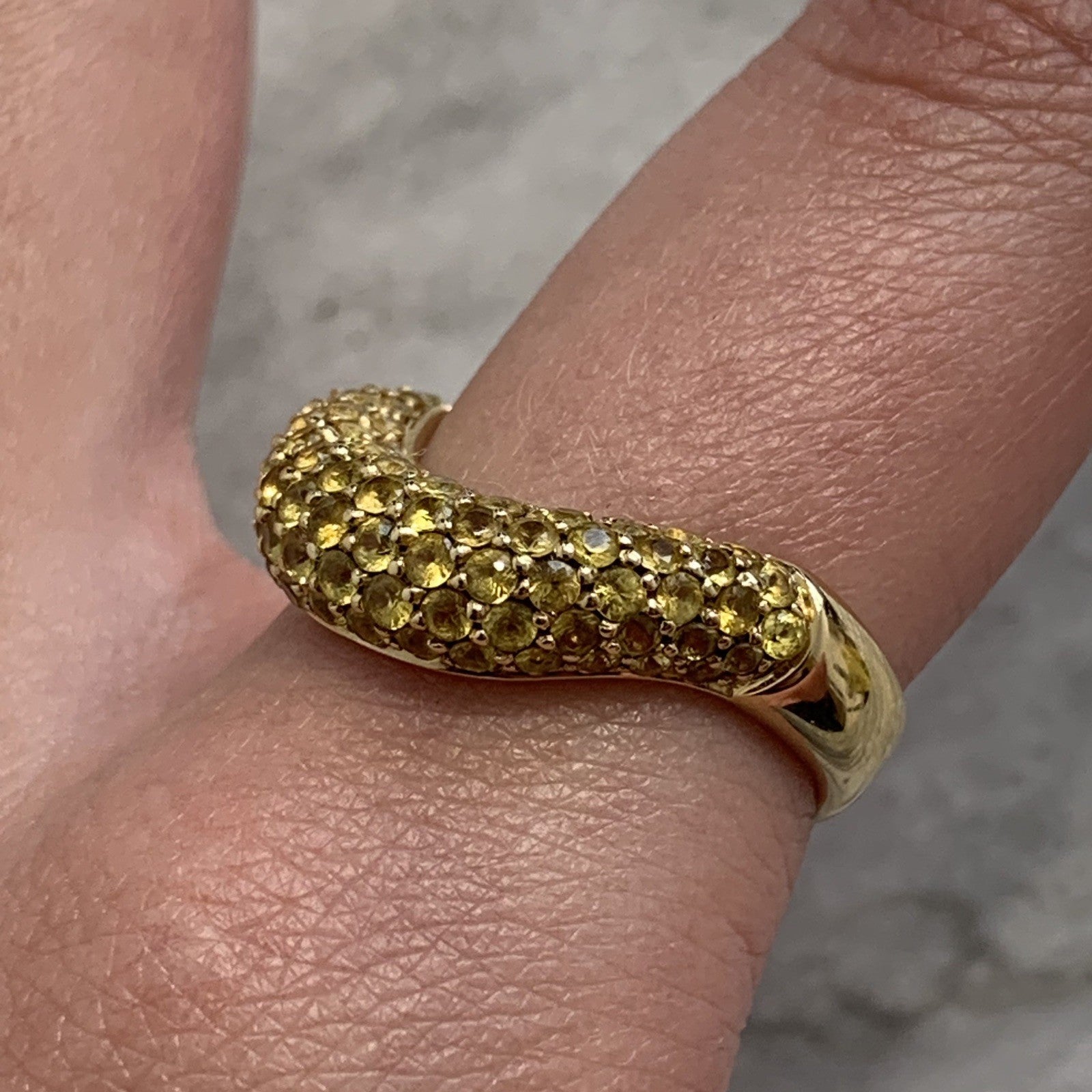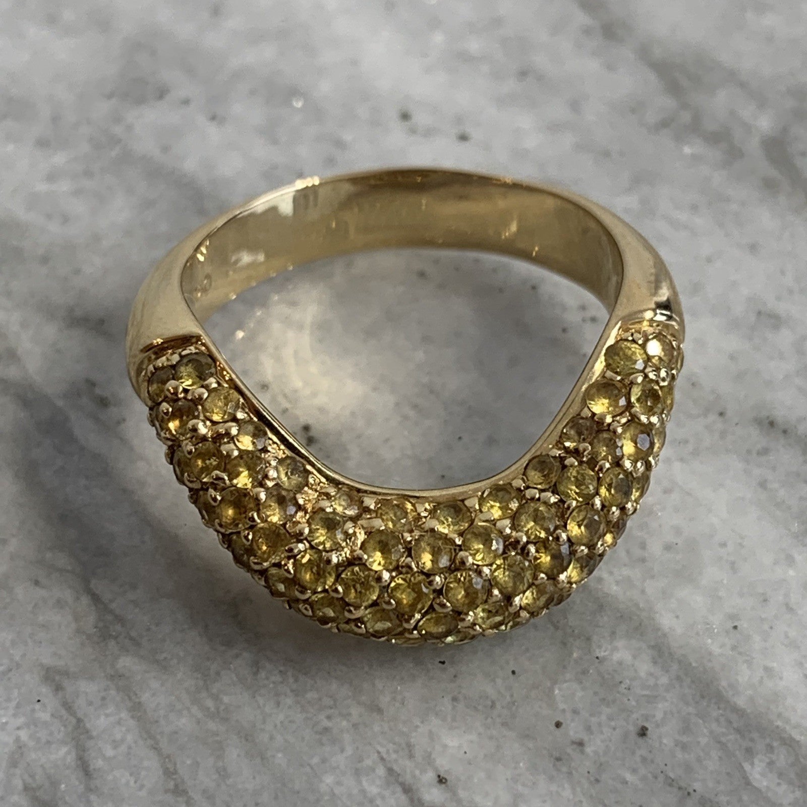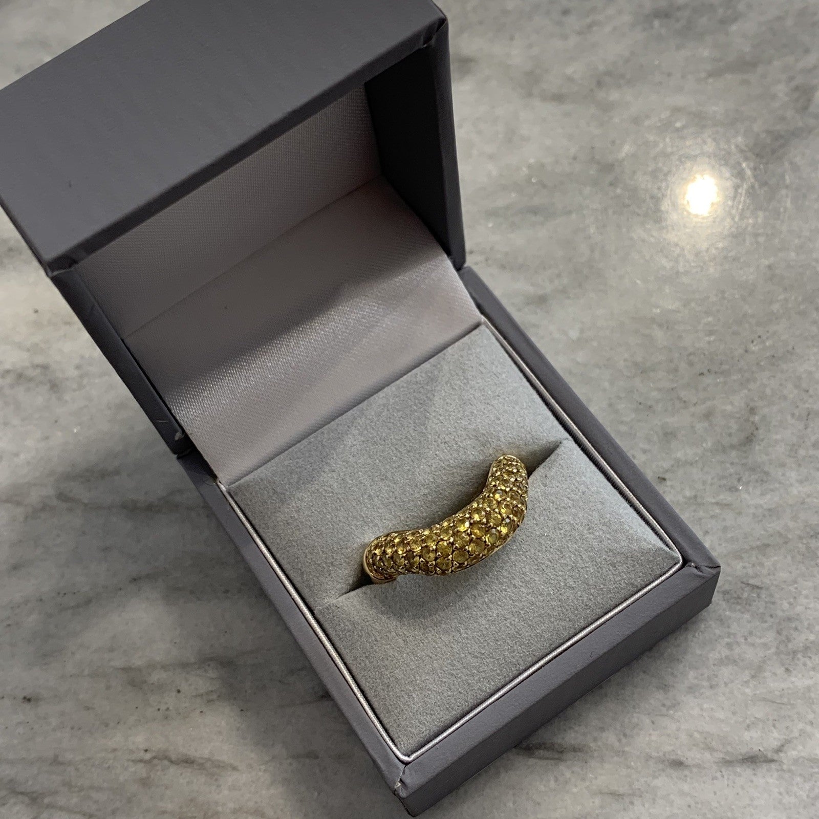 A beautifully crafted 18ct gold ring in a curved wishbone shape with a pave-set collection of vibrant yellow sapphire gemstones.