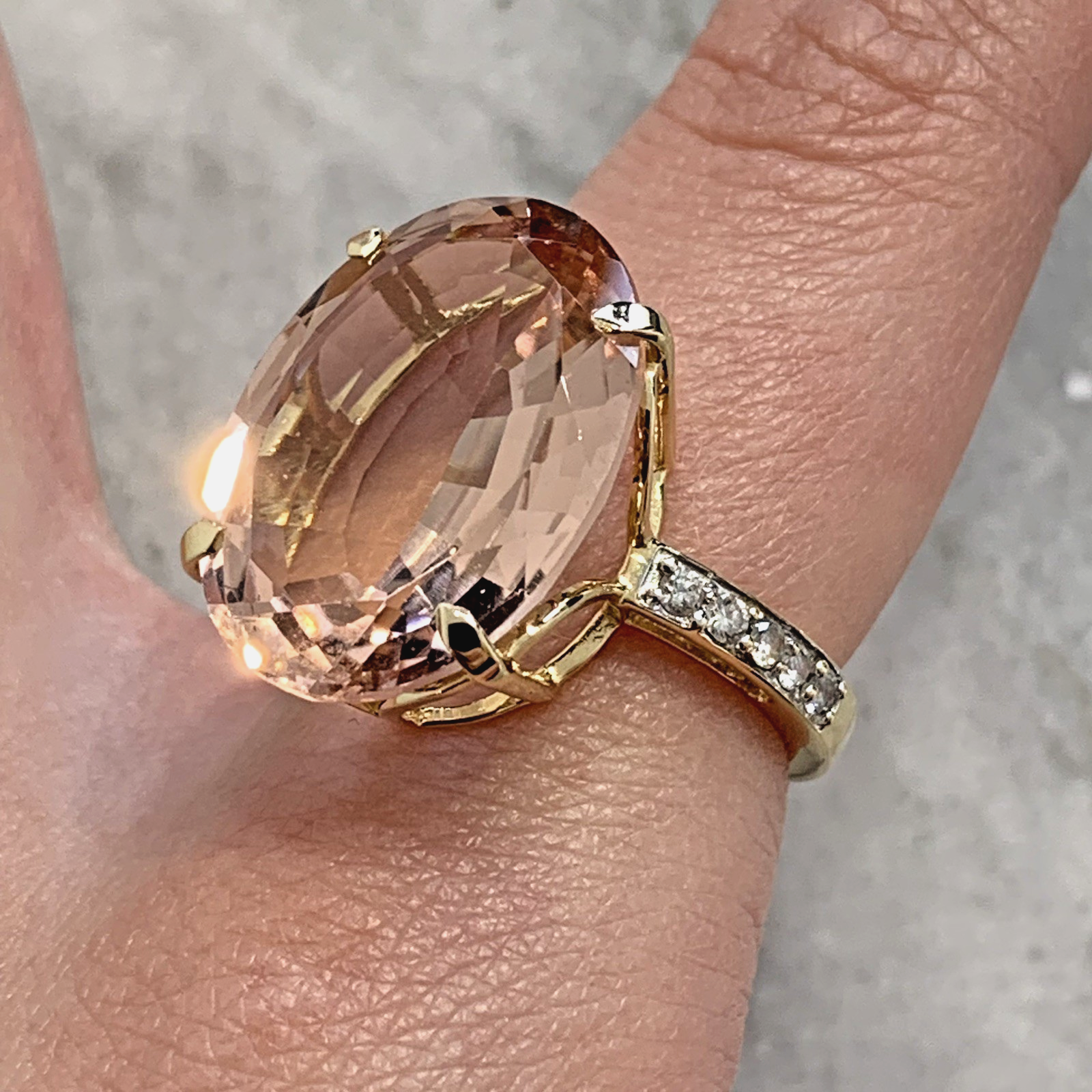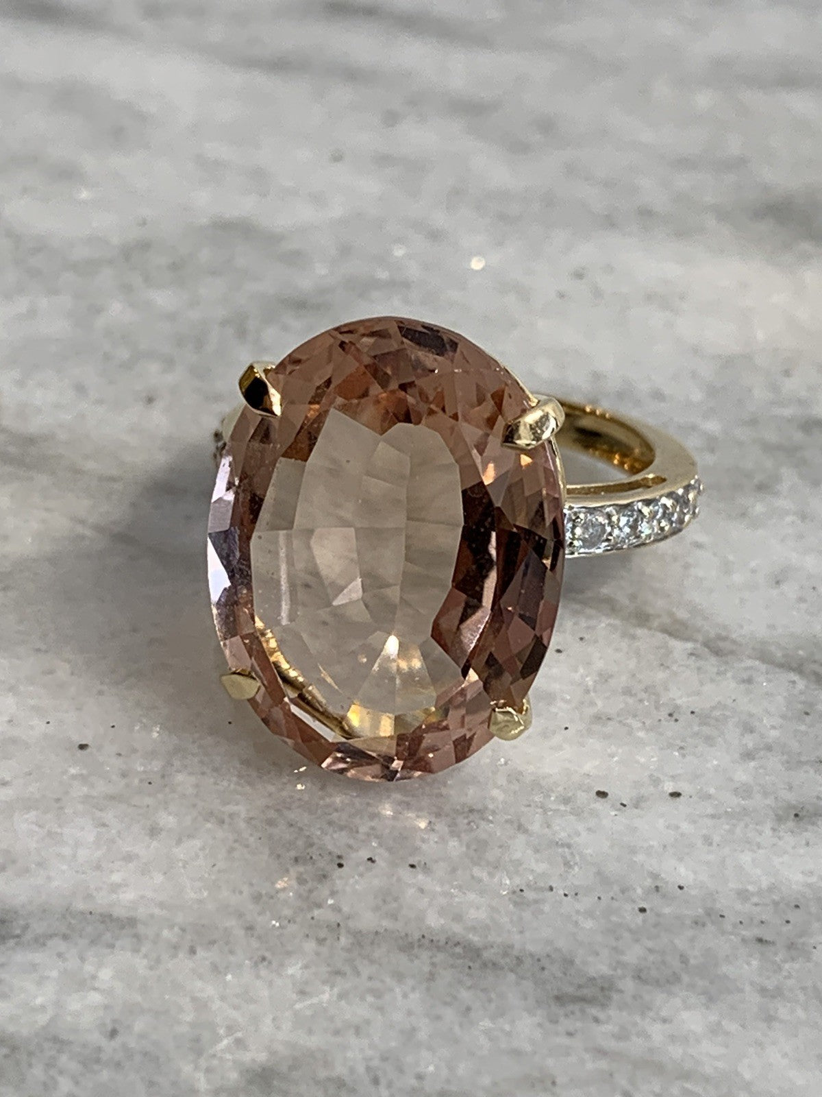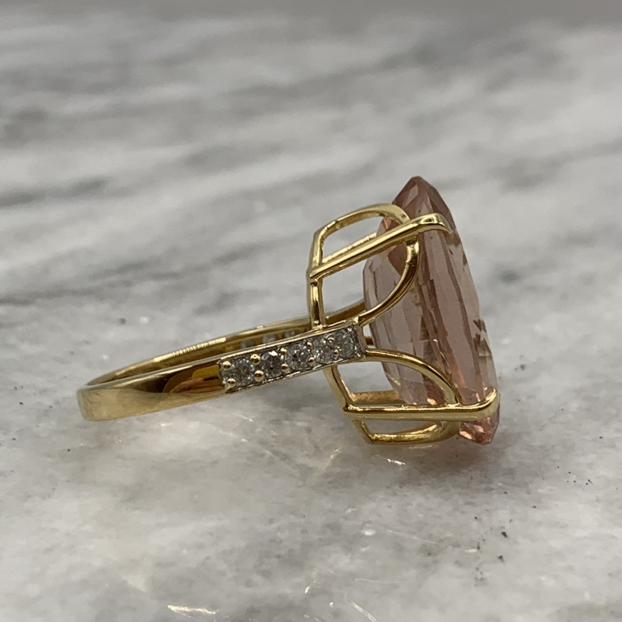 A stunning gold cocktail ring featuring an ornate oval cut morganite at approximately 12.5ct, accented by five round brilliant diamonds to each shoulder. Hallmarked and in excellent condition.