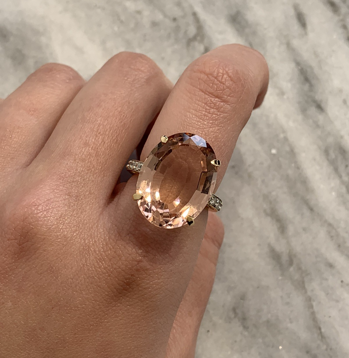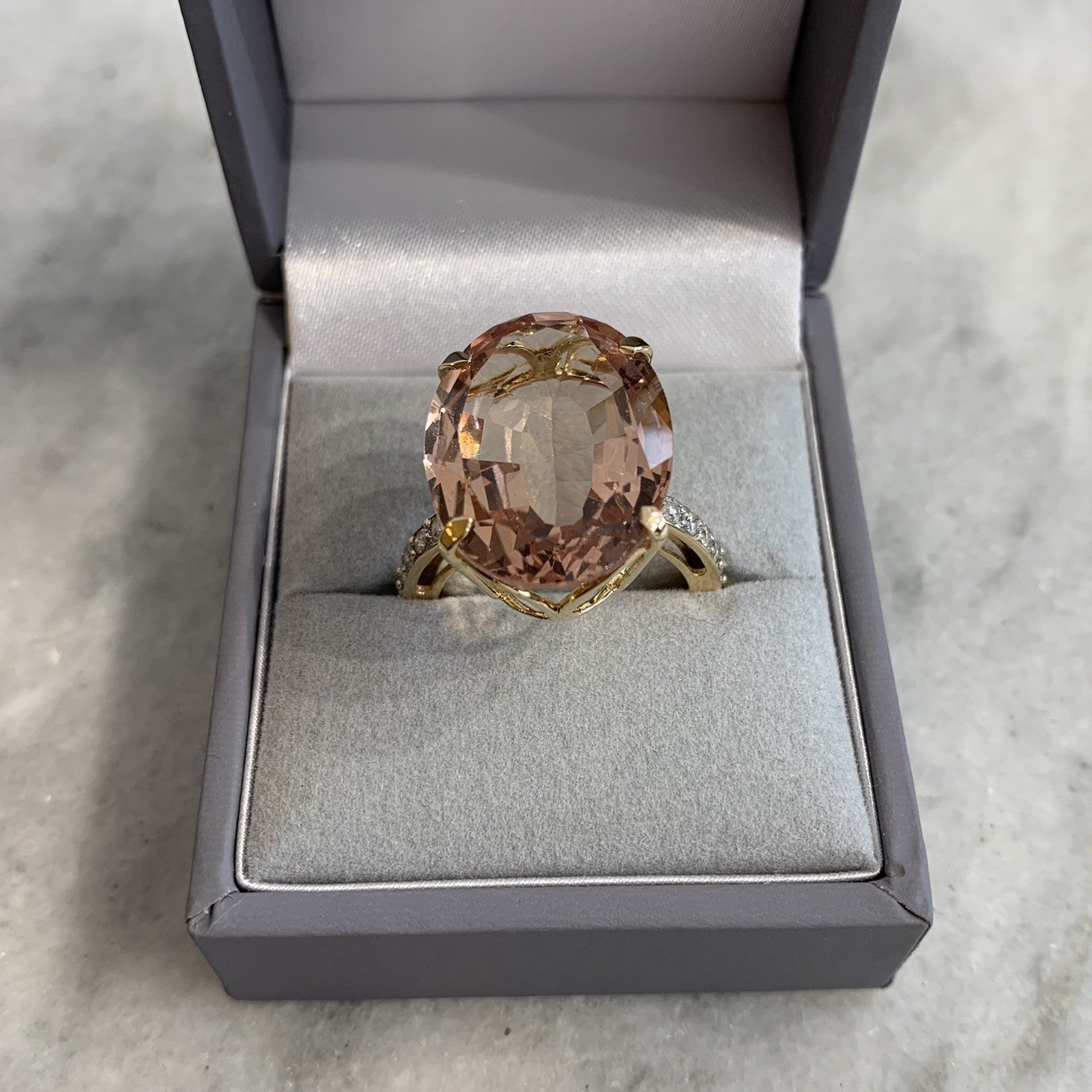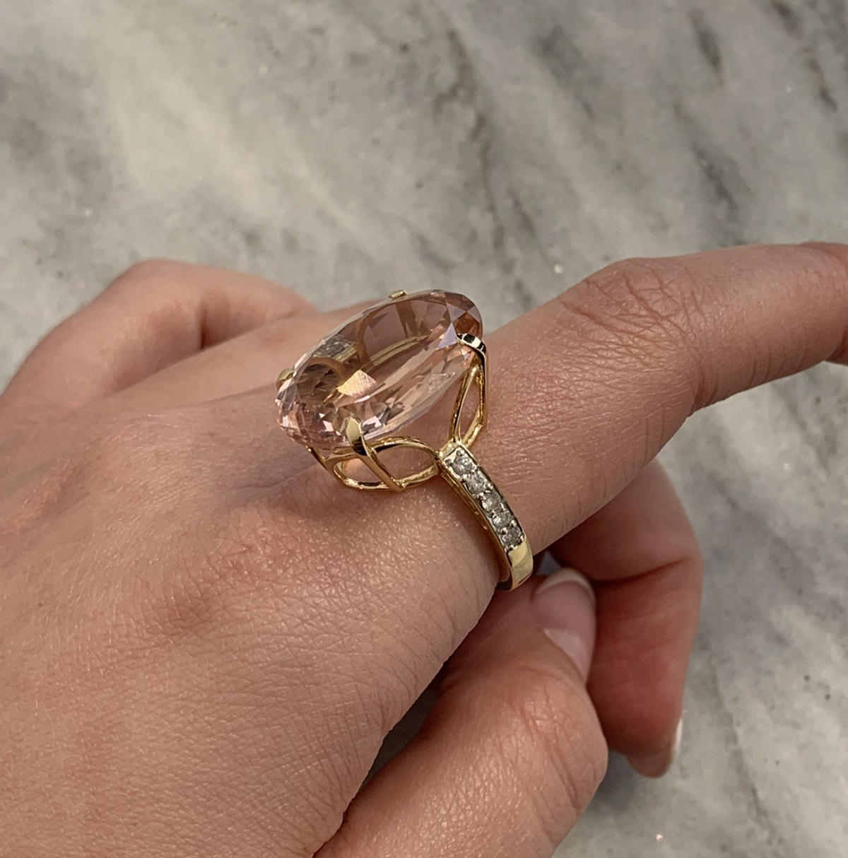 A stunning gold cocktail ring featuring an ornate oval cut morganite at approximately 12.5ct, accented by five round brilliant diamonds to each shoulder. Hallmarked and in excellent condition.