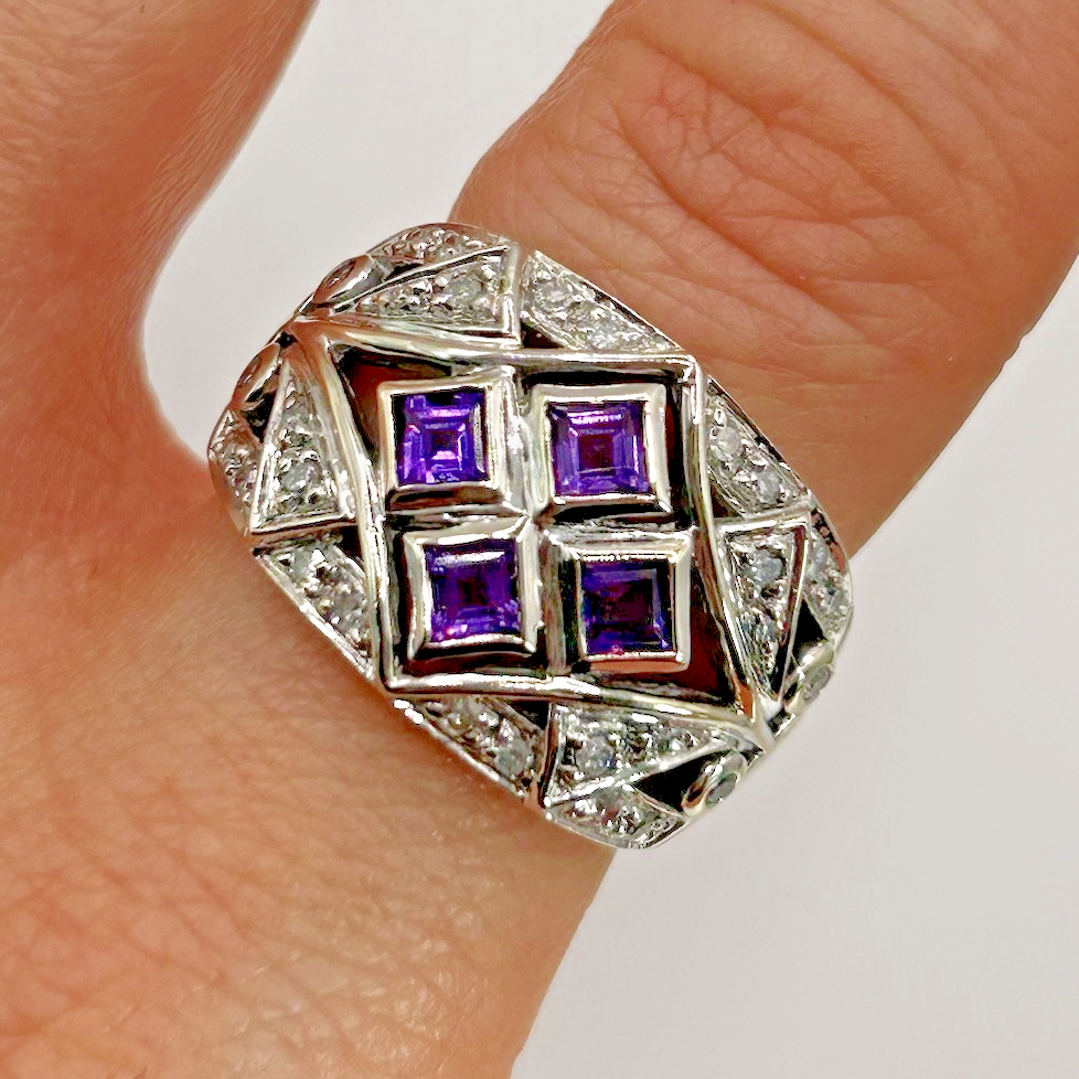 A beautifully ornate chunky white gold band ring showcasing a quartet of princess cut amethysts in a bezel setting, accented by a collection of petite pave set diamonds adorning the shoulders.
