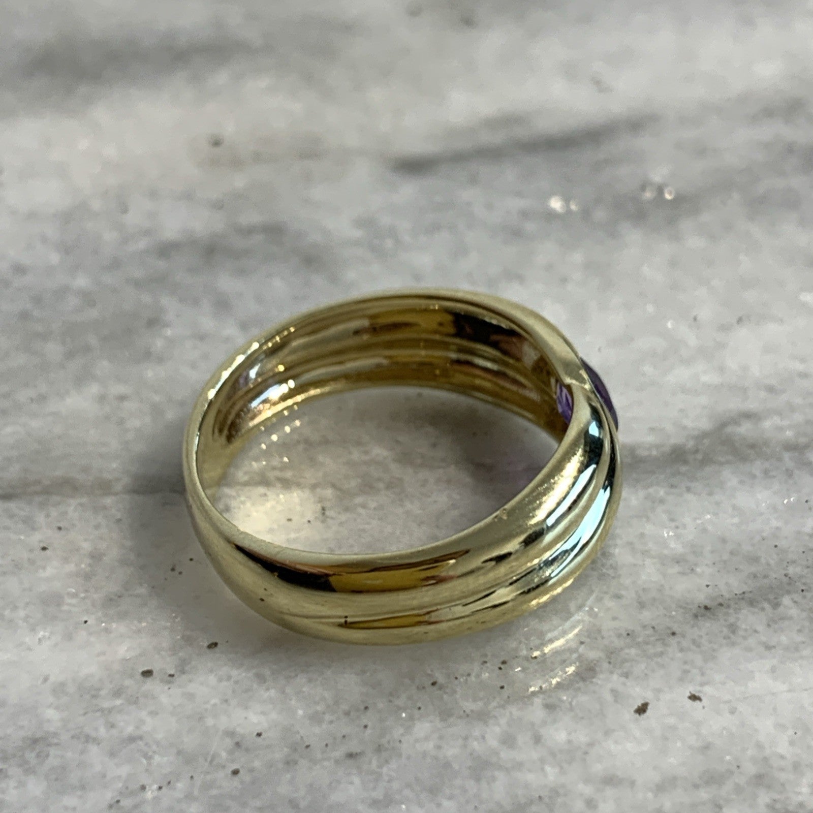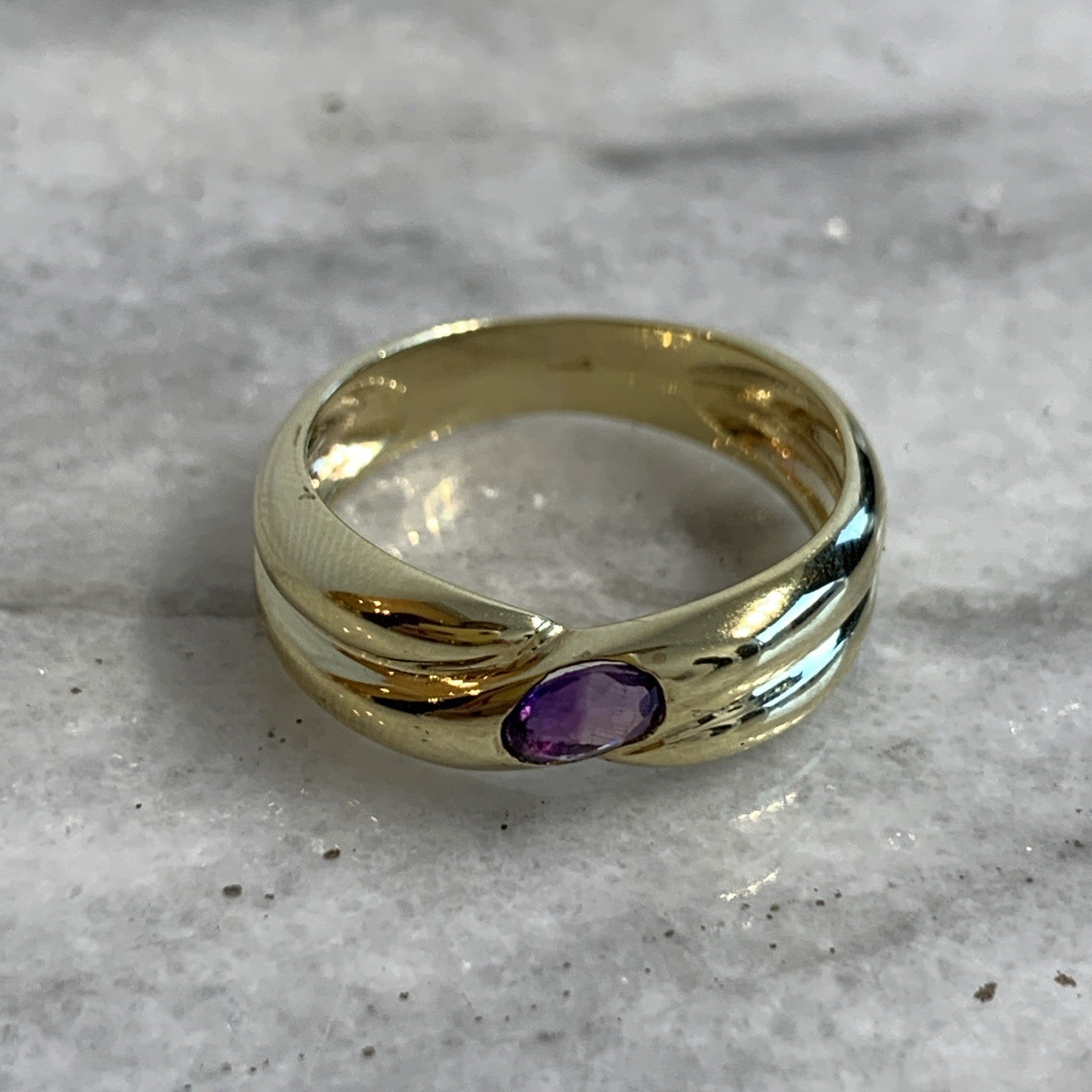 - A gorgeous gold crossover twist style band ring featuring a flush set amethyst.
