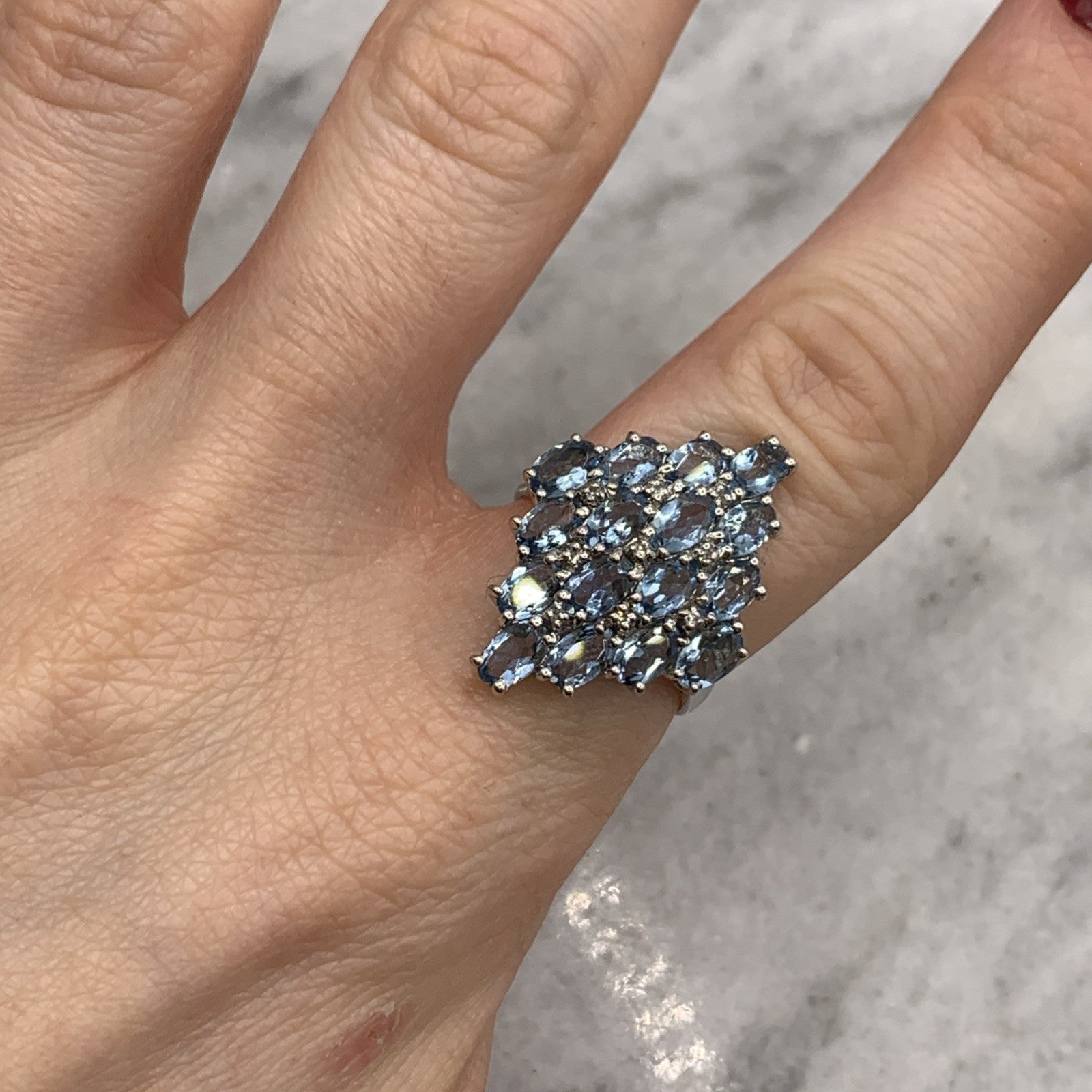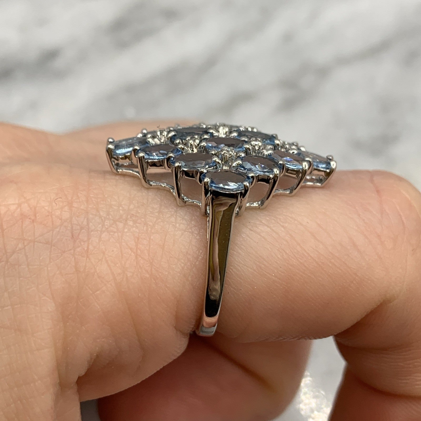 A stunning white gold cocktail ring showcasing a cluster of oval cut aquamarine and petite diamonds.
