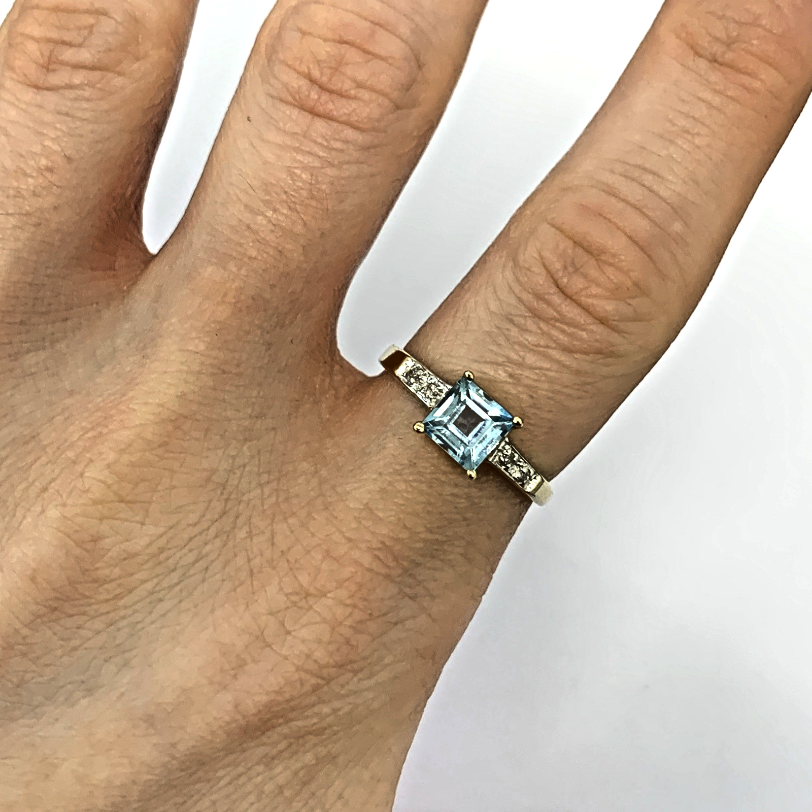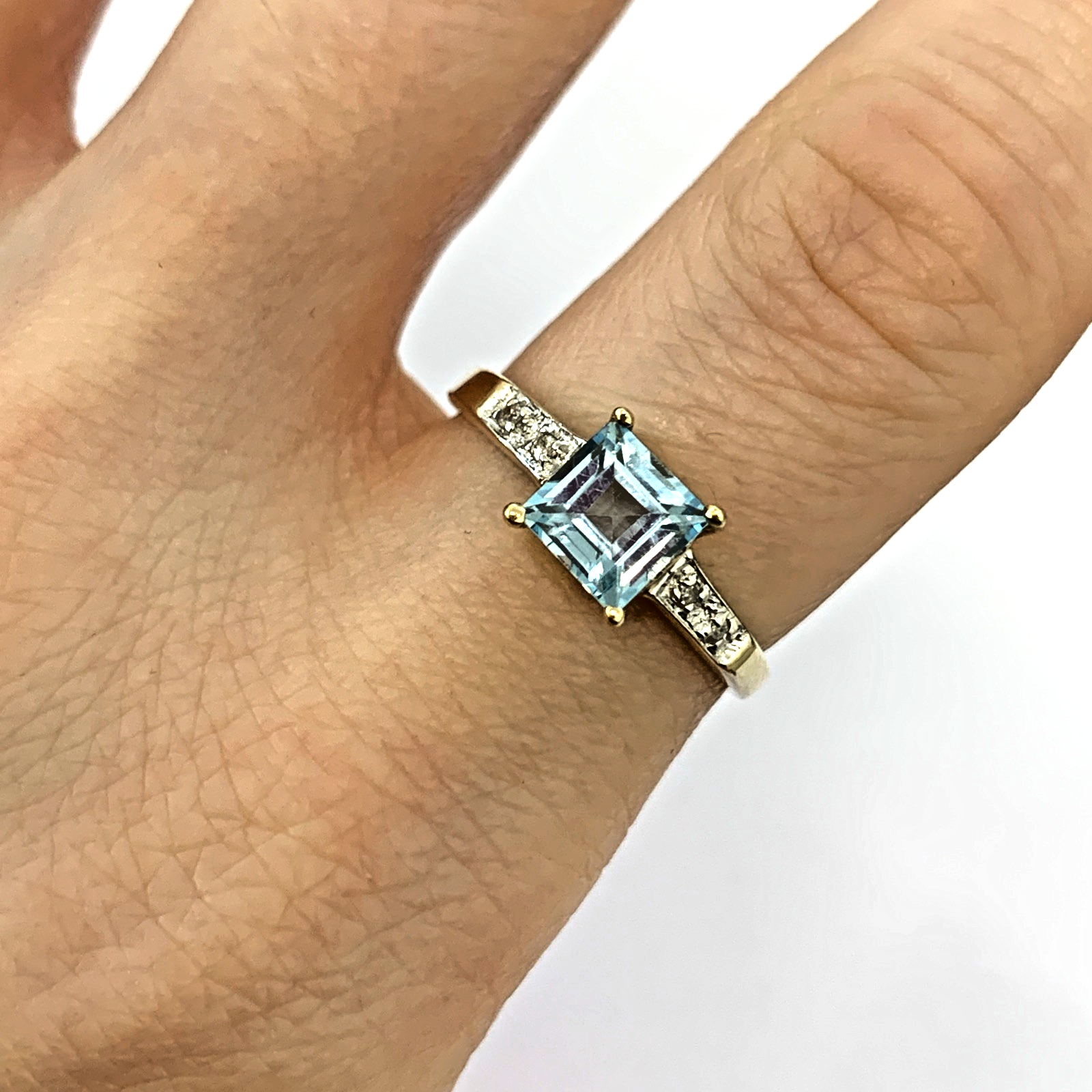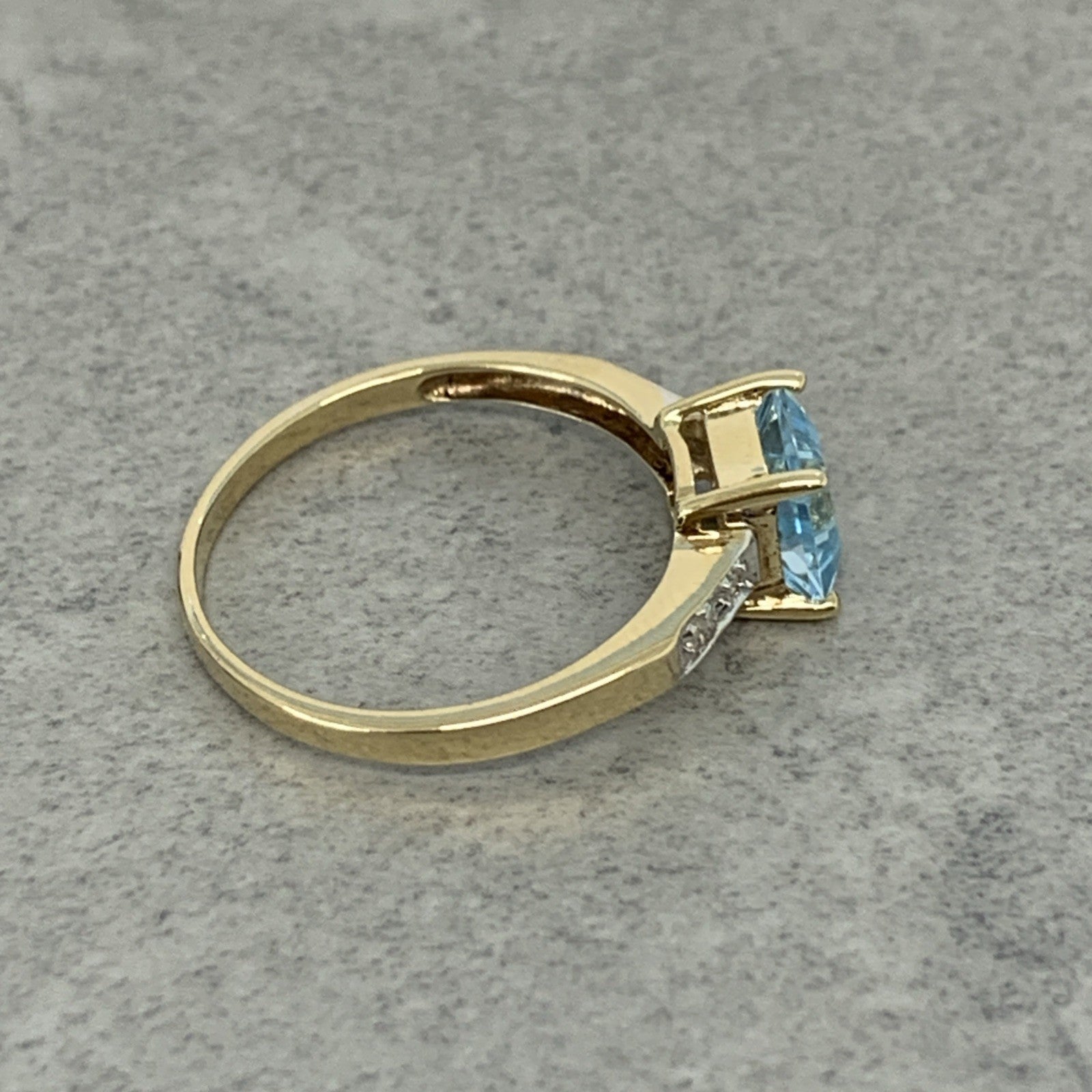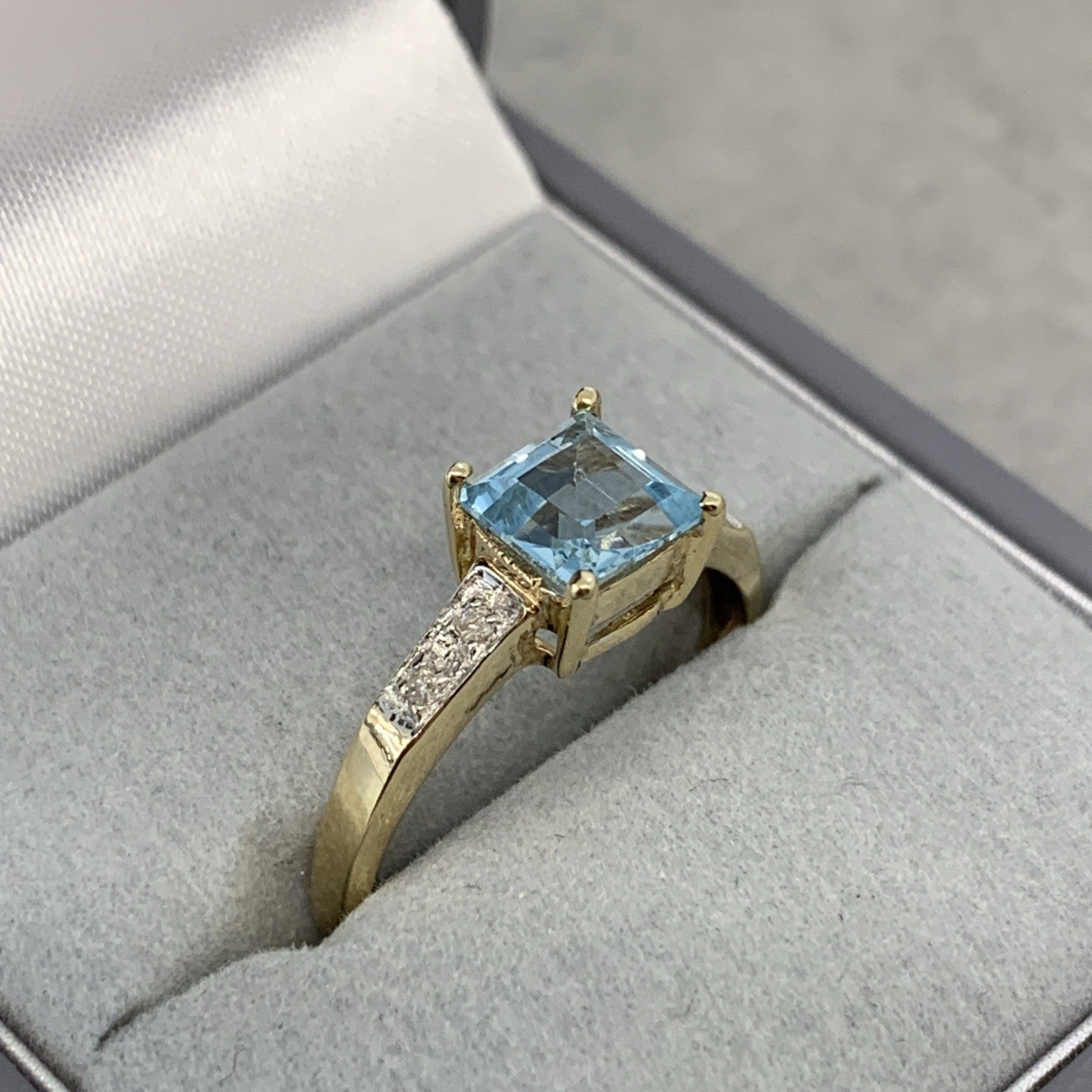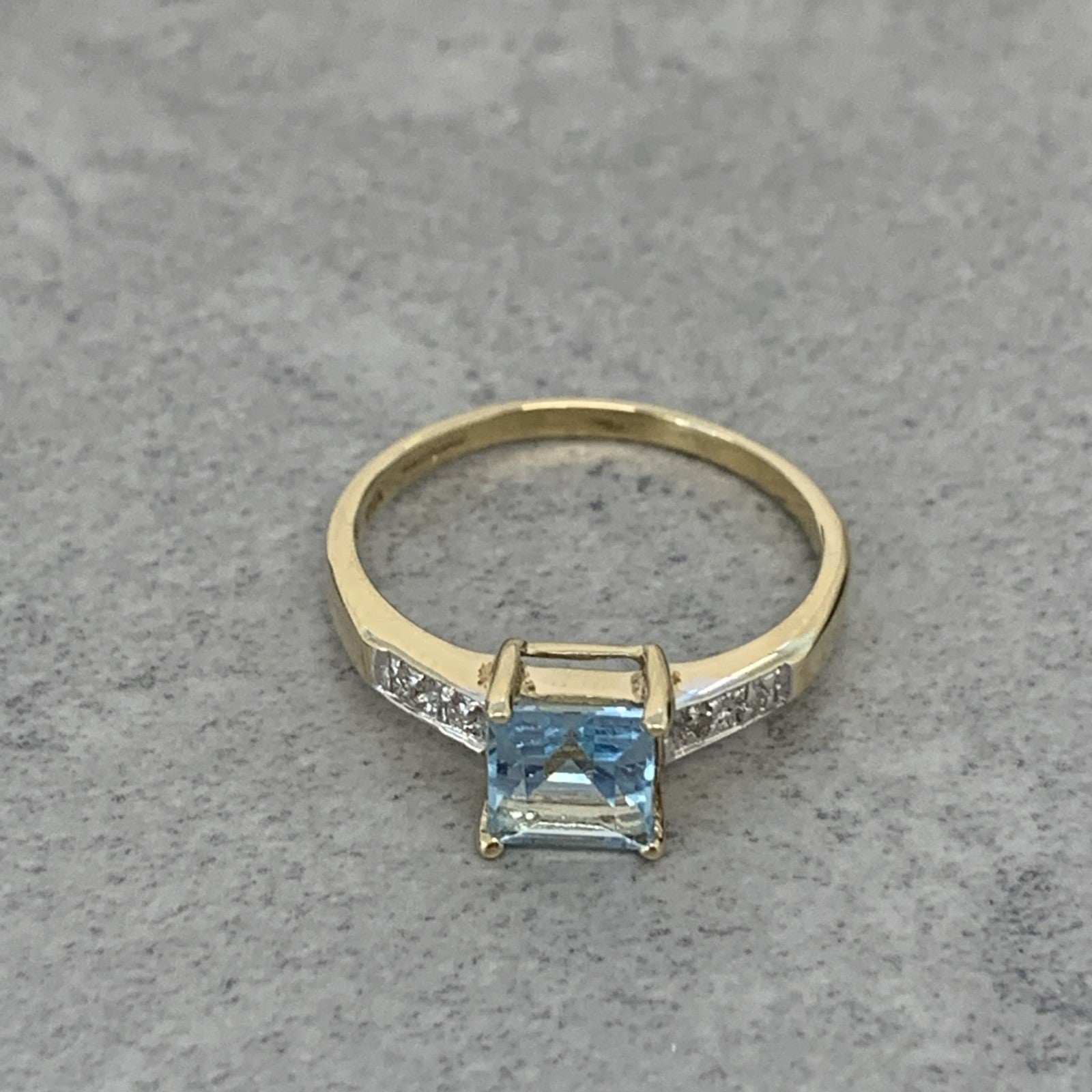 9 ct Gold Blue Topaz Princess Cut Diamond Ring 9k 375 Yellow Gold - Size O 1/2