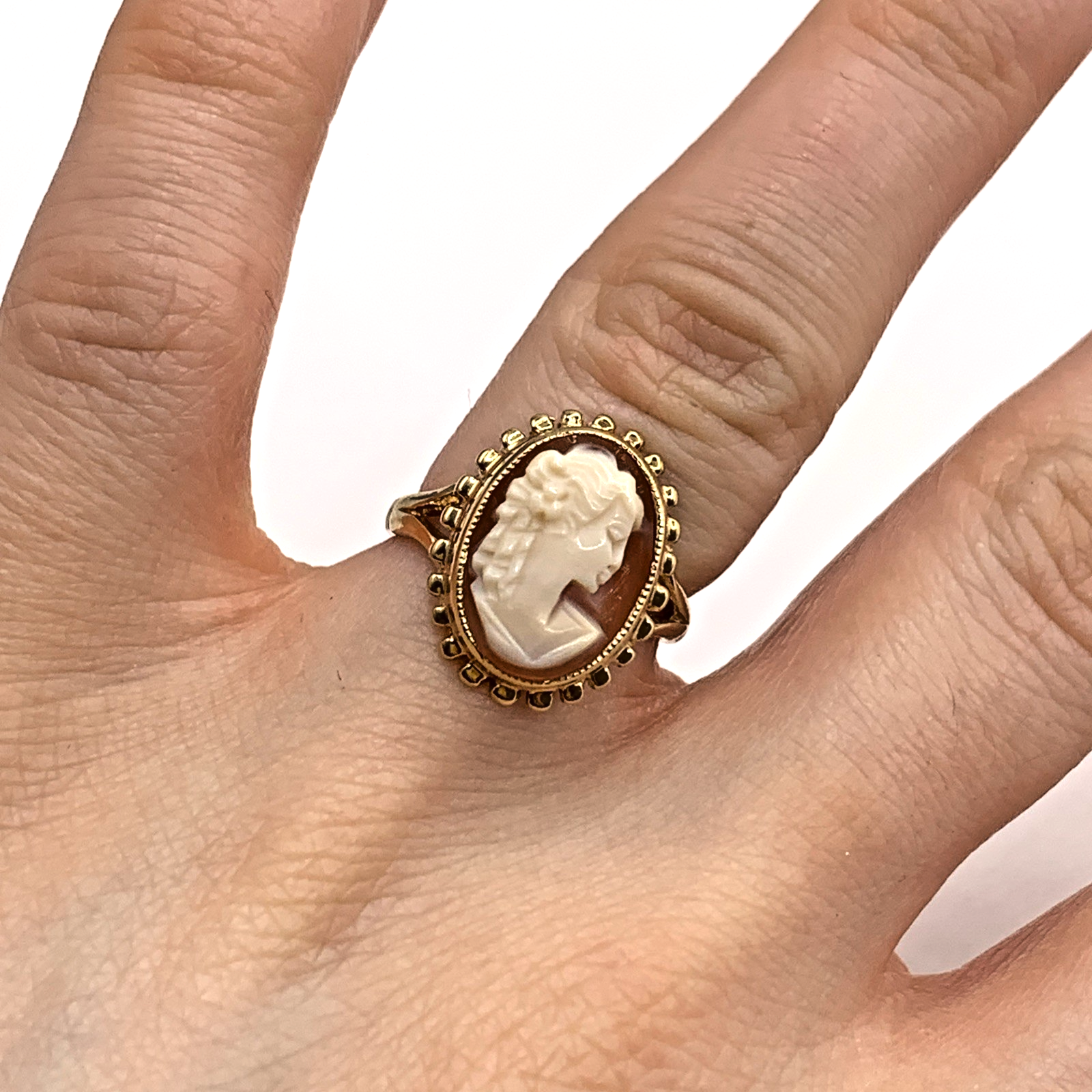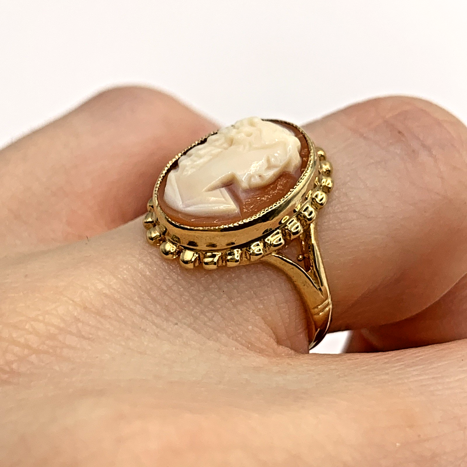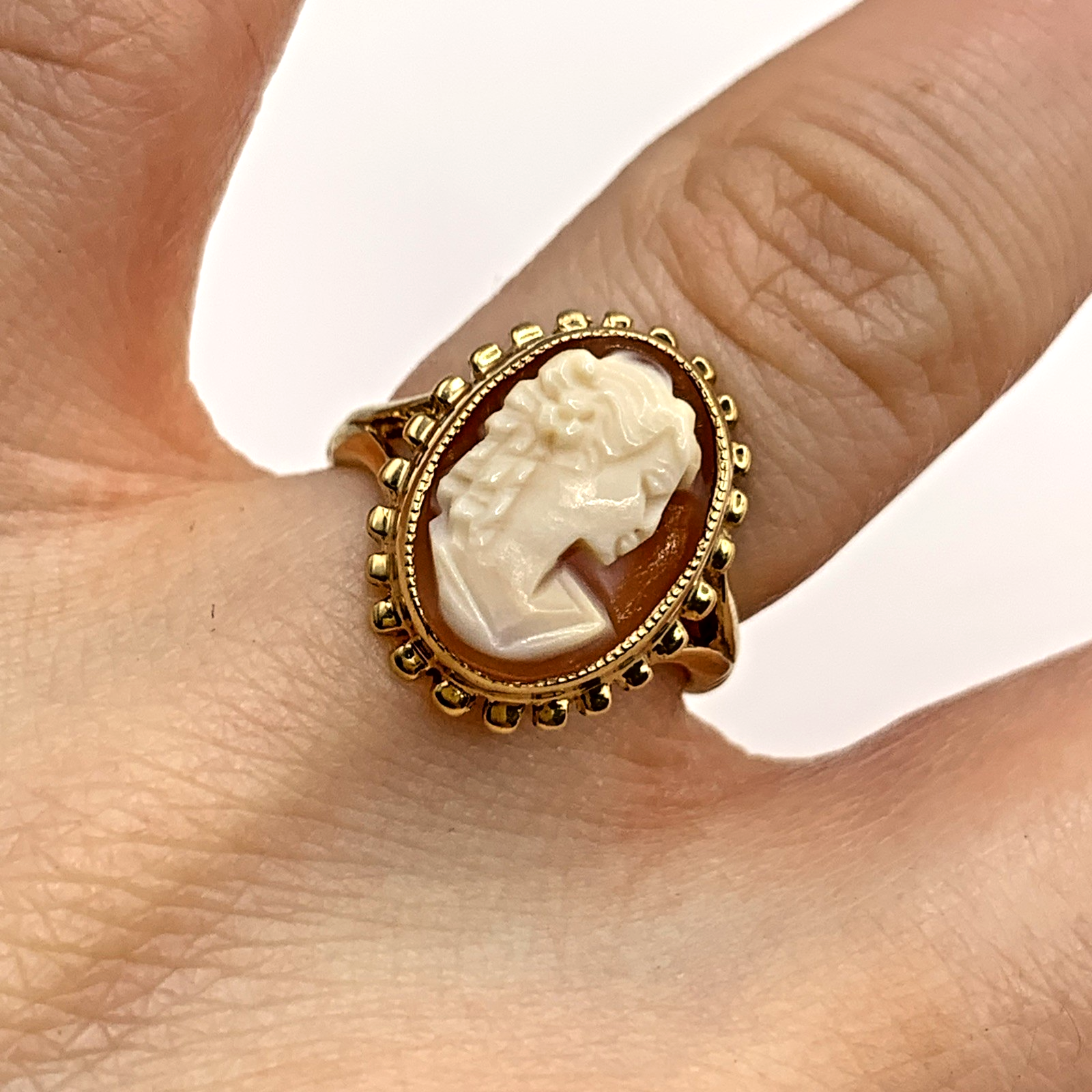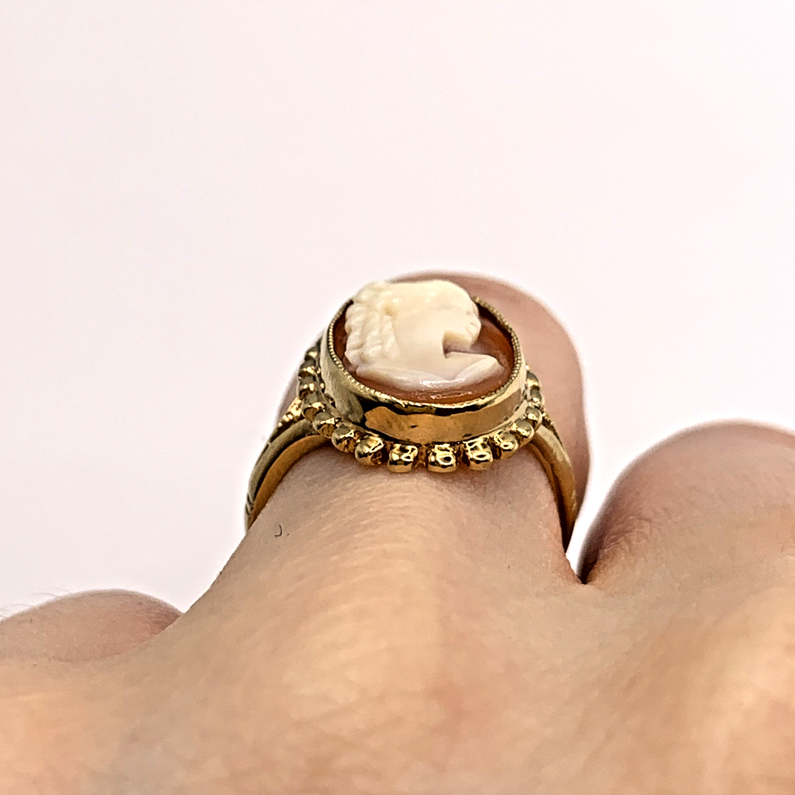 A stunning gold ring showcasing a bezel set cameo.