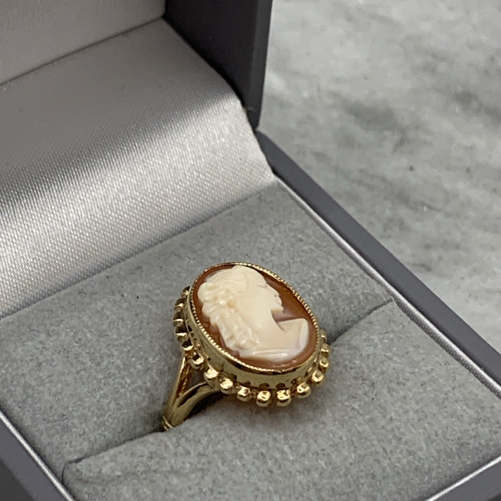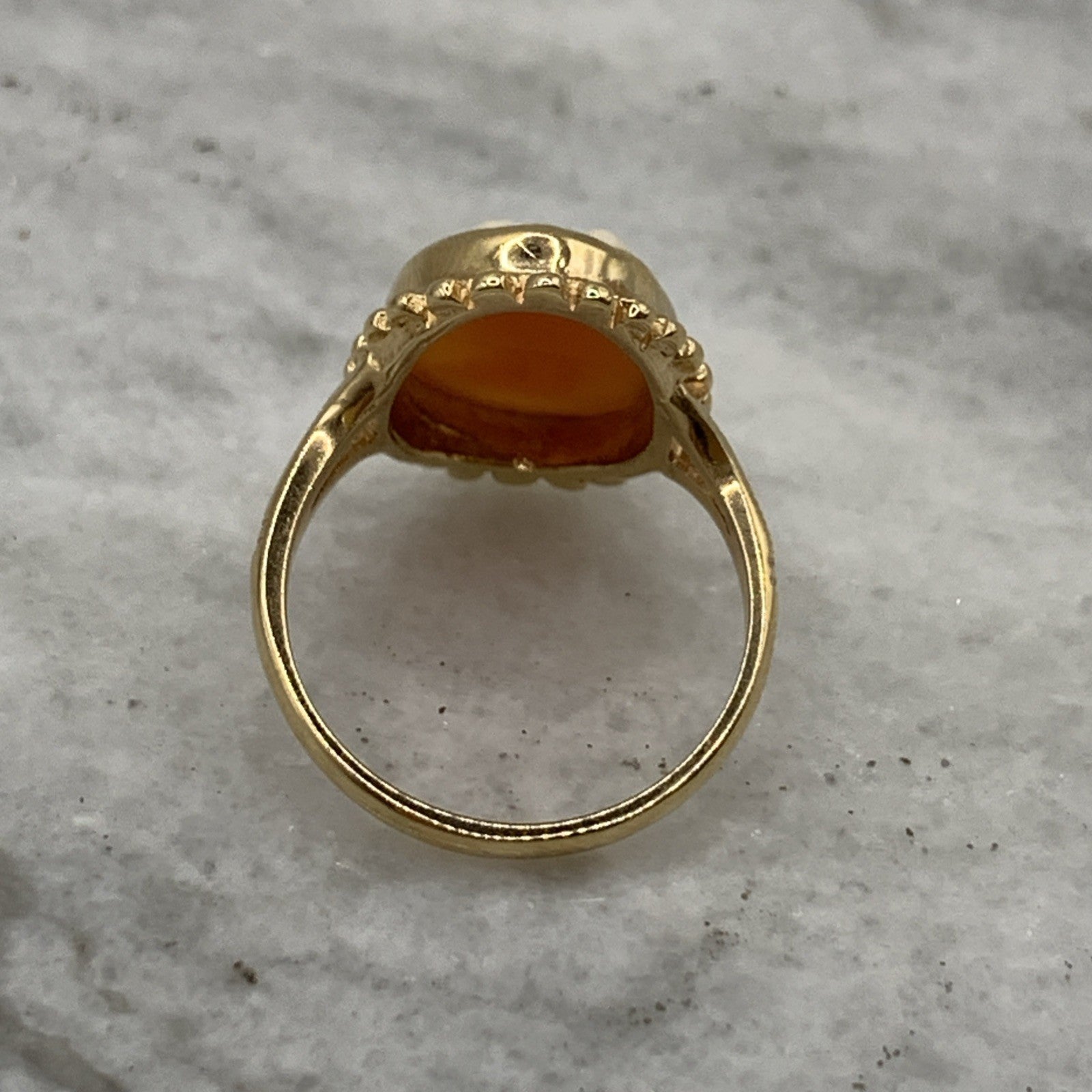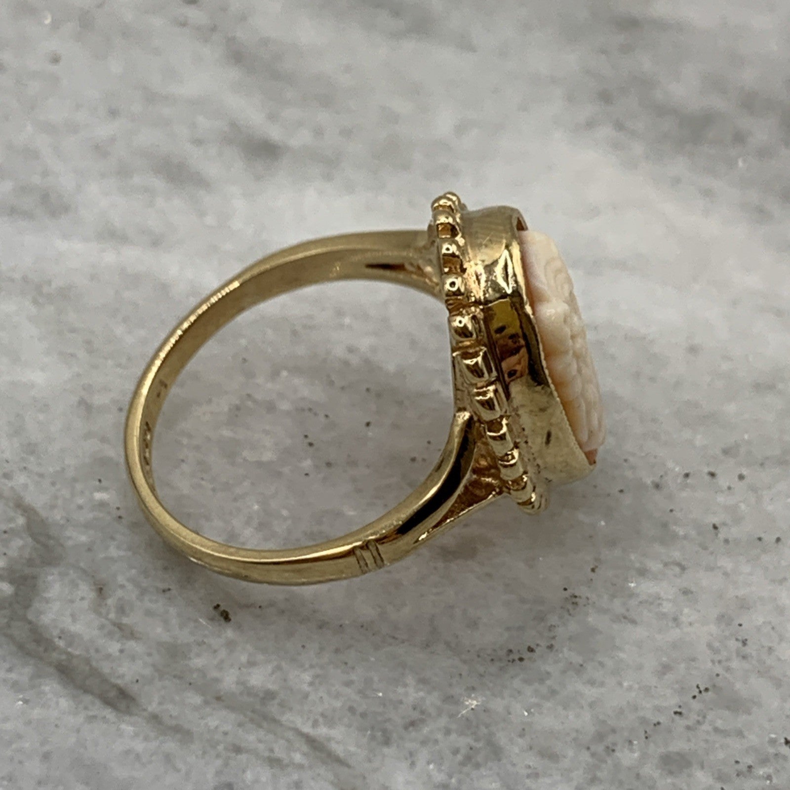 A stunning gold ring showcasing a bezel set cameo.