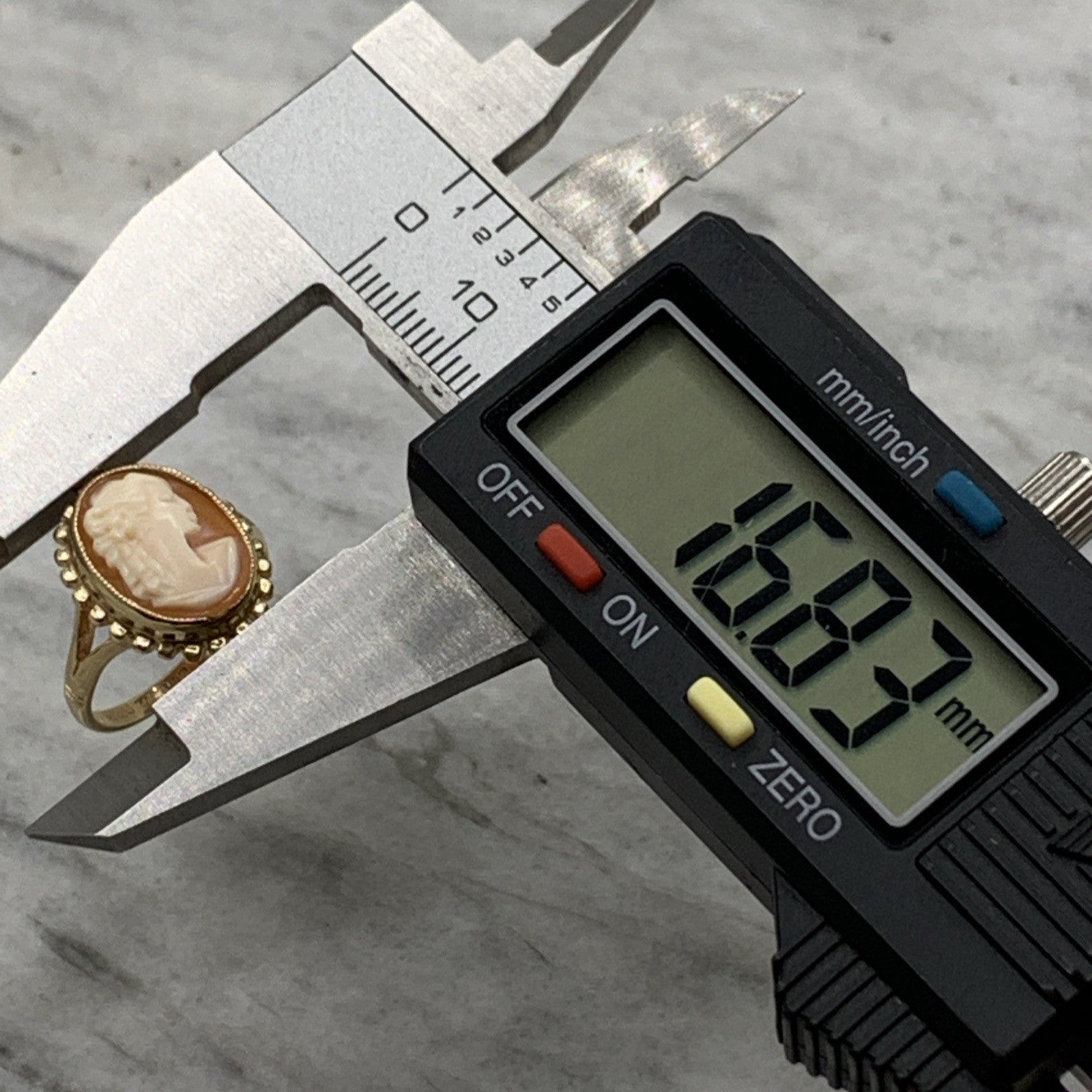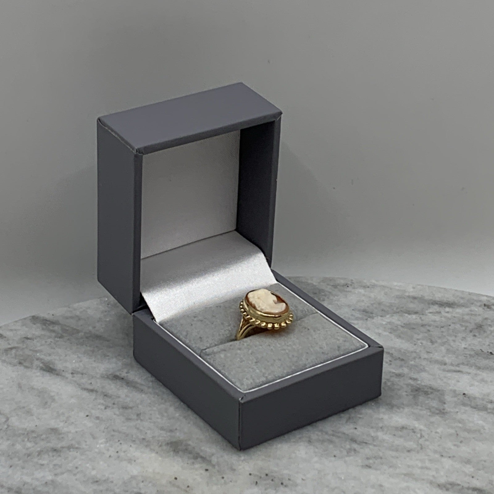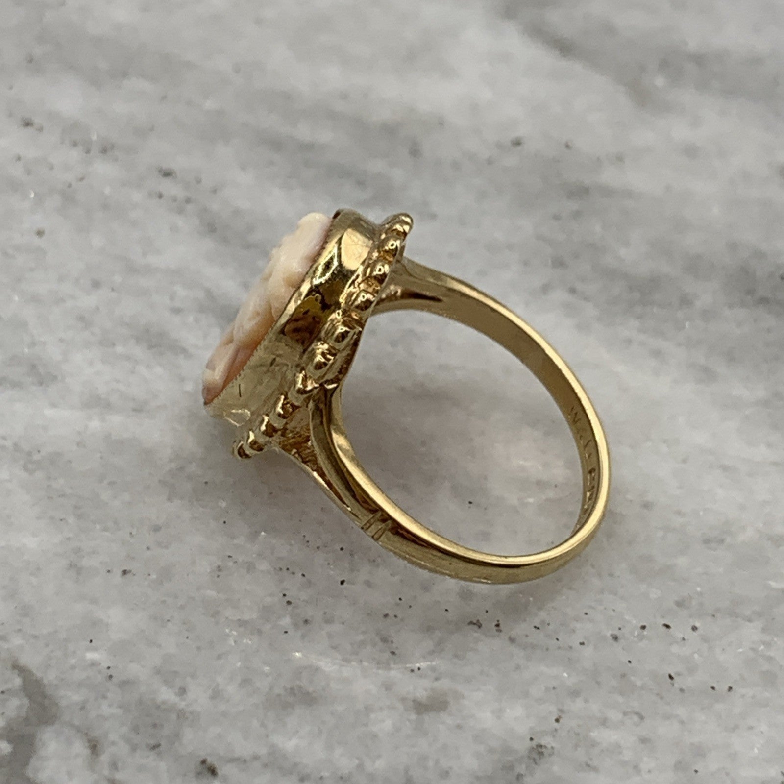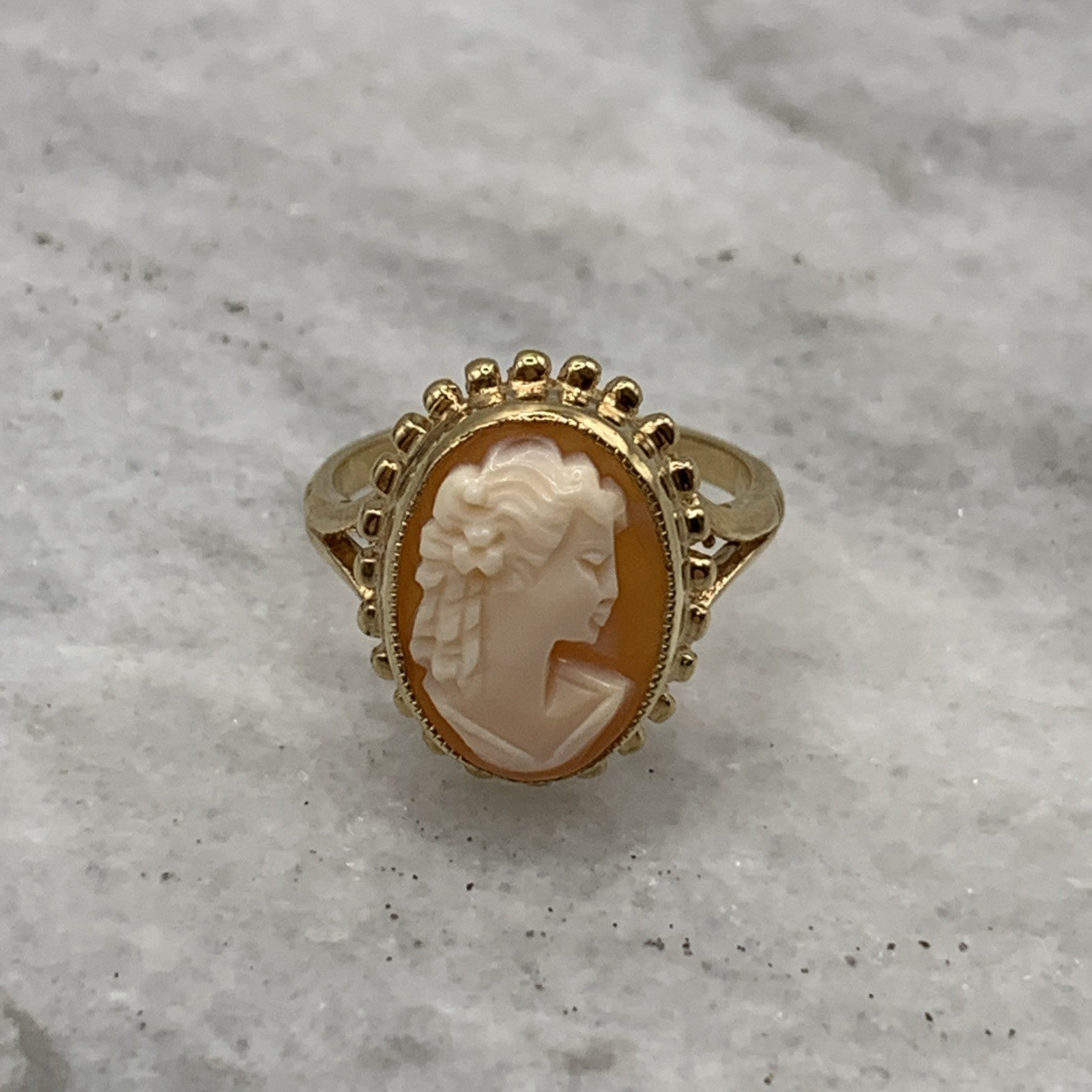 A stunning gold ring showcasing a bezel set cameo.