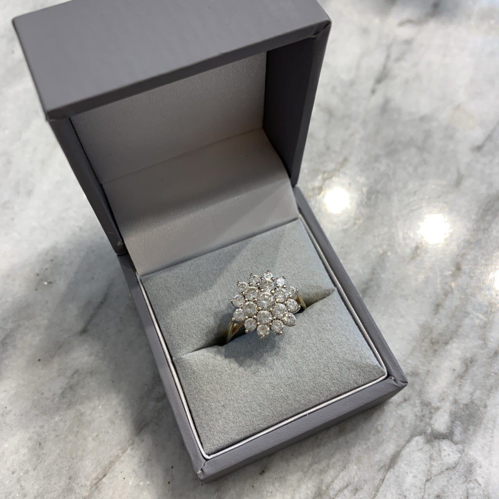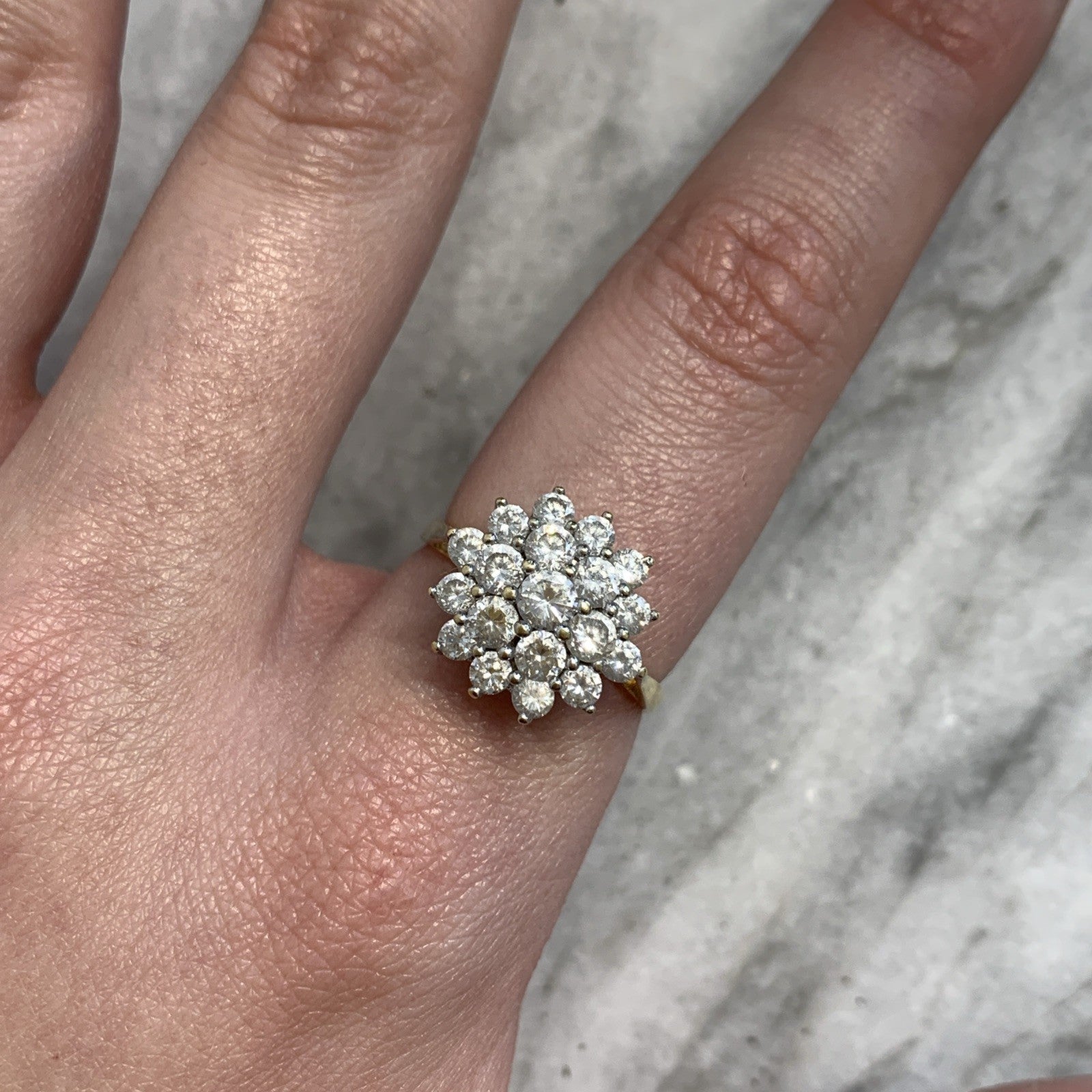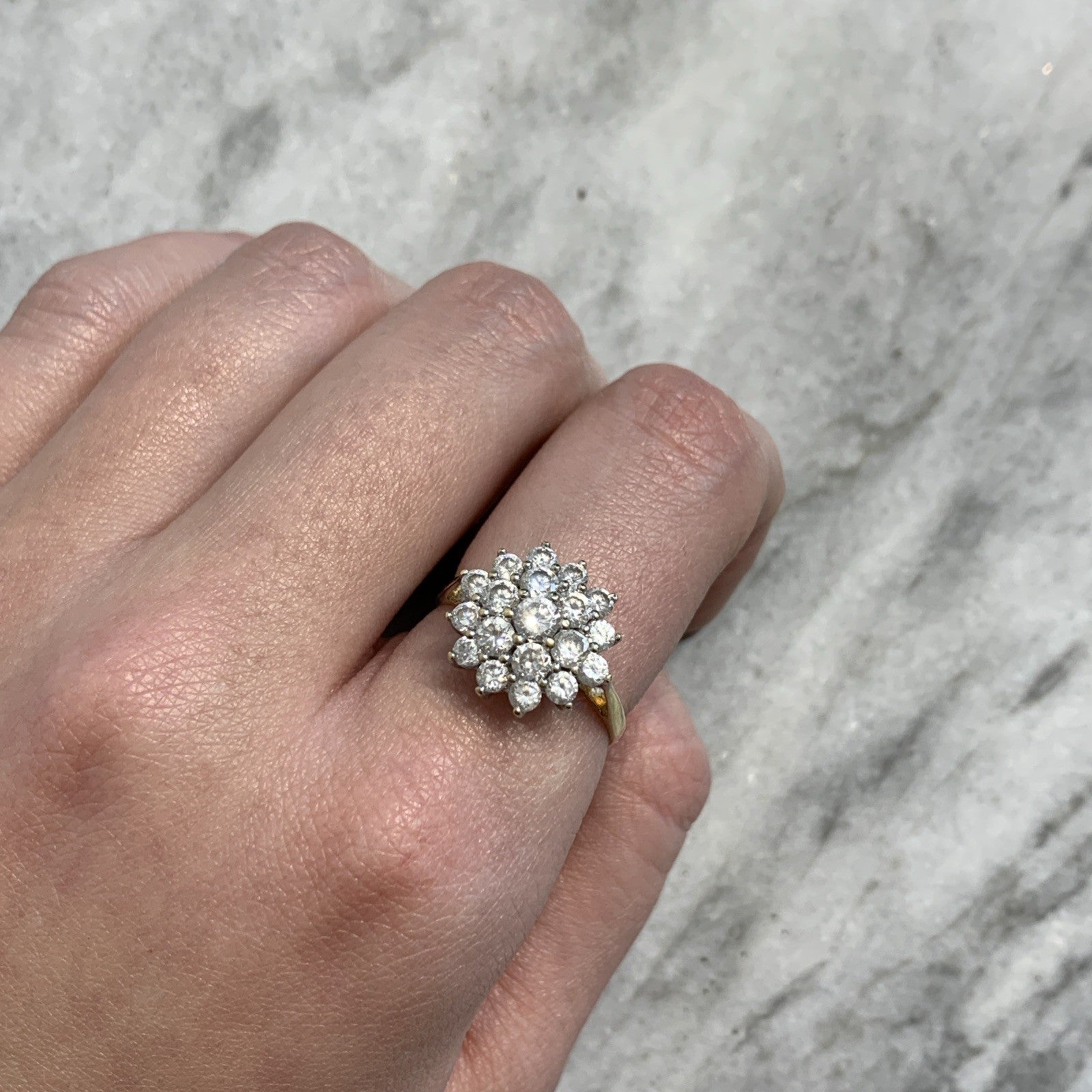 - A charming gold ring featuring a floral cluster of round cut cubic zirconia.