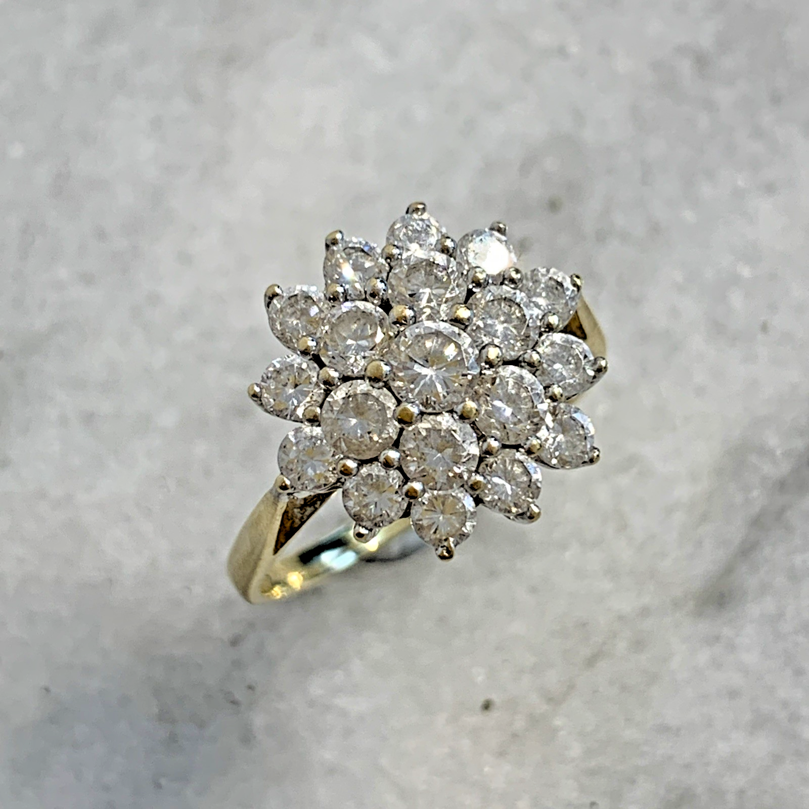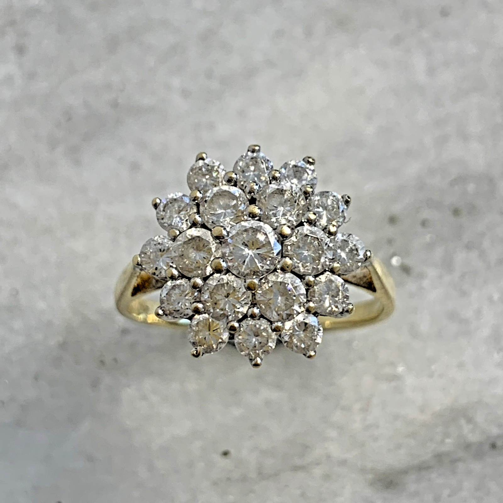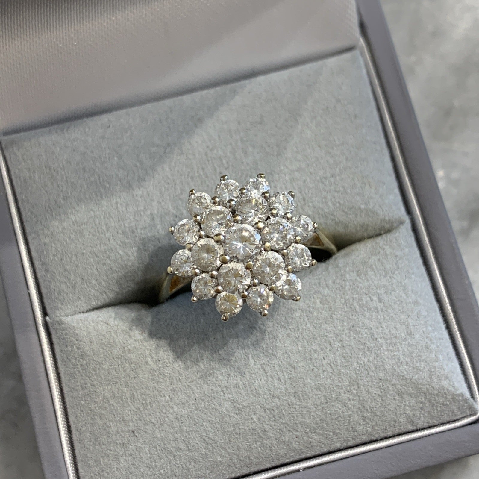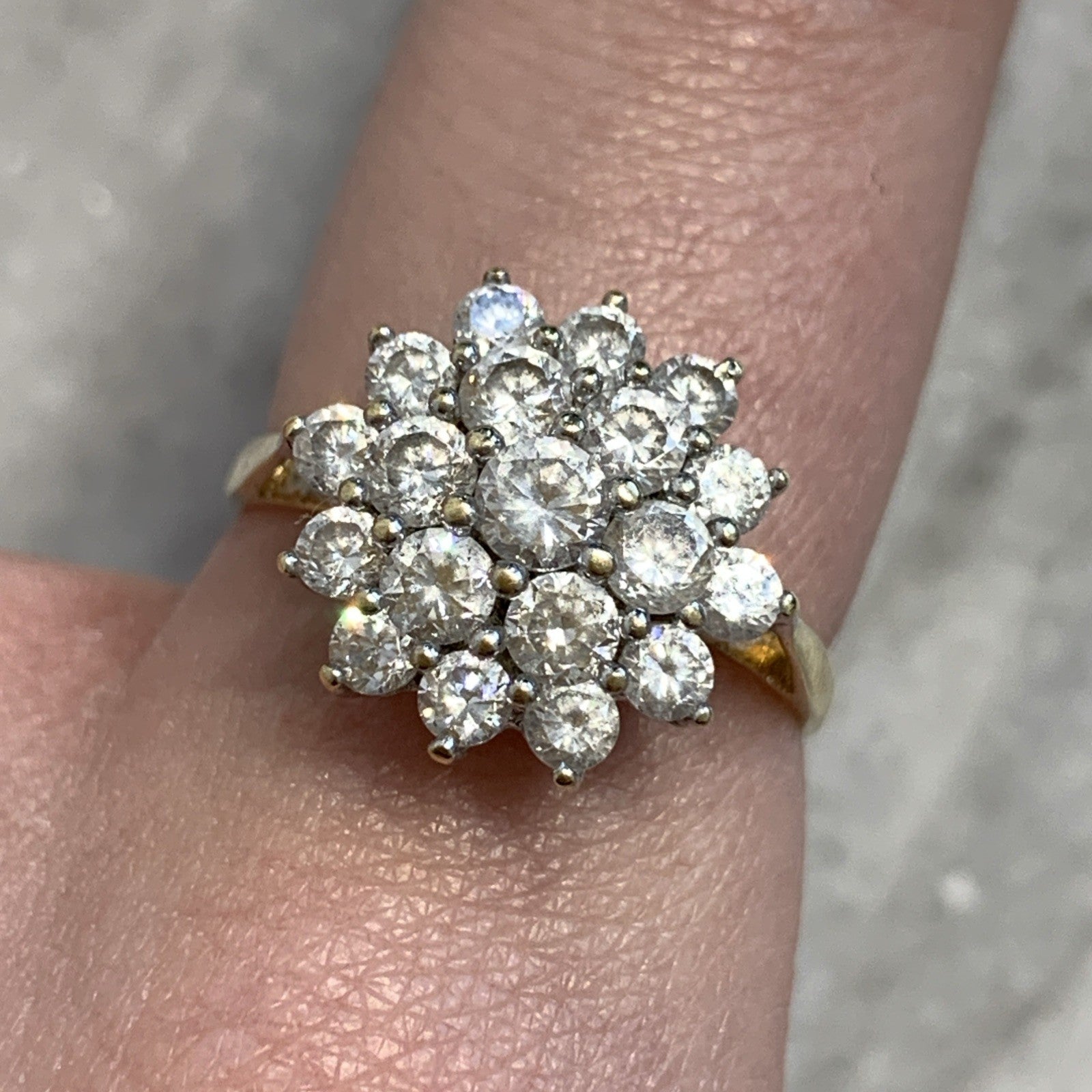 - A charming gold ring featuring a floral cluster of round cut cubic zirconia.