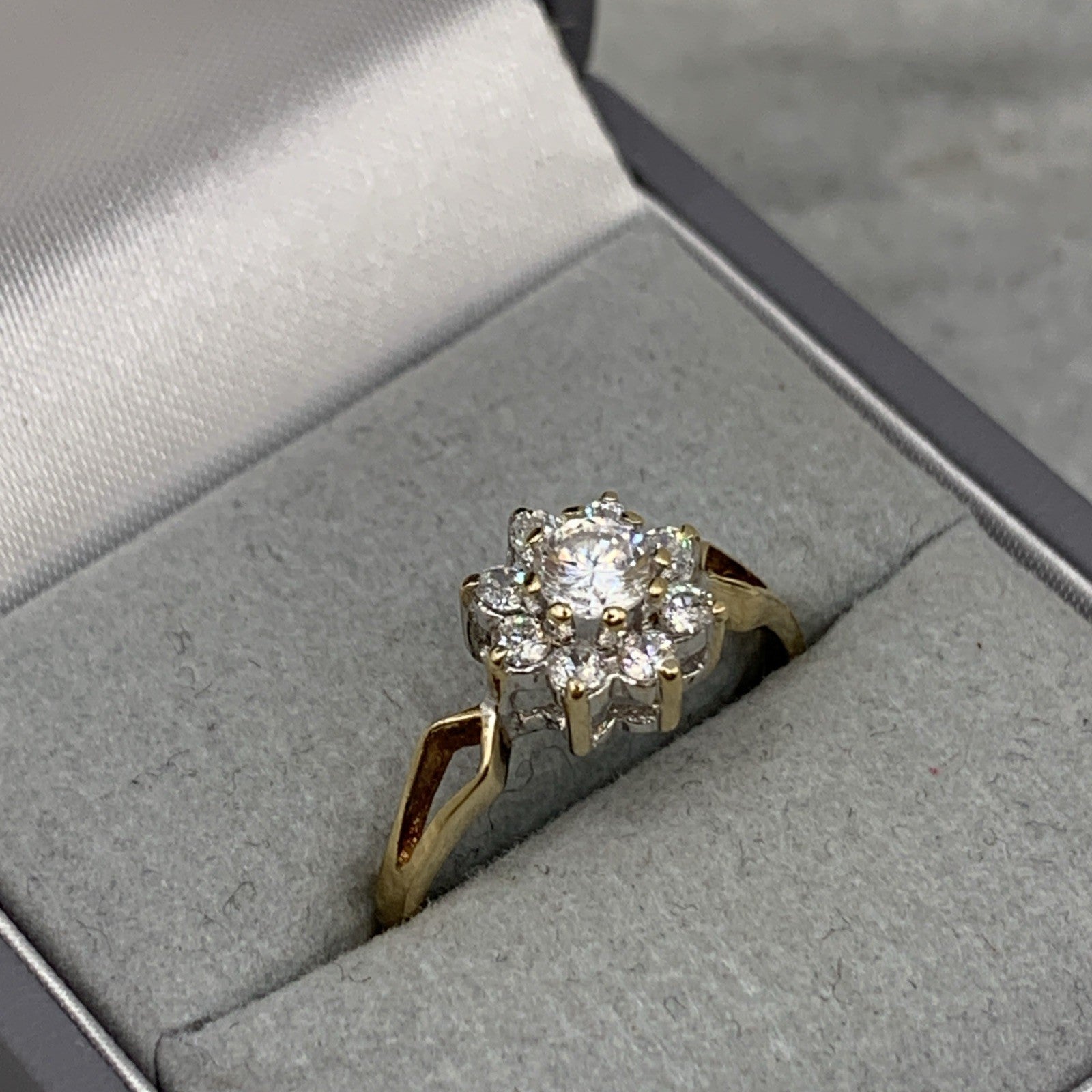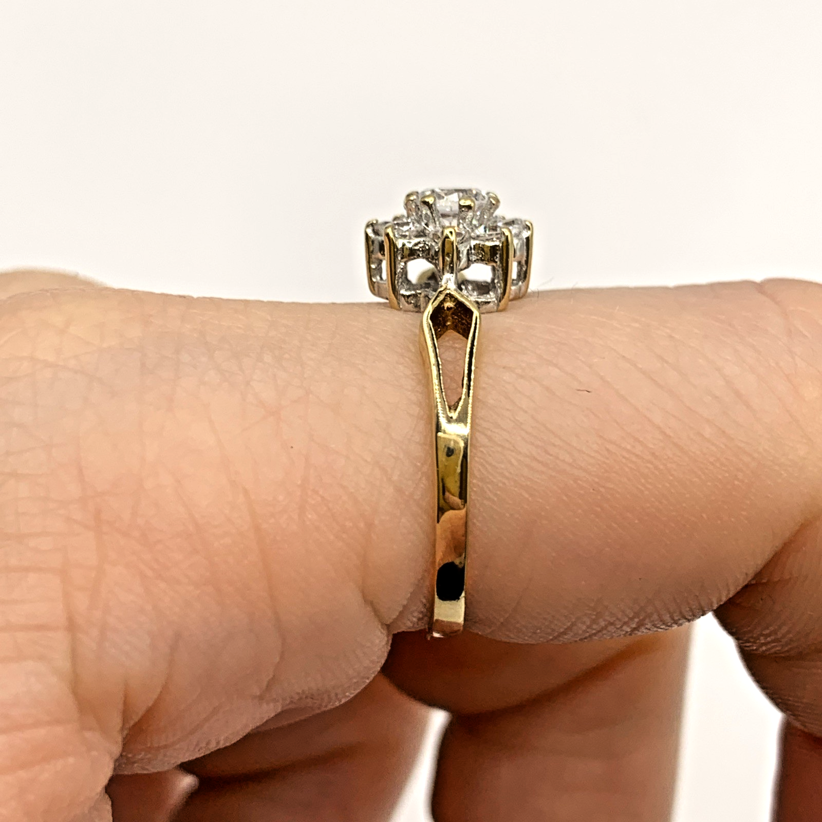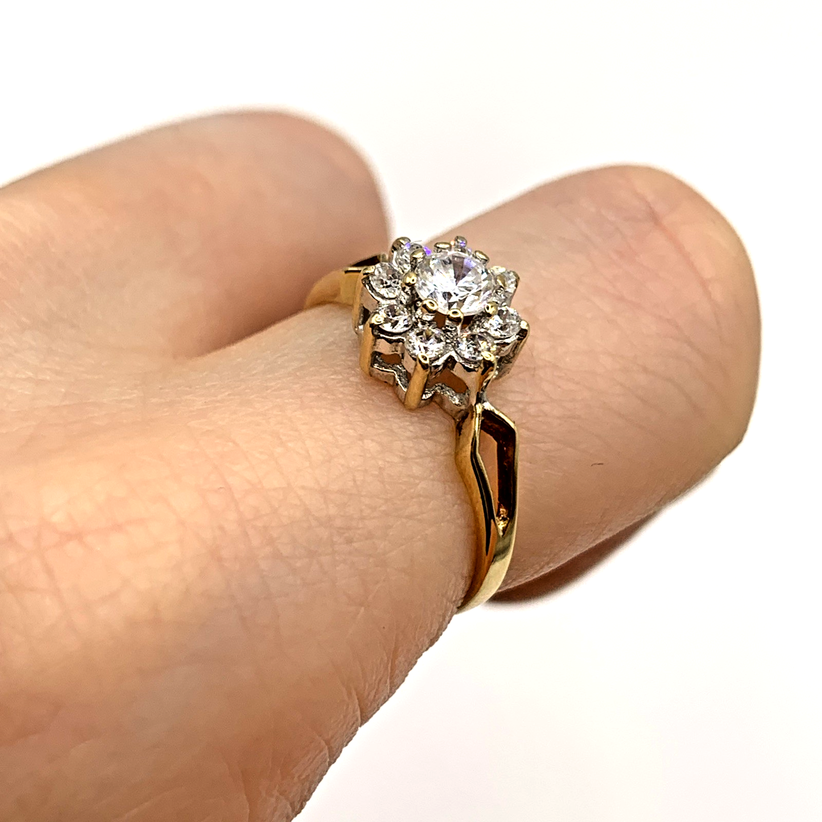 A lovely gold ring showcasing a daisy flower shaped cluster of cubic zirconia with split shoulders to accent.