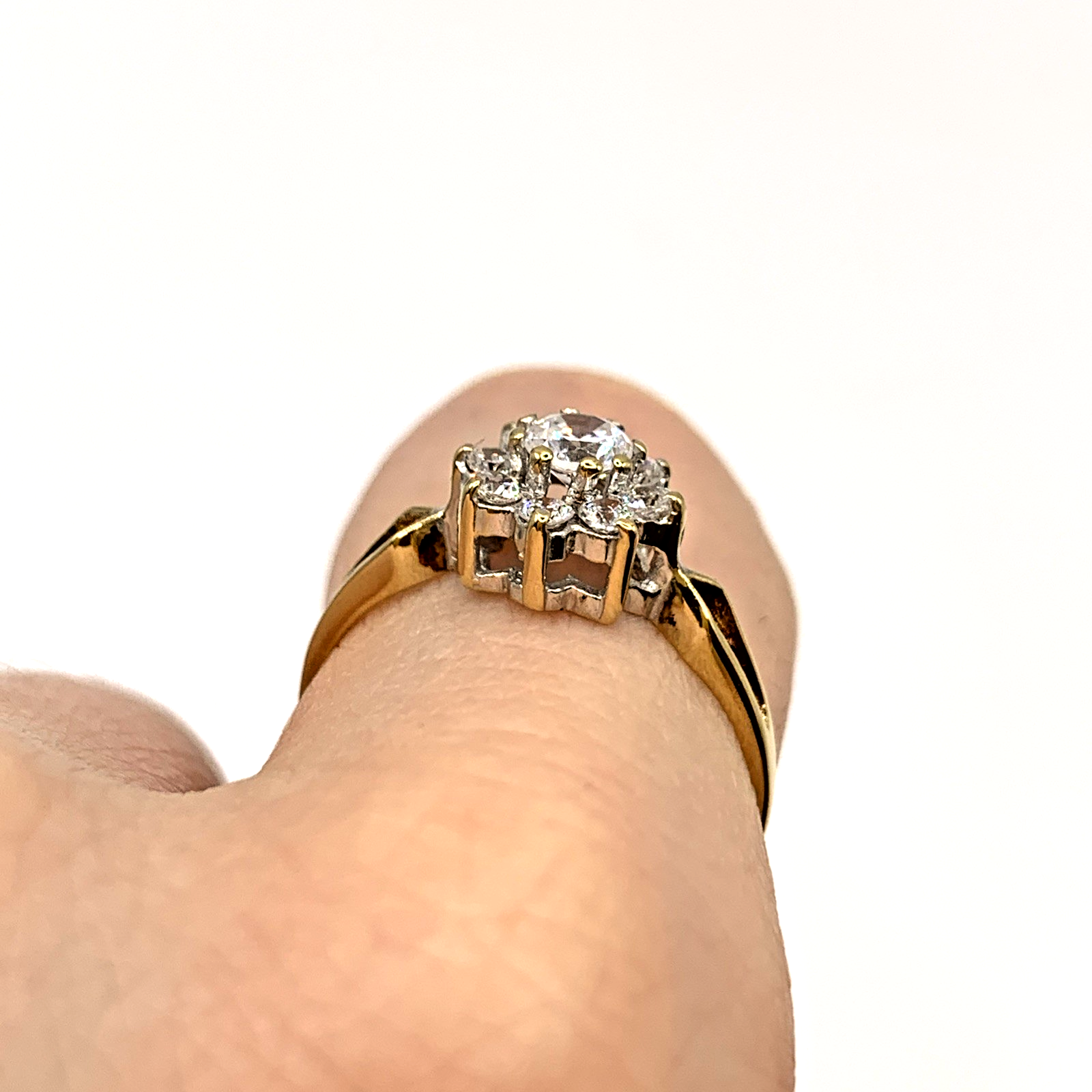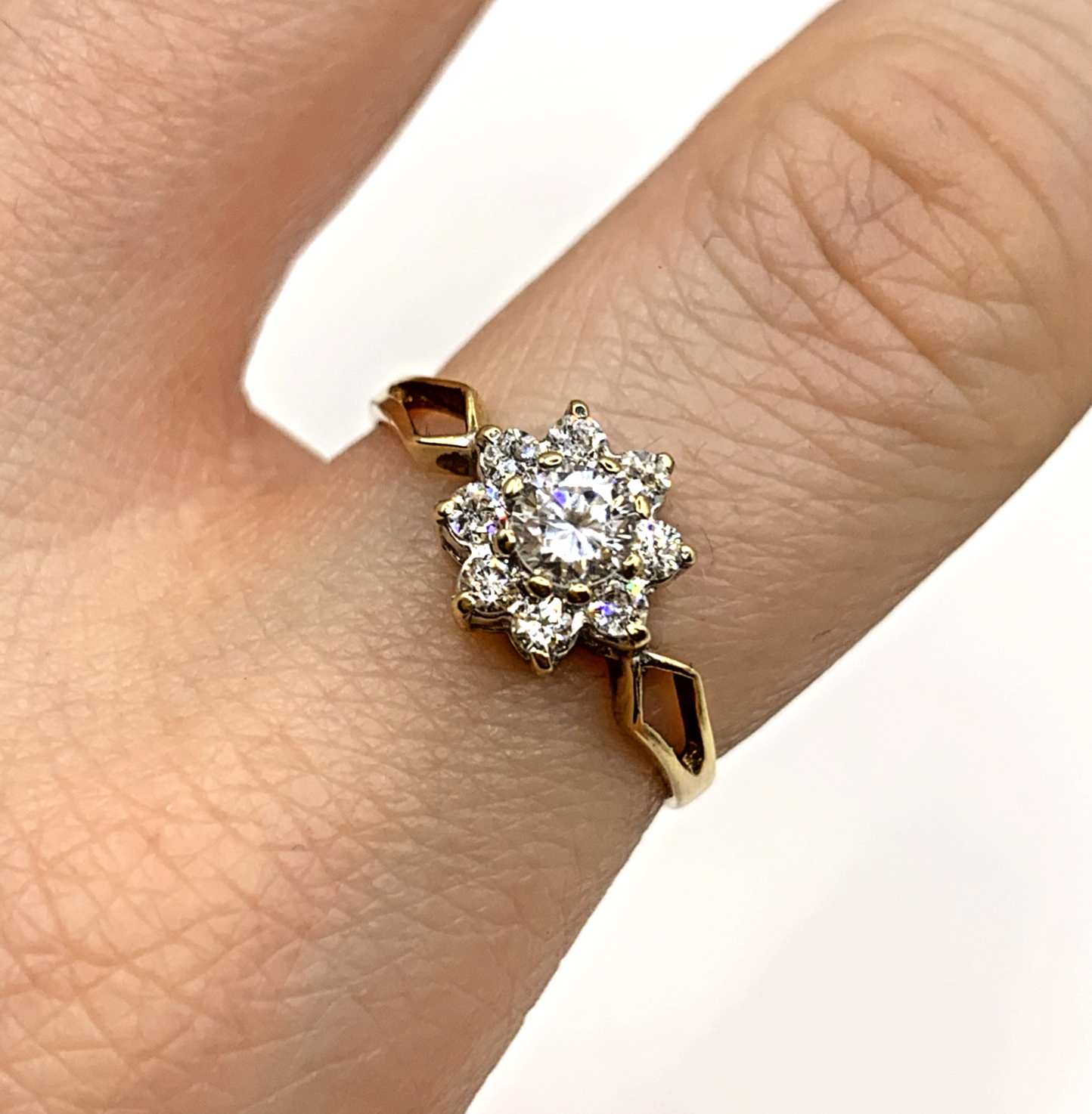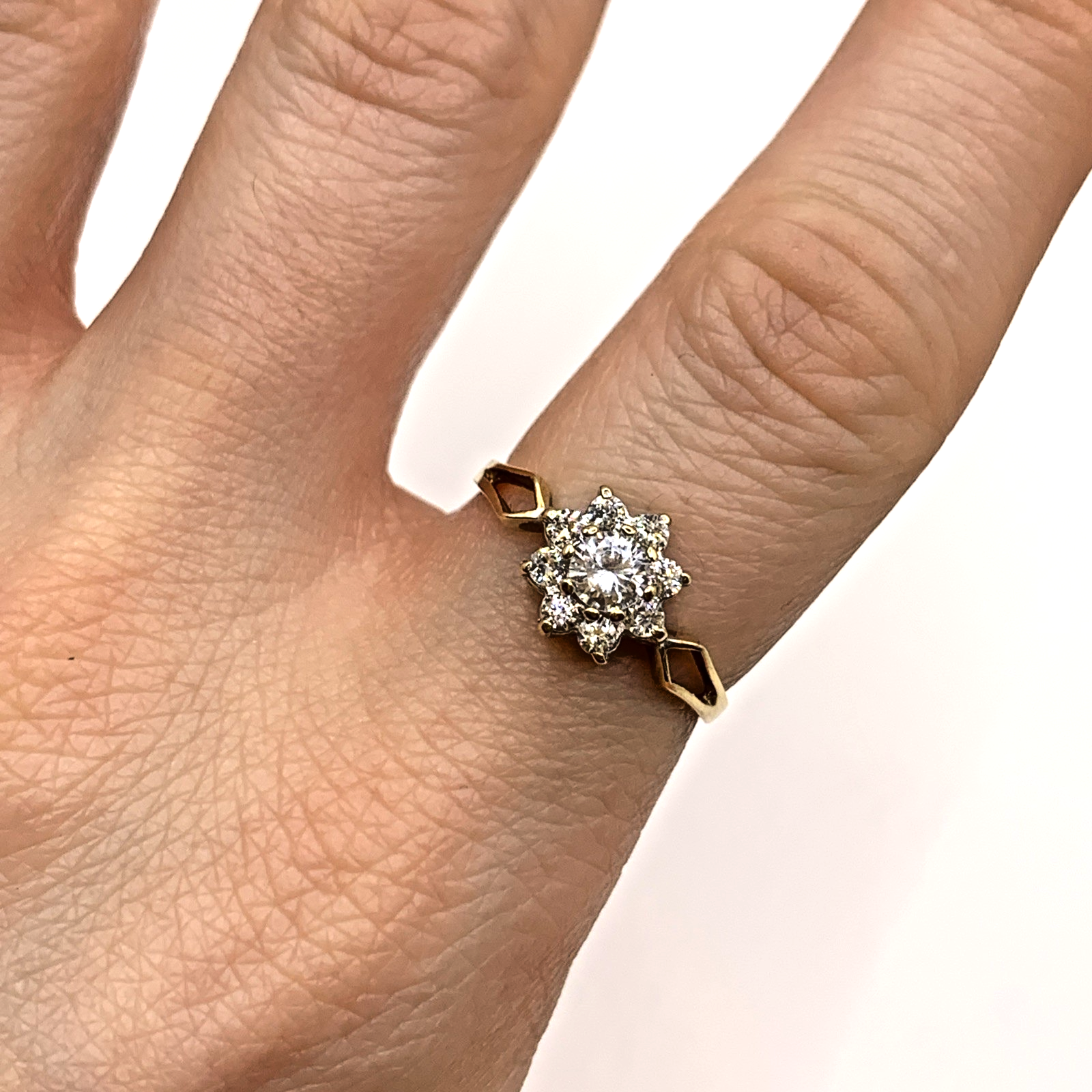 A lovely gold ring showcasing a daisy flower shaped cluster of cubic zirconia with split shoulders to accent.