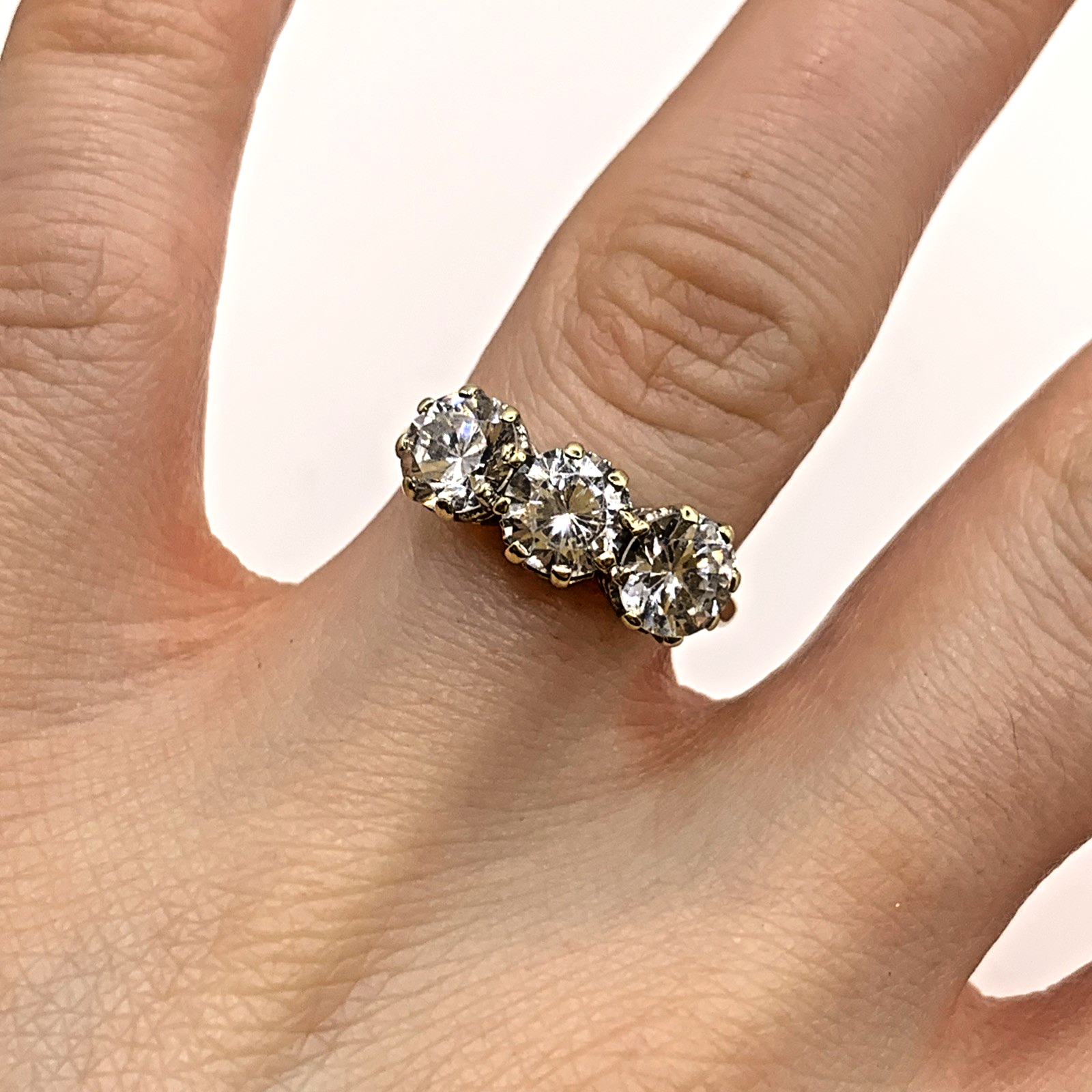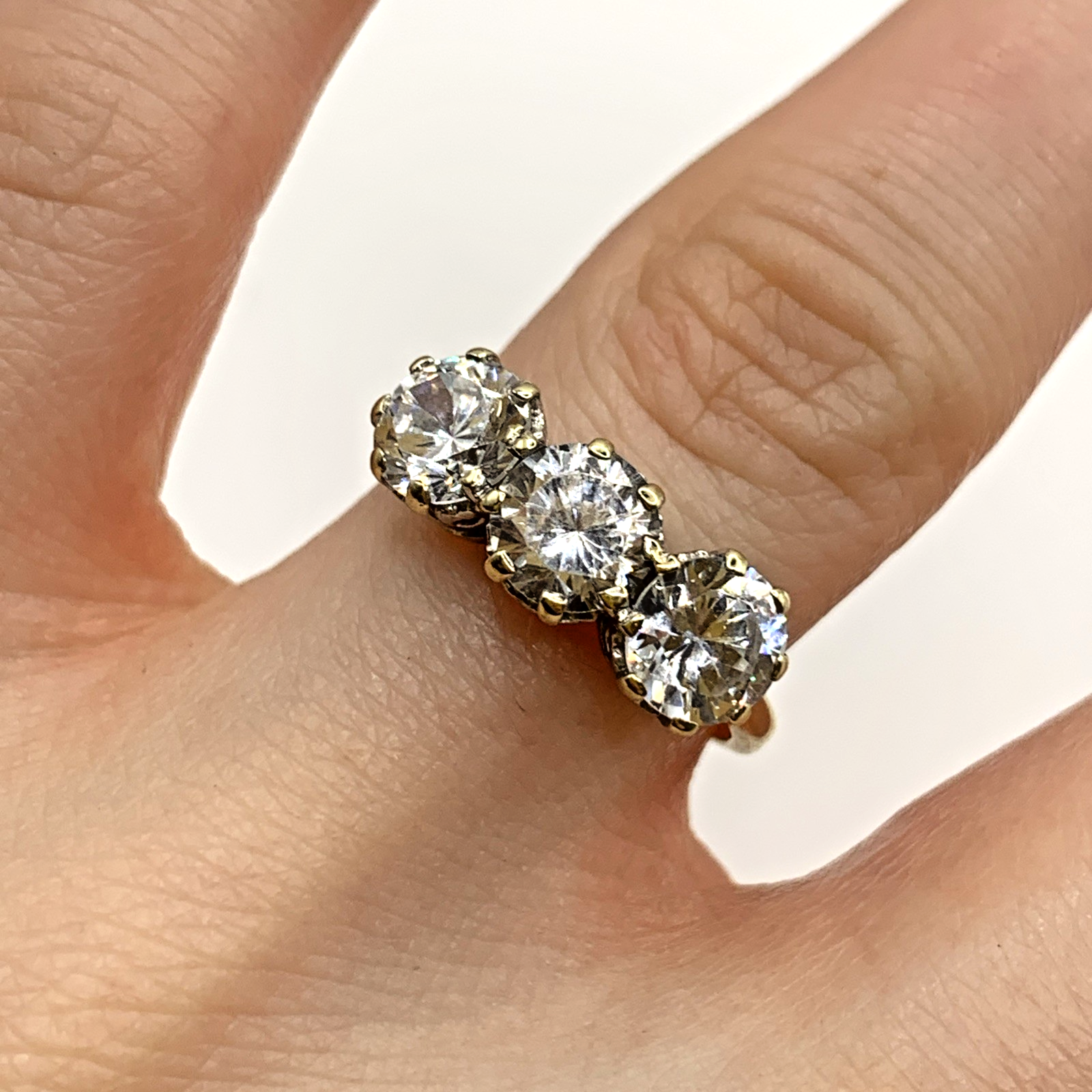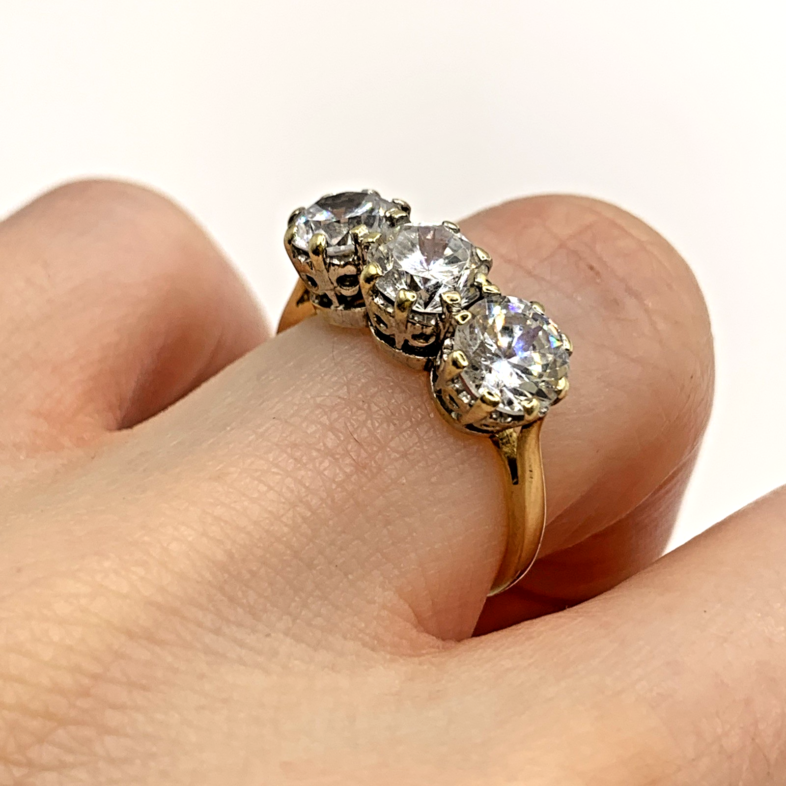 A gorgeous gold ring featuring a trilogy of round cut cubic zirconia gemstones.