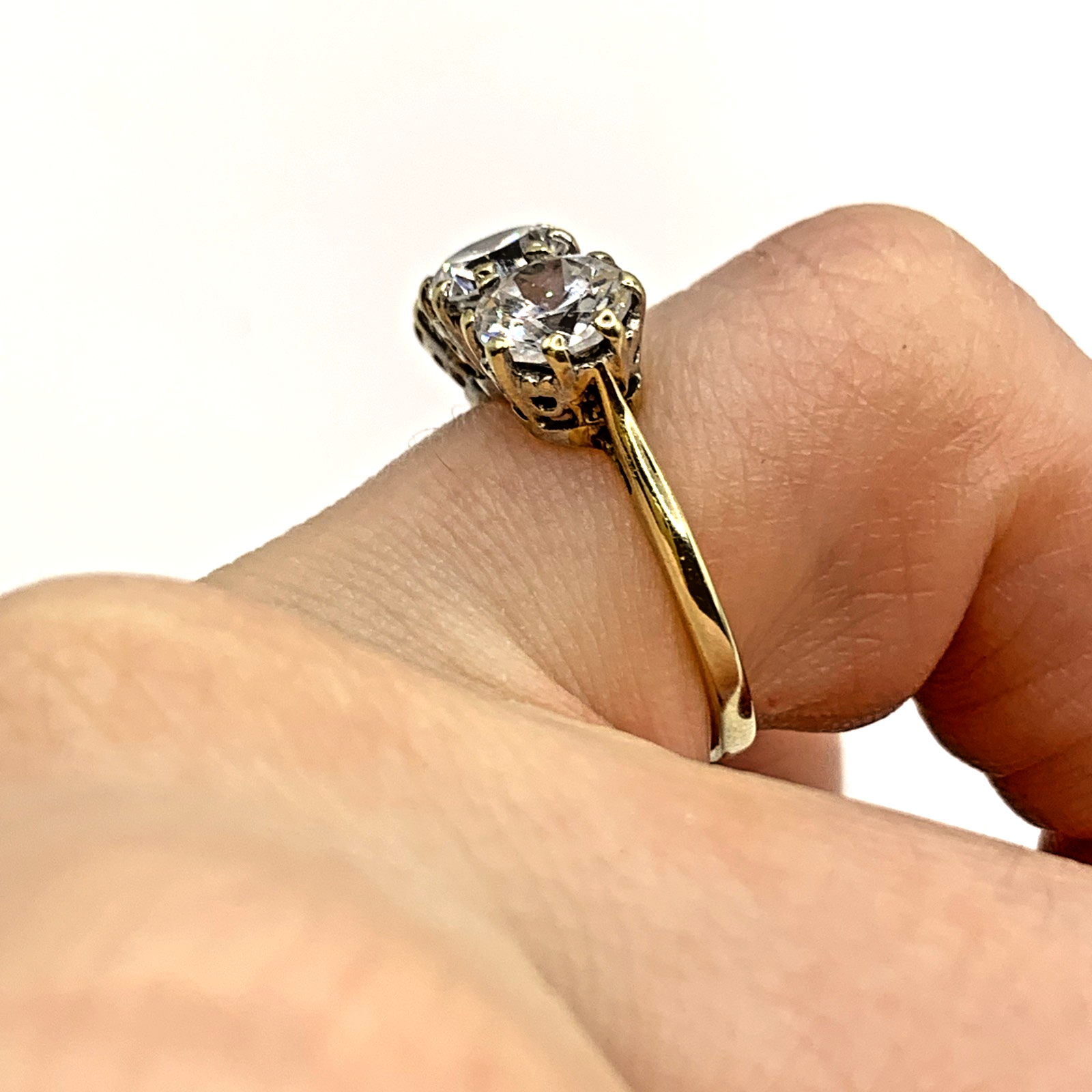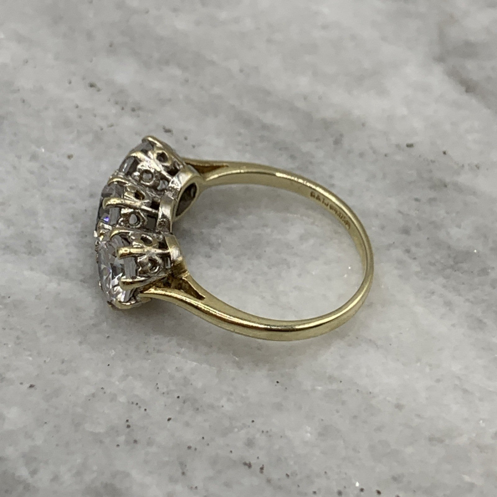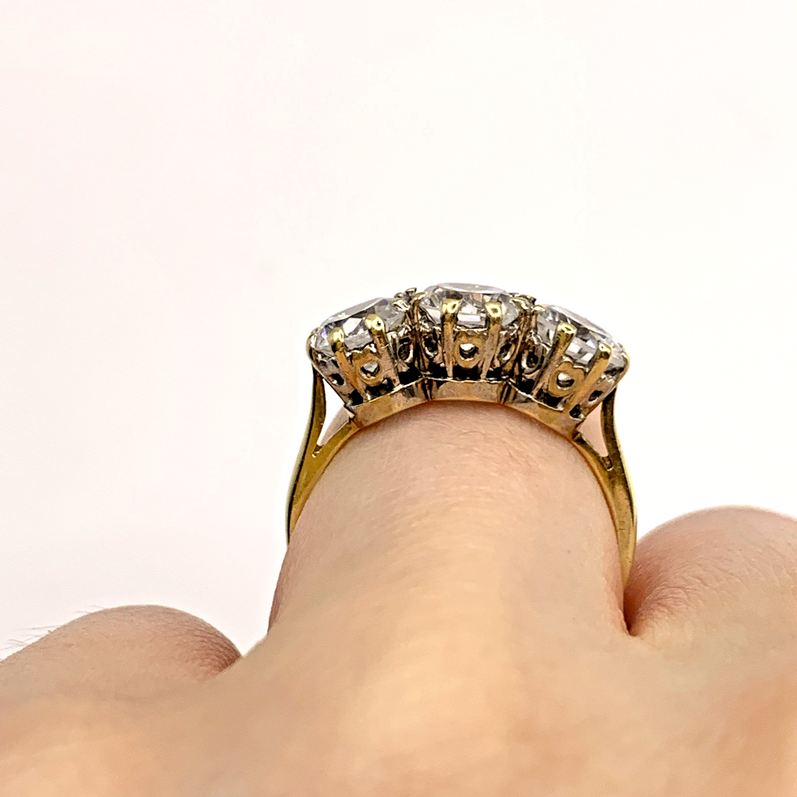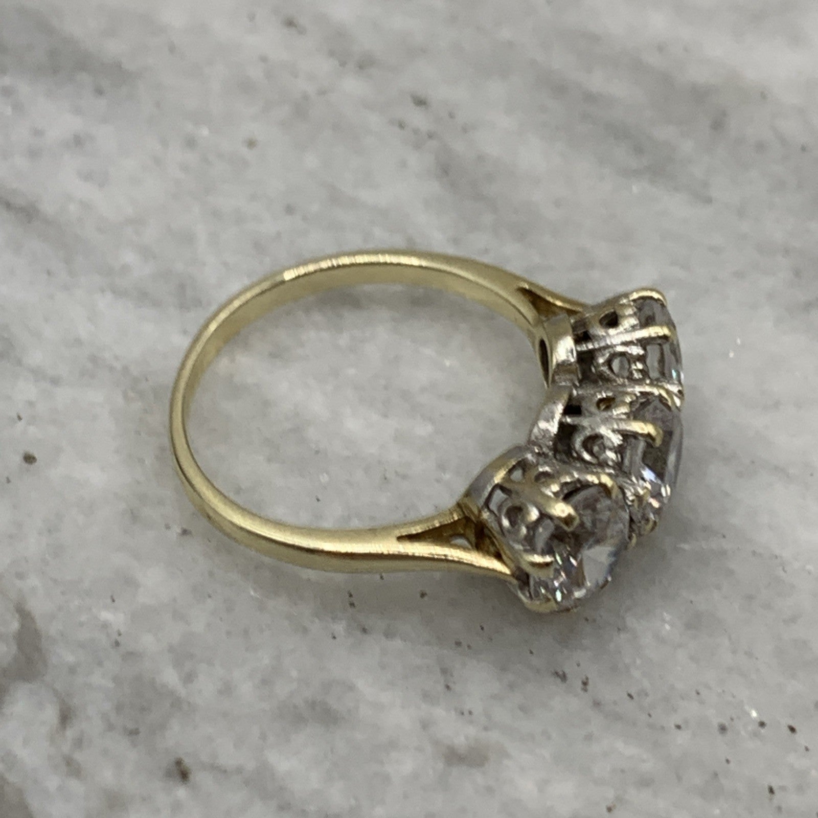 A gorgeous gold ring featuring a trilogy of round cut cubic zirconia gemstones.