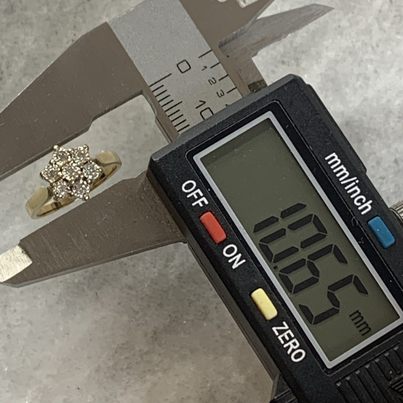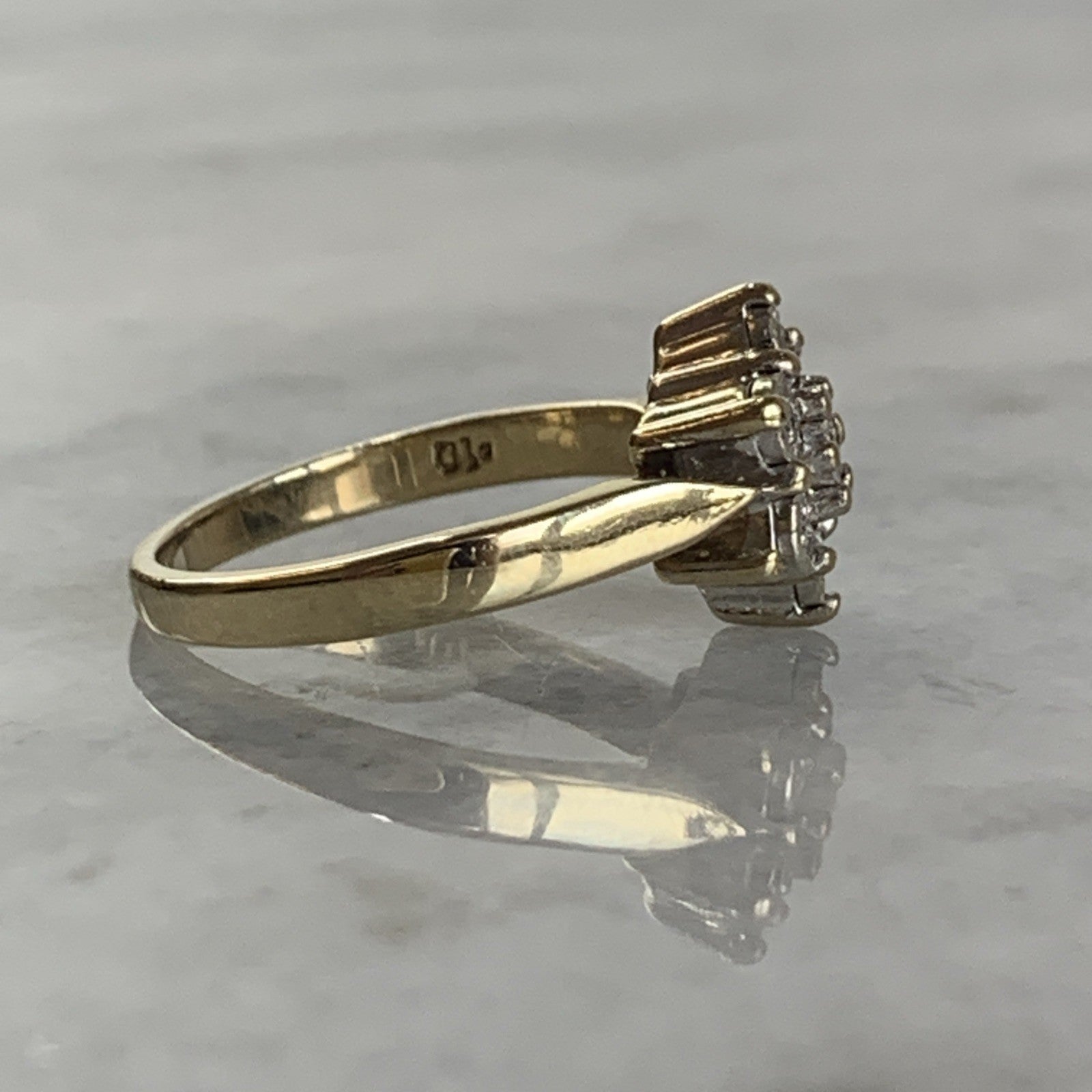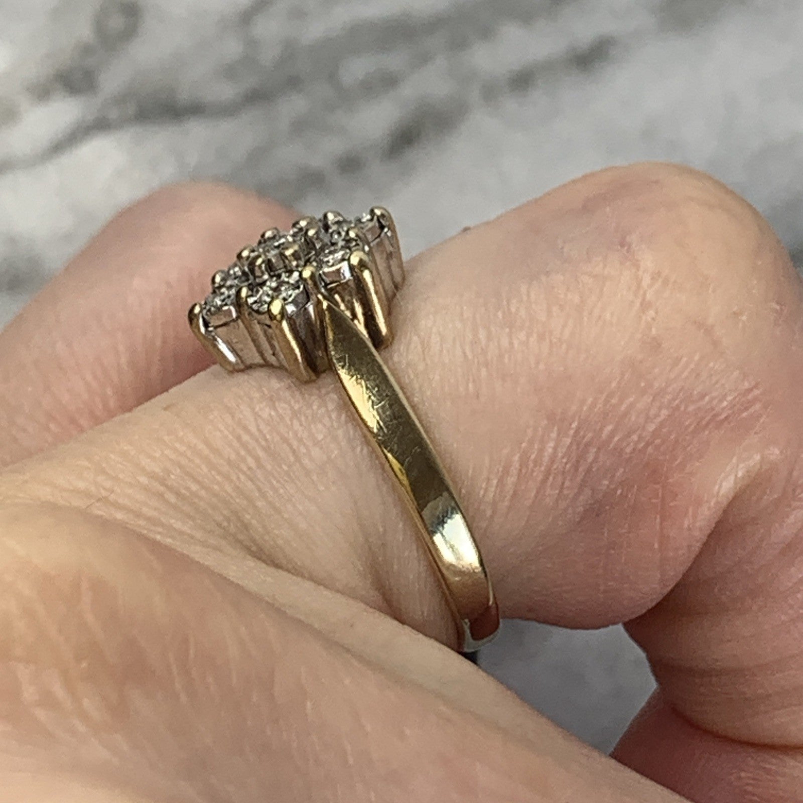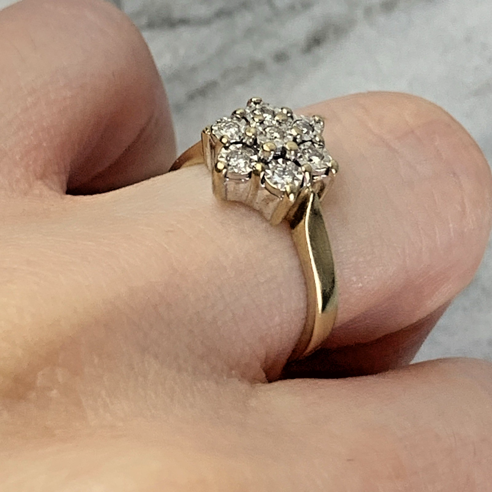 A stunning gold ring featuring a daisy flower style cluster of diamonds amounting to .10ct.