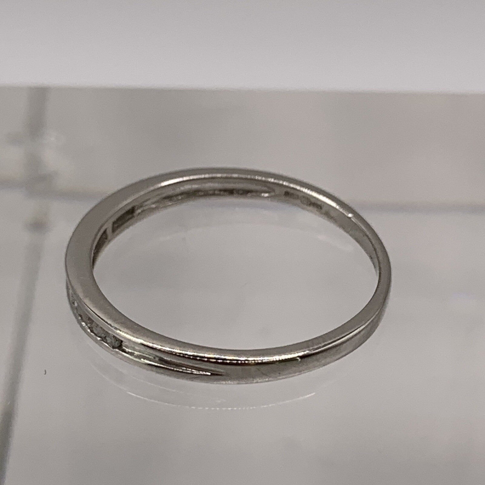 A fine white gold ring showcasing a channel of petite diamonds amounting to .10ct in the half eternity style.