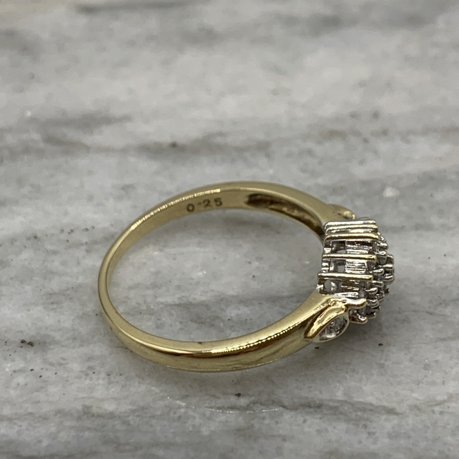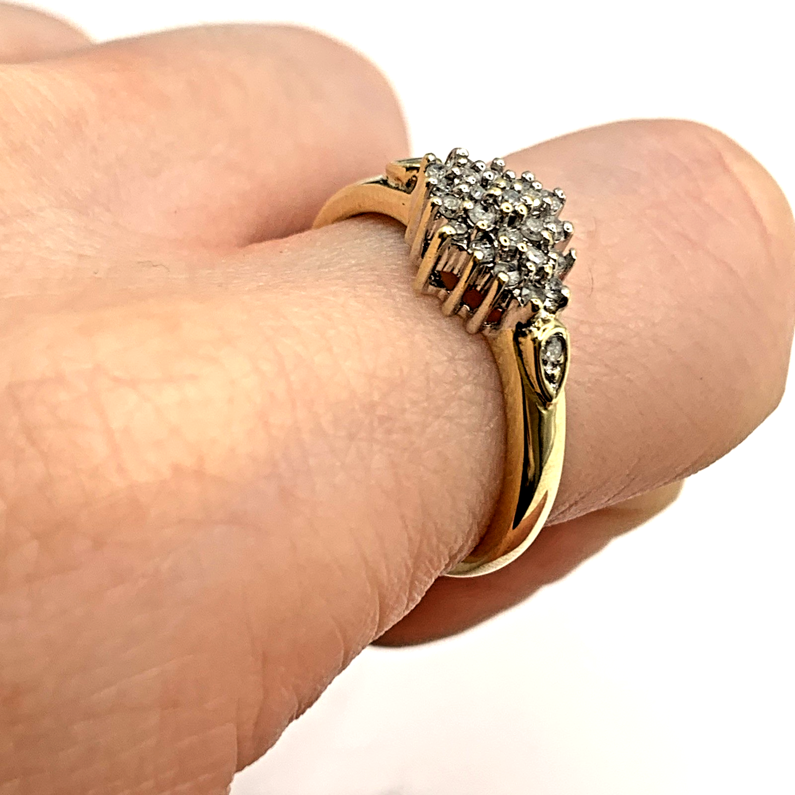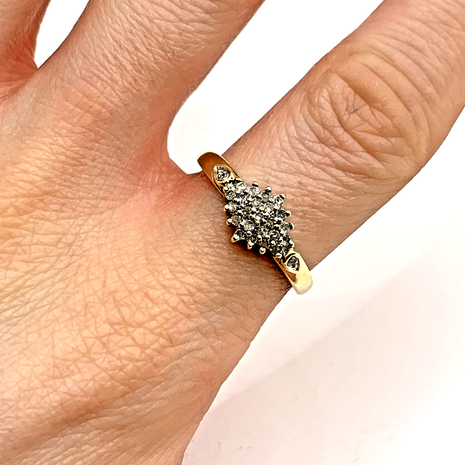 A stunning gold ring showcasing a cluster of round cut diamonds amounting to .25ct.