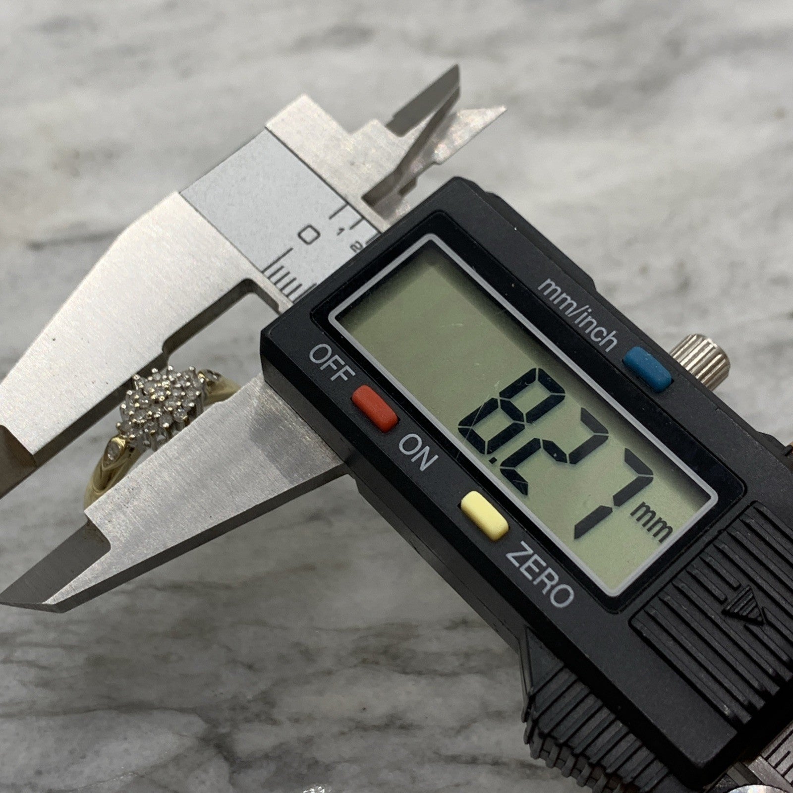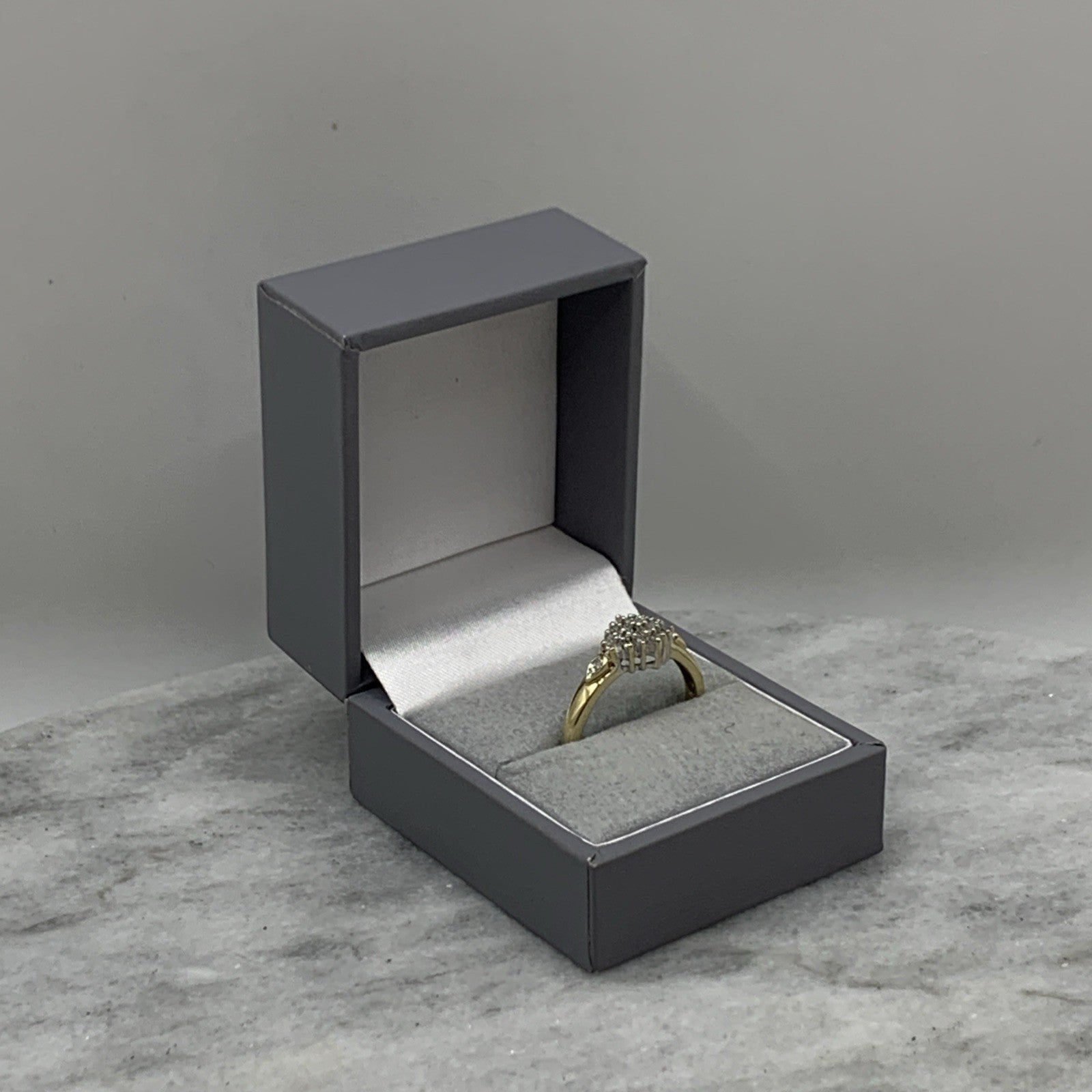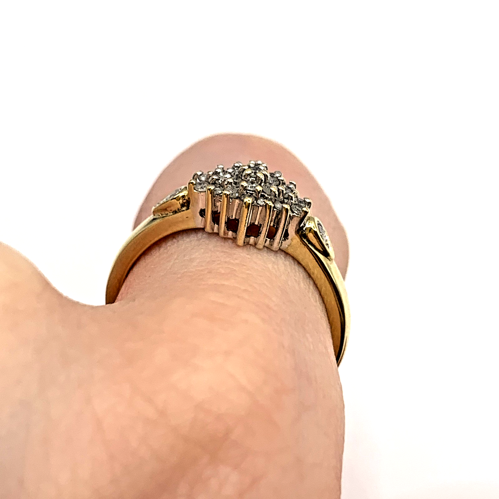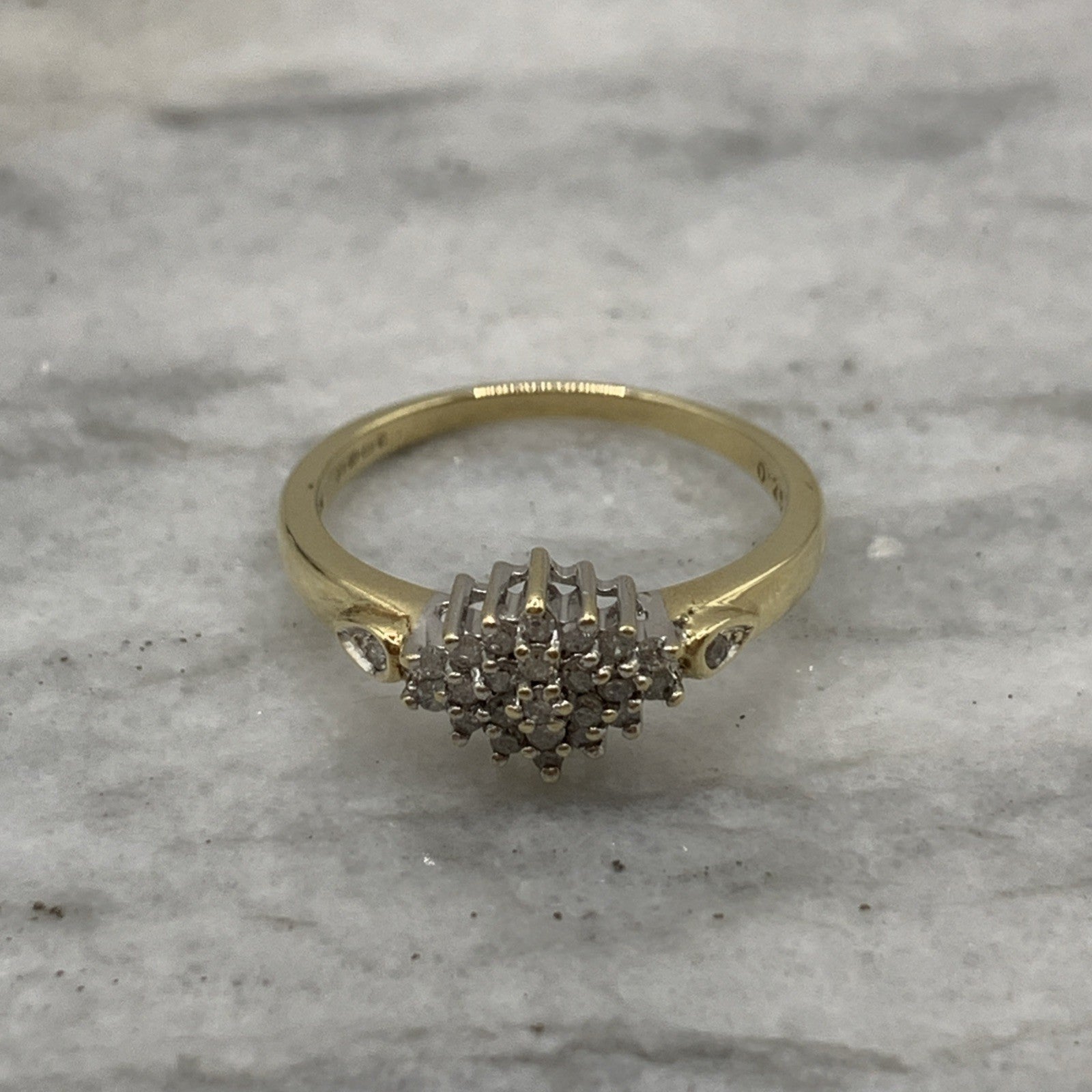 A stunning gold ring showcasing a cluster of round cut diamonds amounting to .25ct.