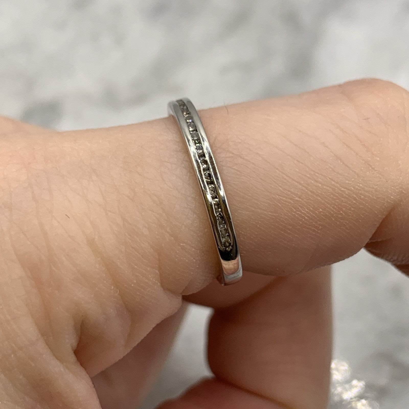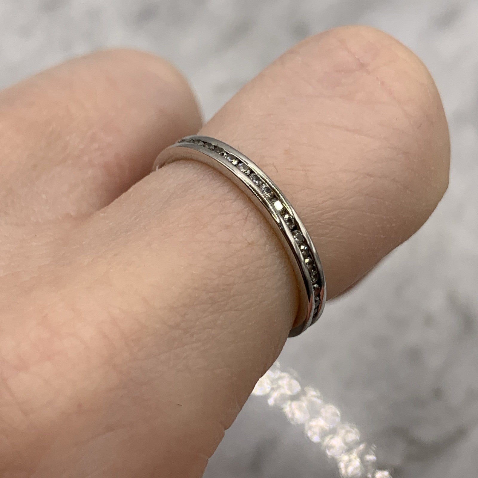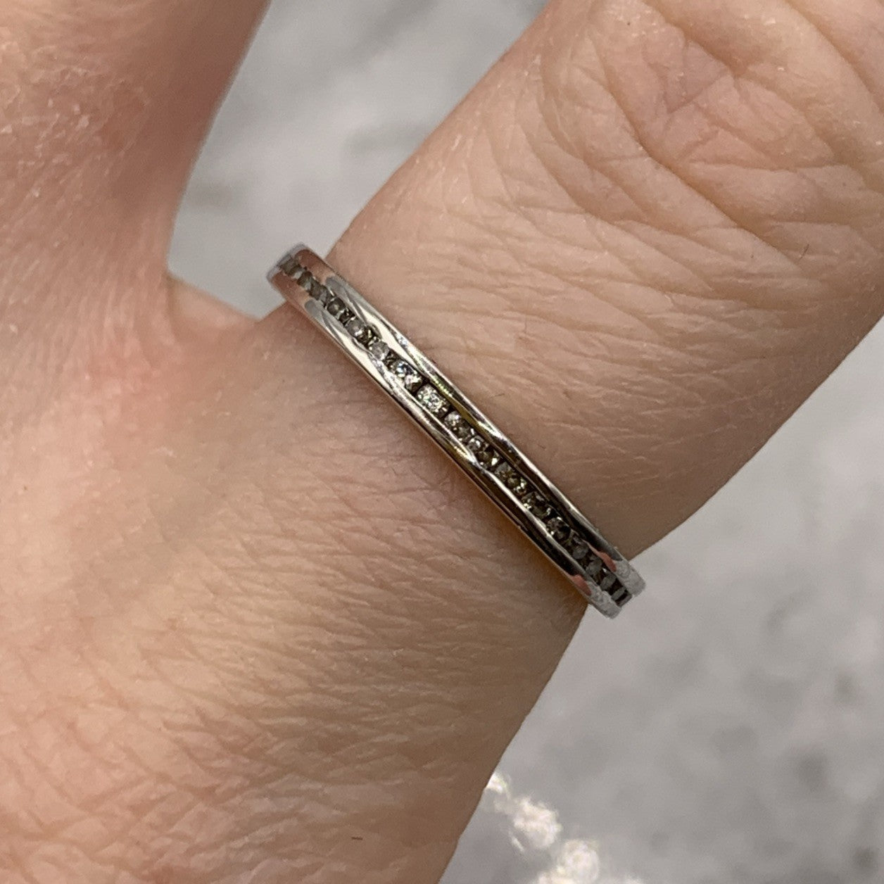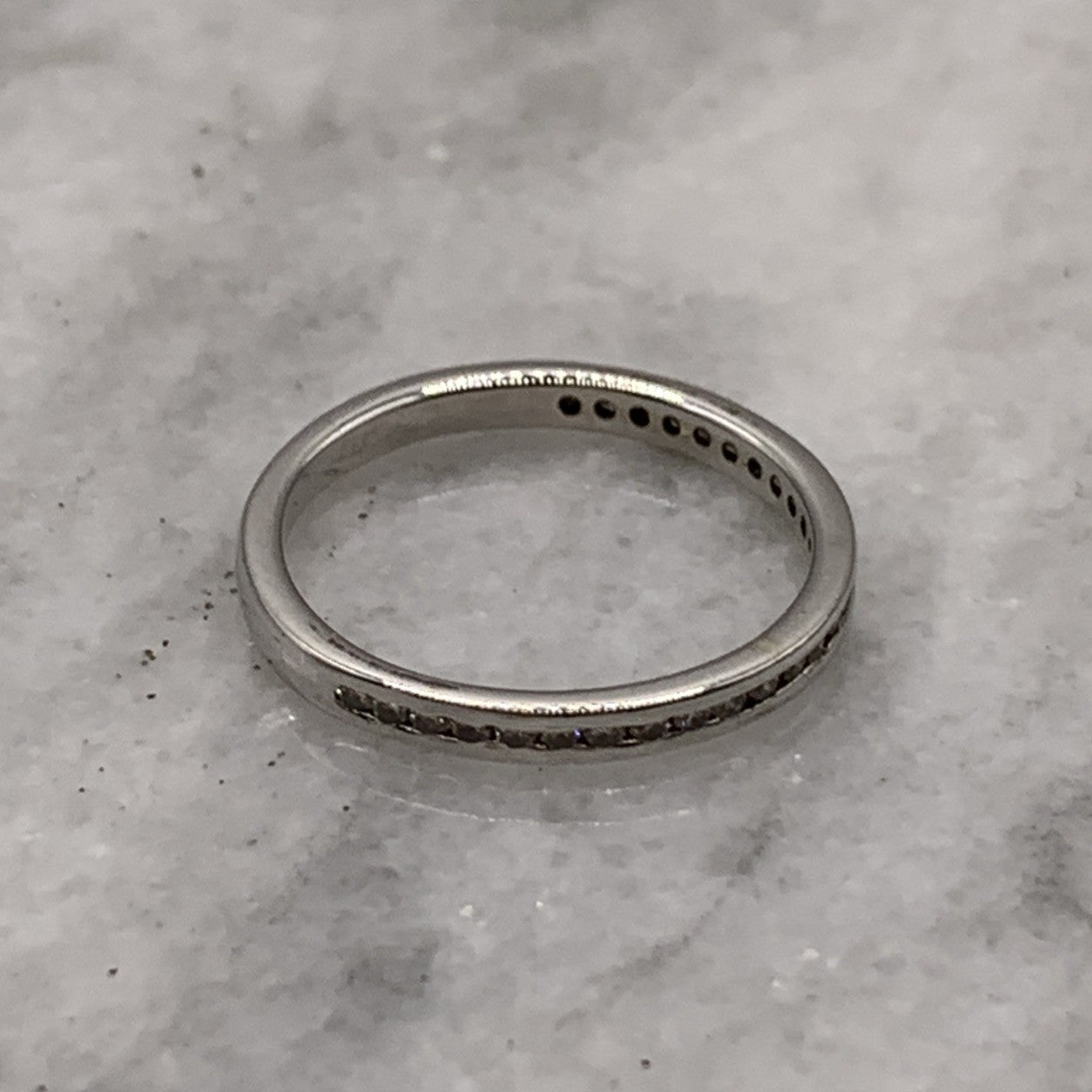 A timeless white gold band ring featuring a channel of petite round cut diamonds.