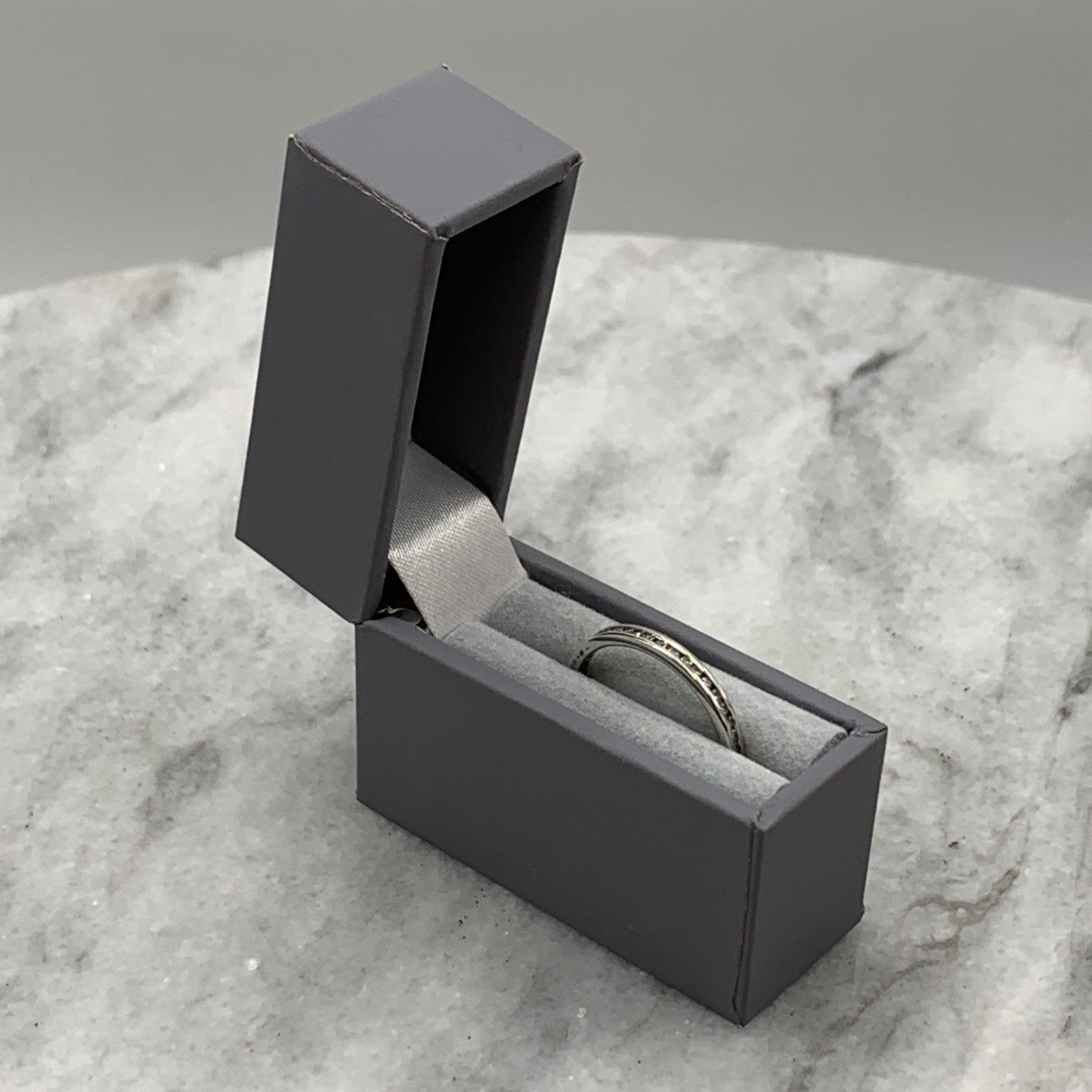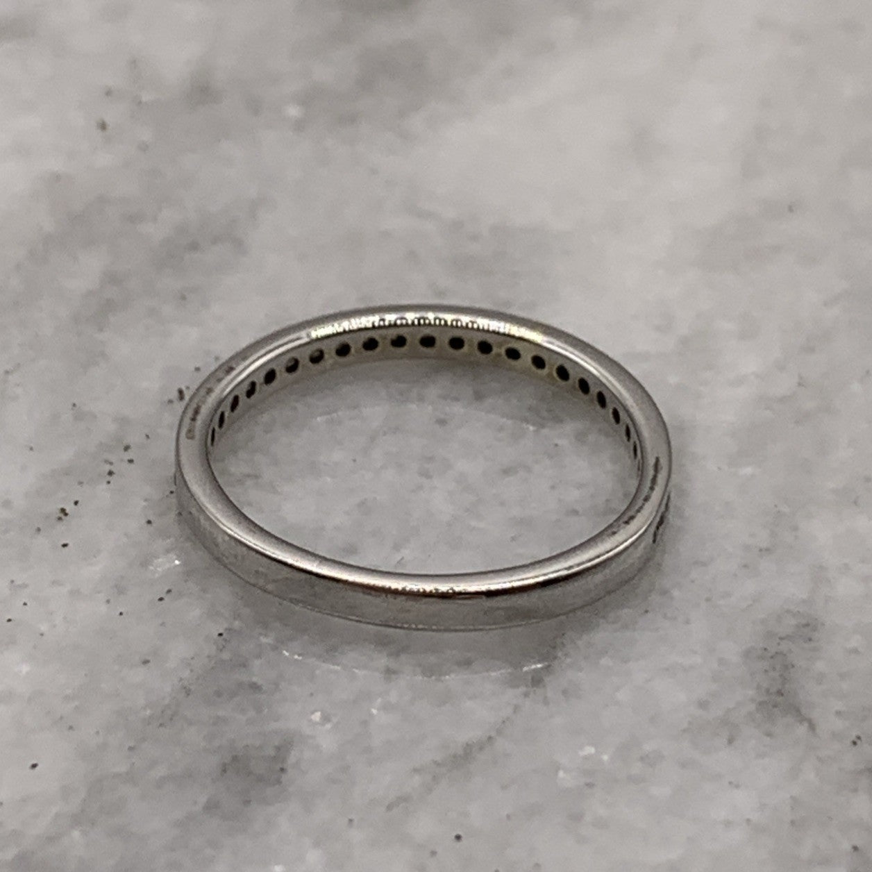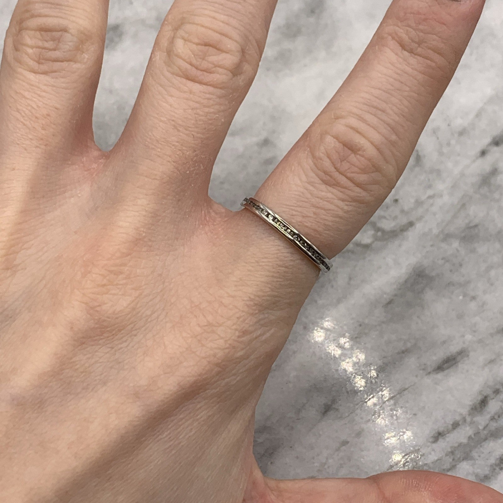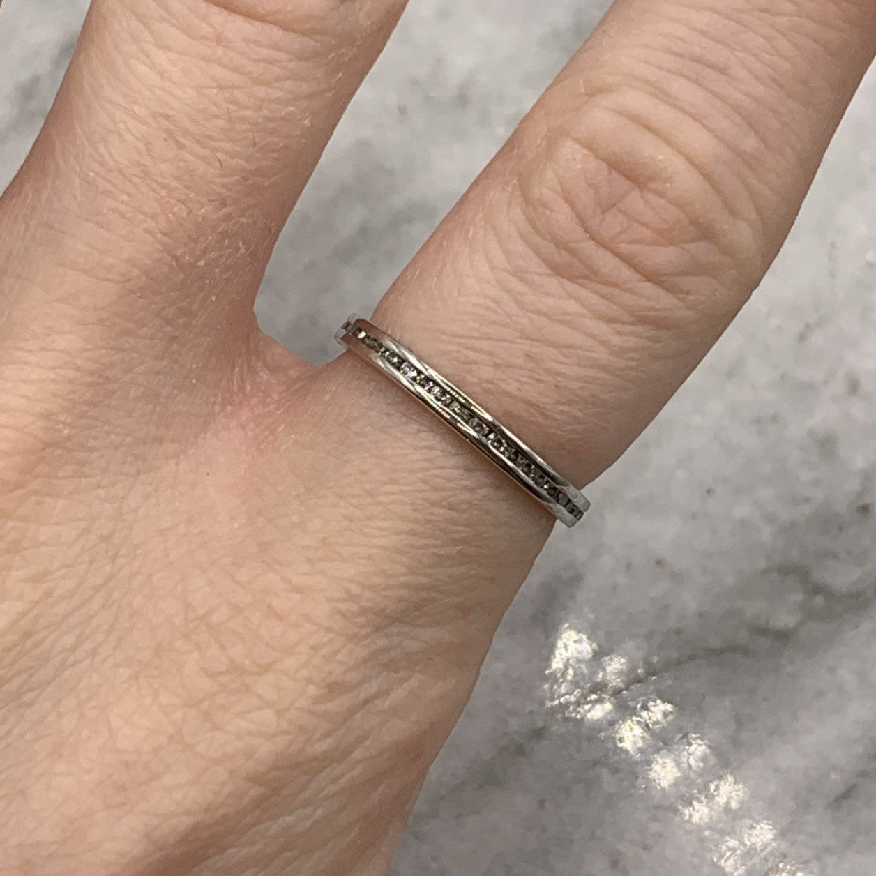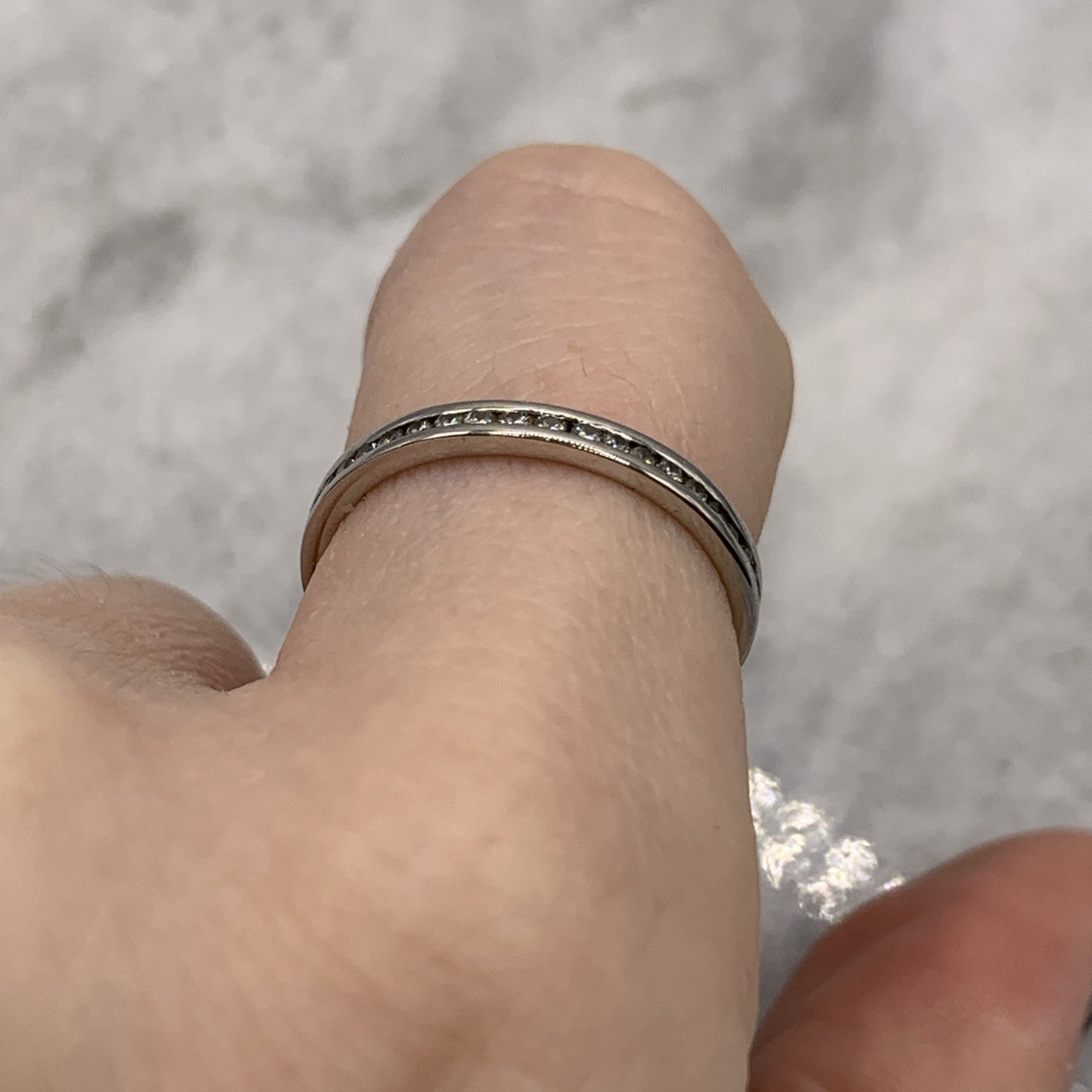 A timeless white gold band ring featuring a channel of petite round cut diamonds.