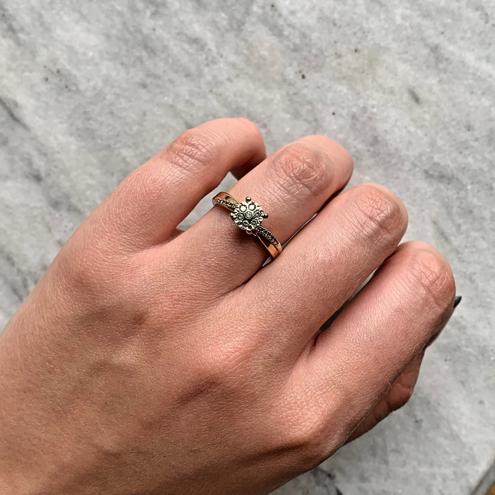 A beautiful ring with a cluster of diamonds in an illusion-solitaire setting, with diamond accents to the shoulders. All stones are natural.