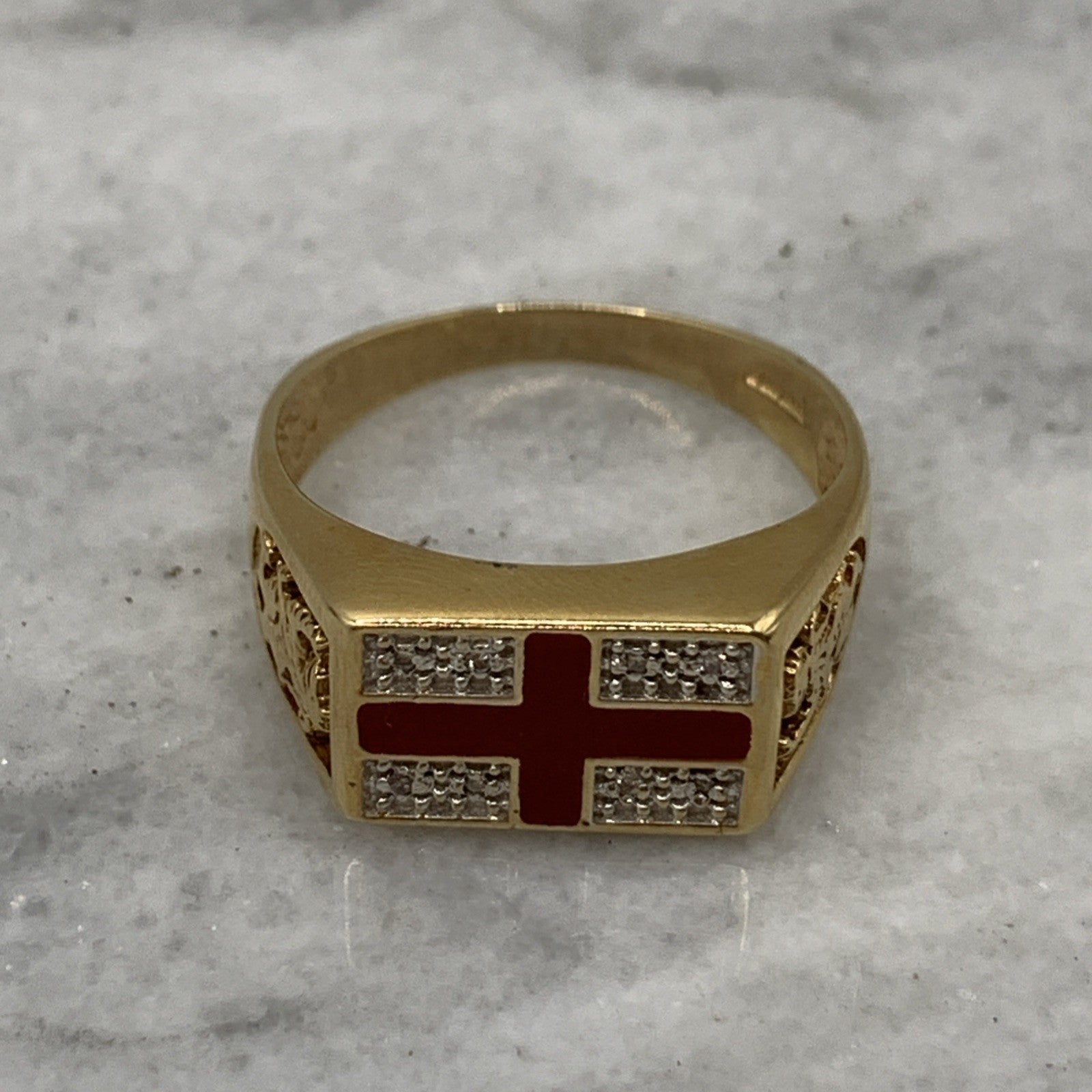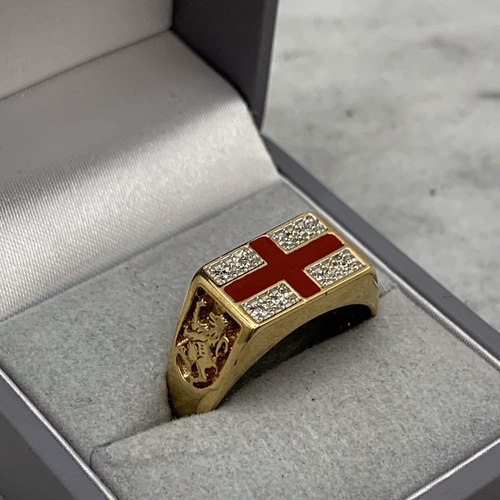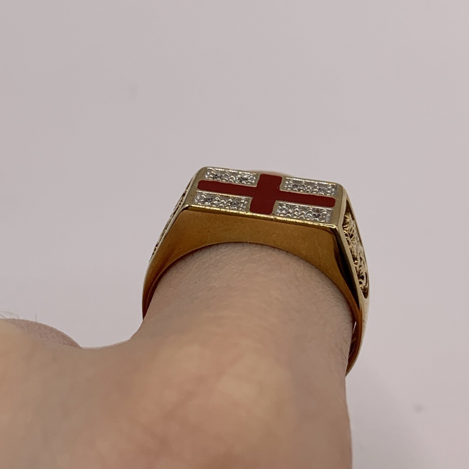 9 ct Gold Diamond England Flag Signet Ring 375 Yellow Gold - Size V