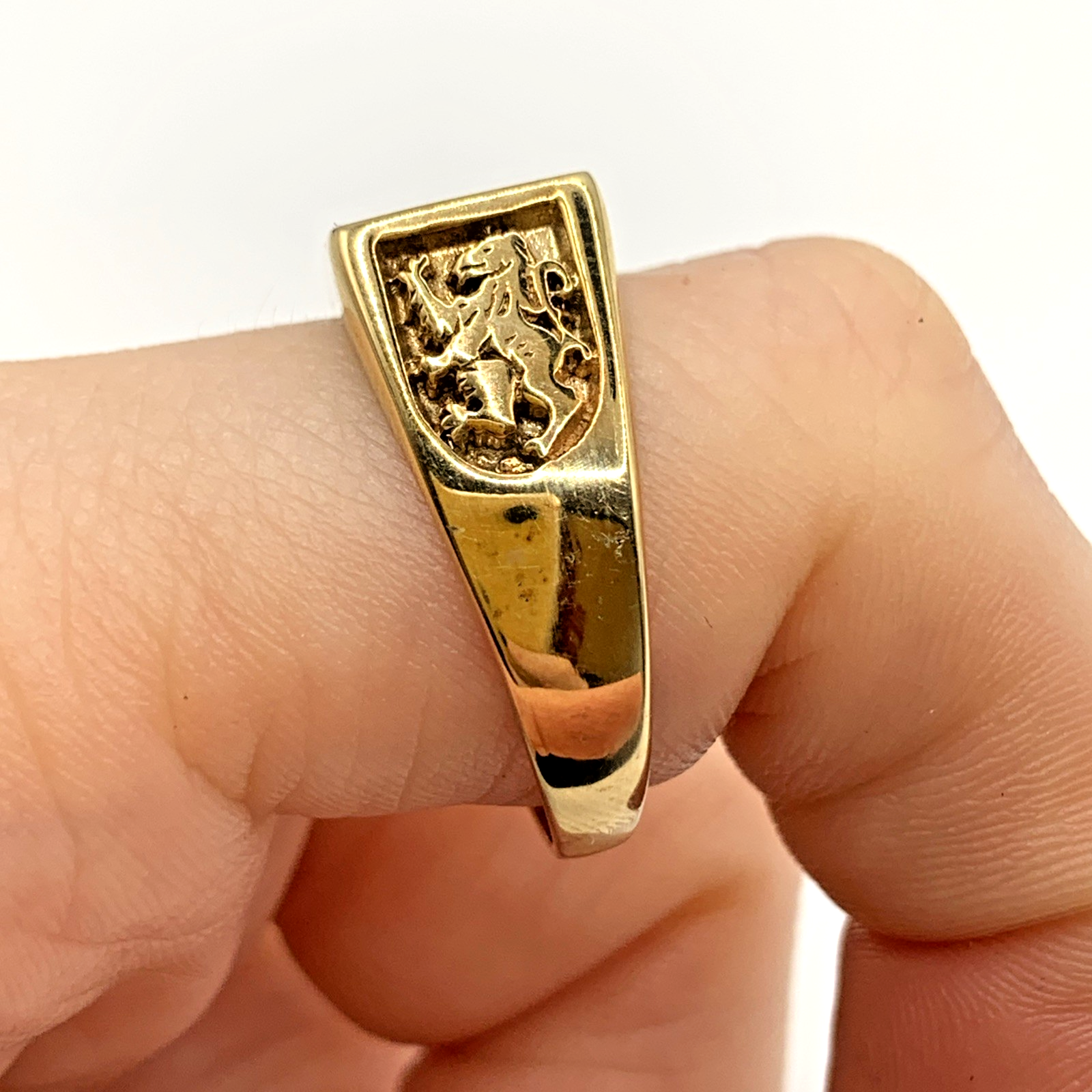 A beautiful gold signet ring featuring the England flag, accented by petite pave set diamonds and lion motifs on the shoulders.