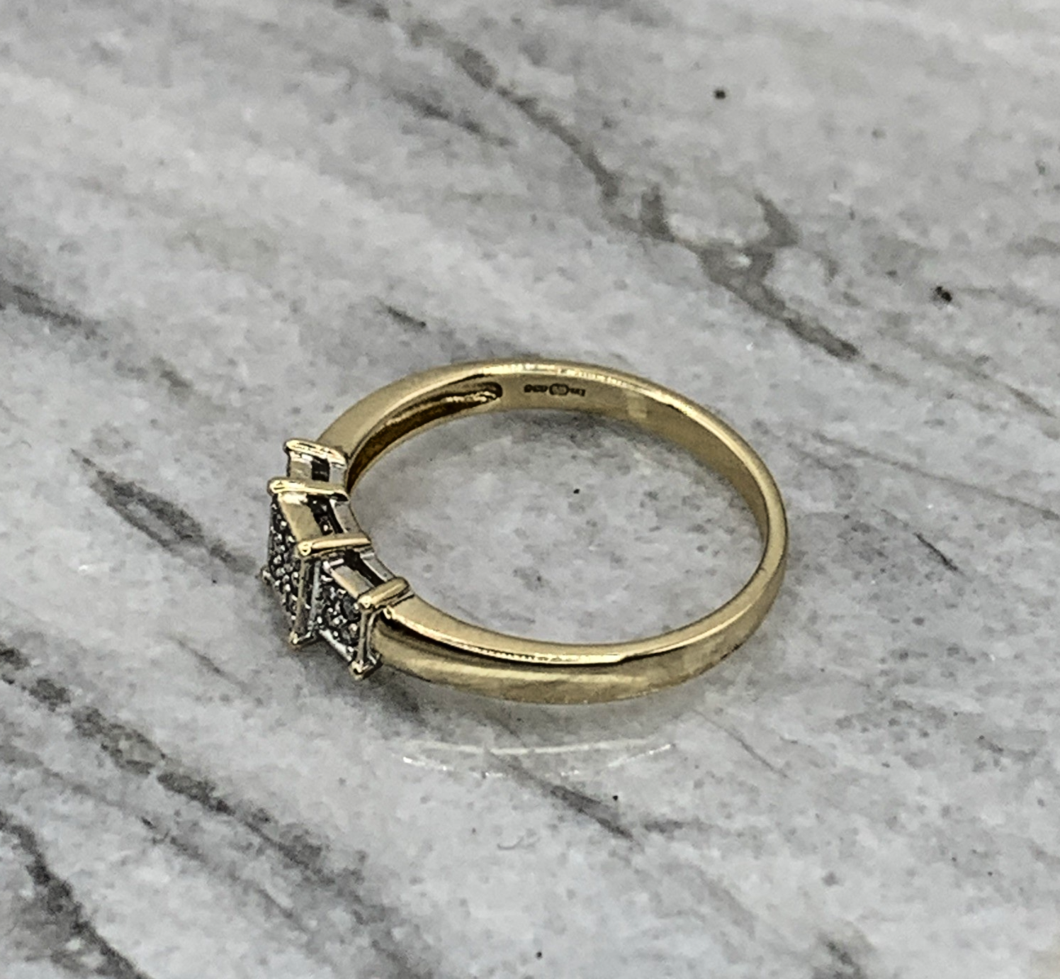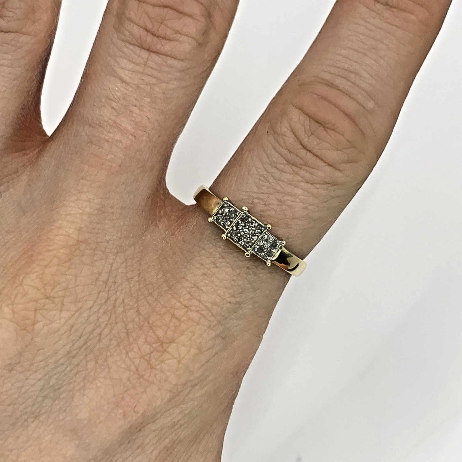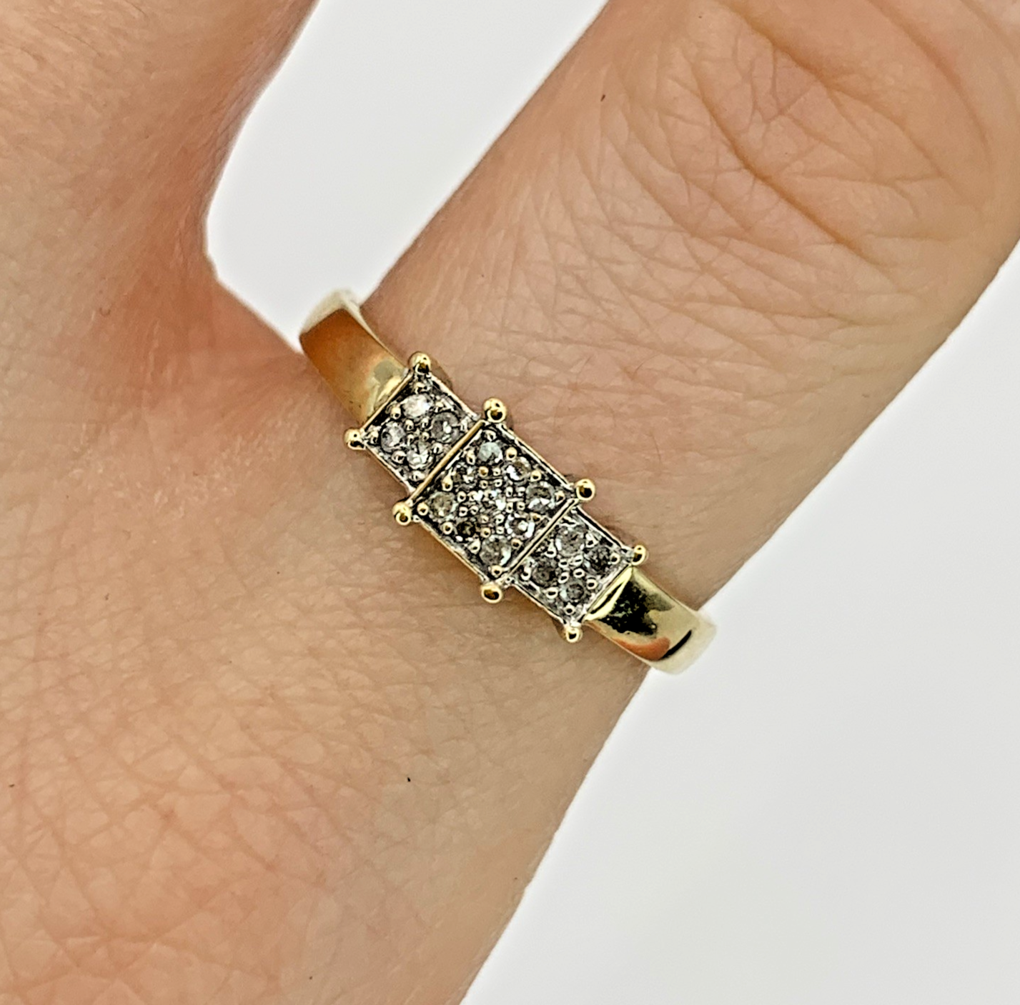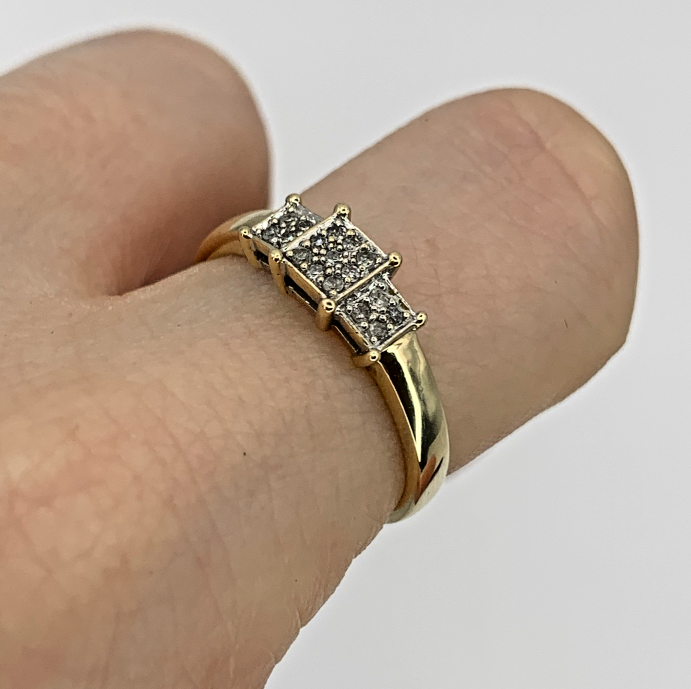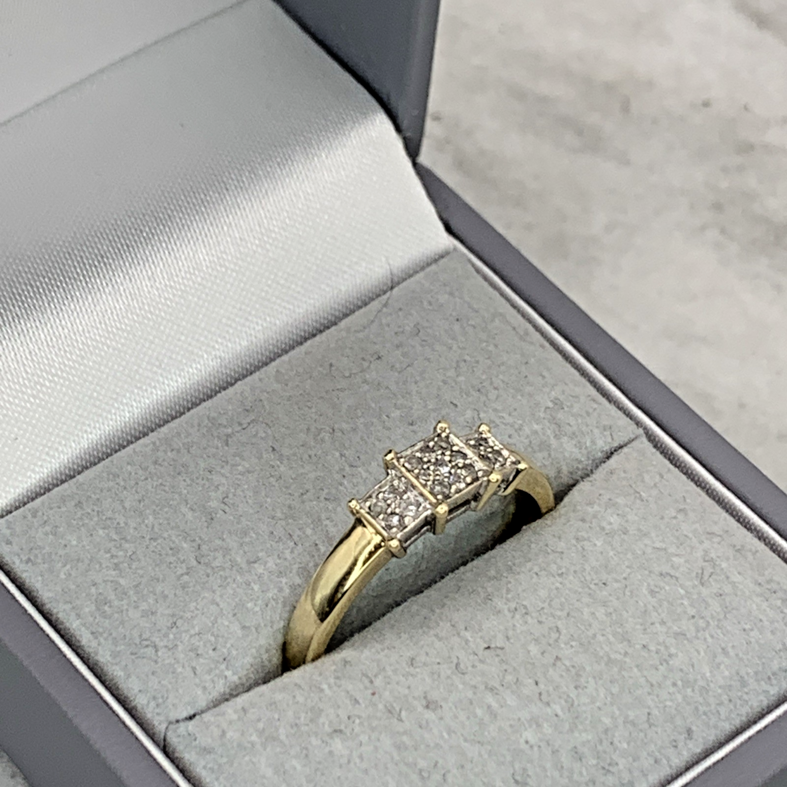 A beautiful gold ring featuring three square shaped clusters of invisible set diamonds.