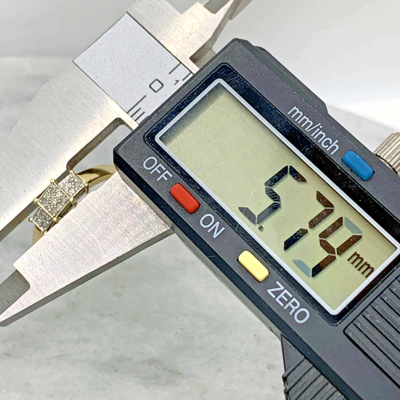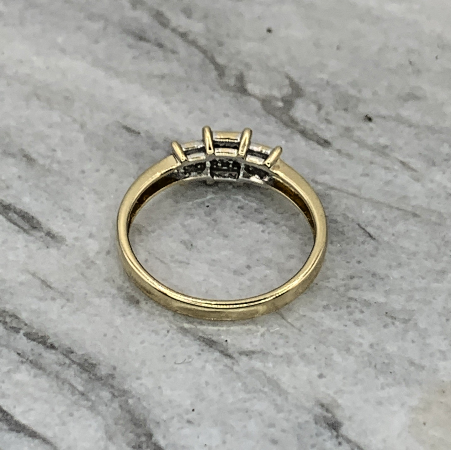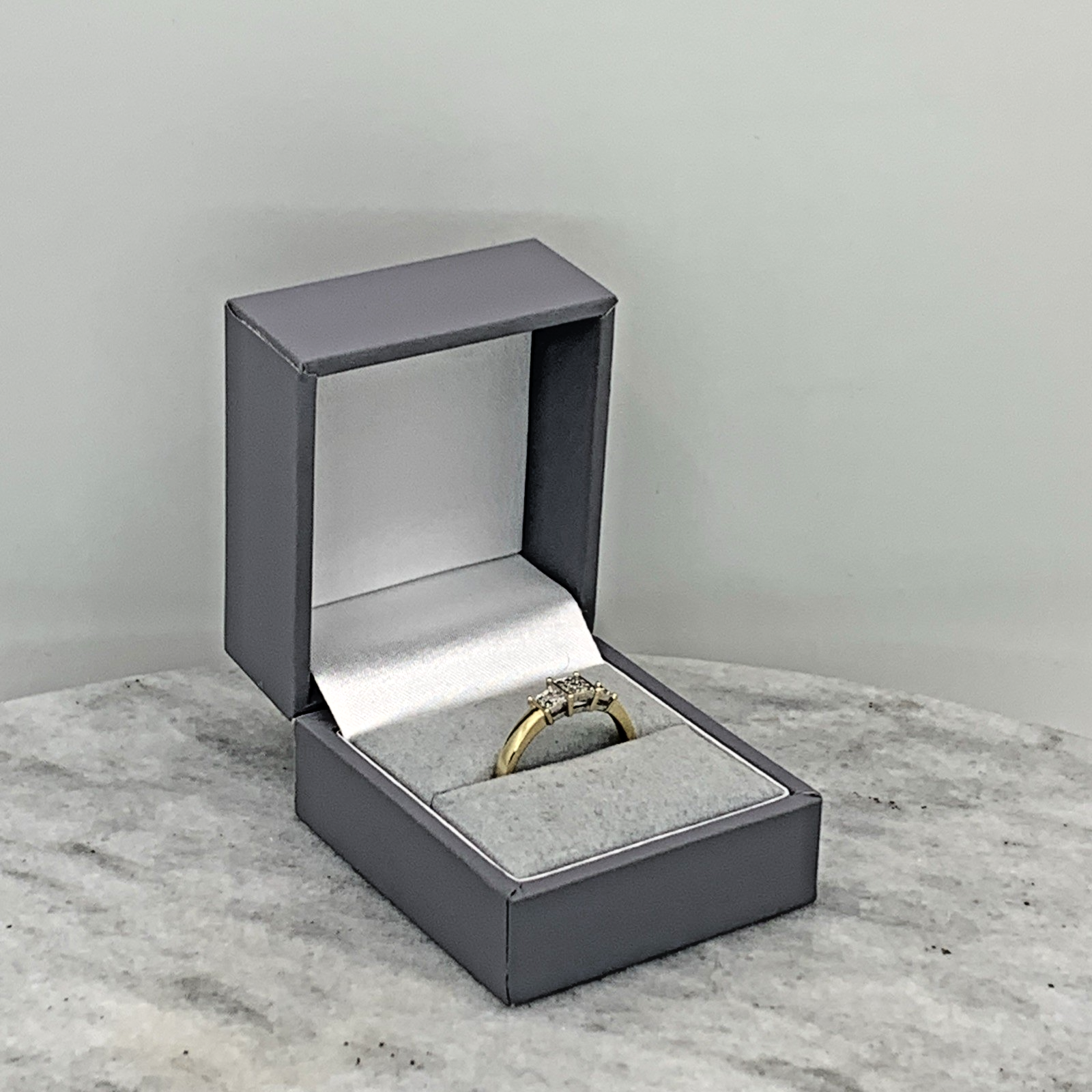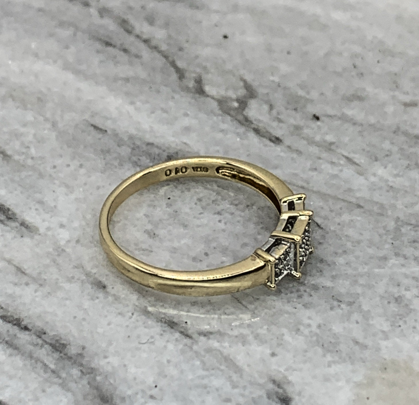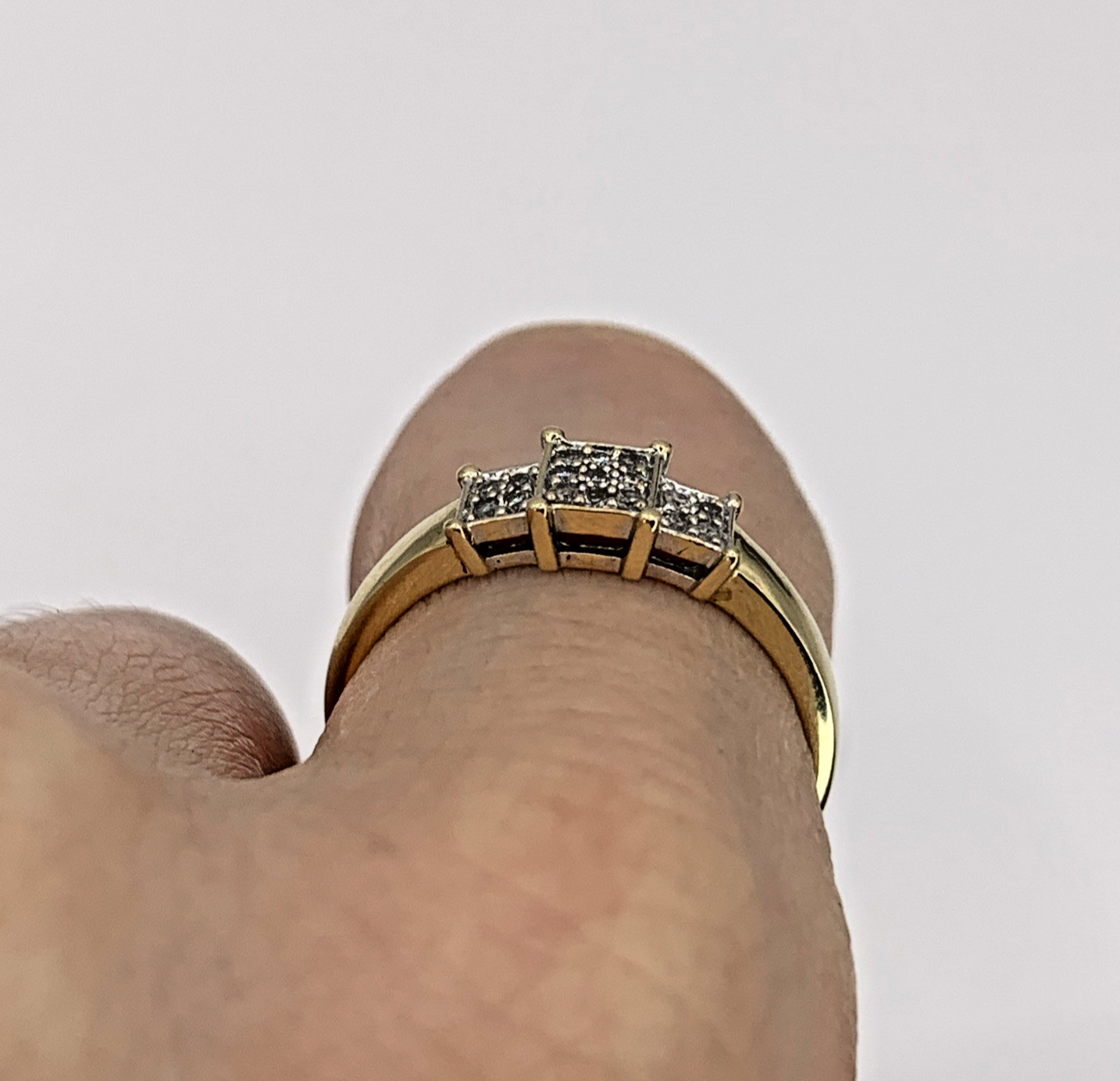 A beautiful gold ring featuring three square shaped clusters of invisible set diamonds.
