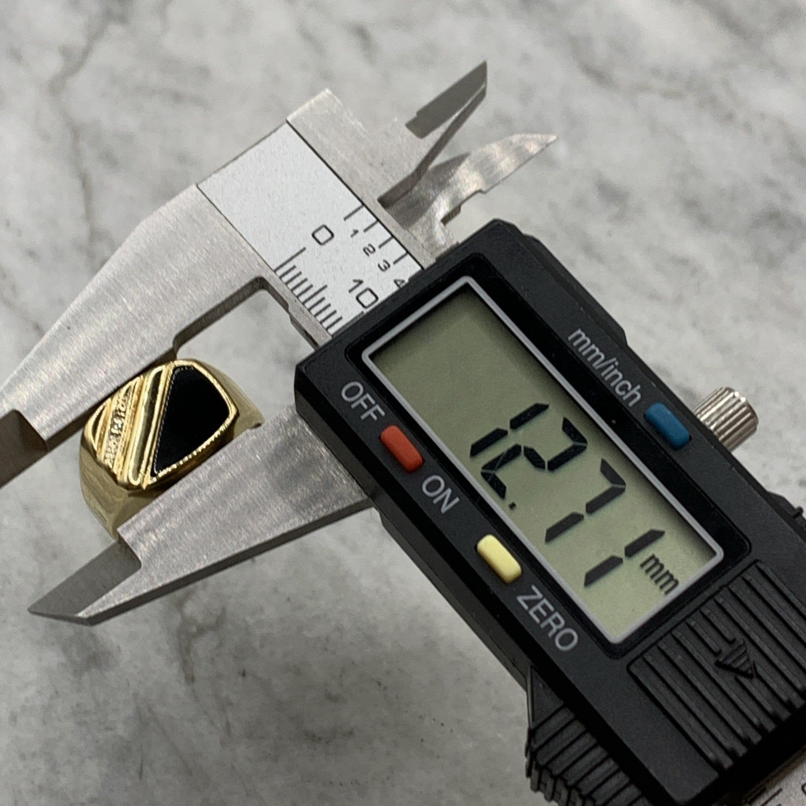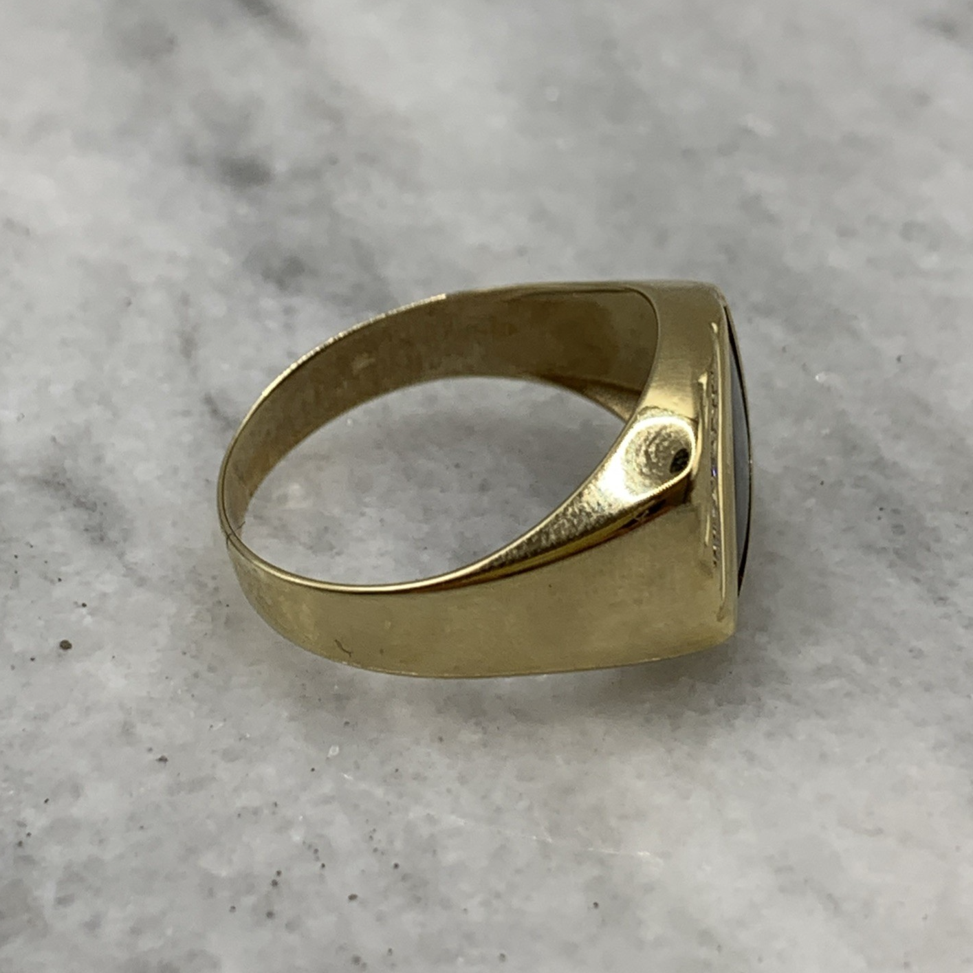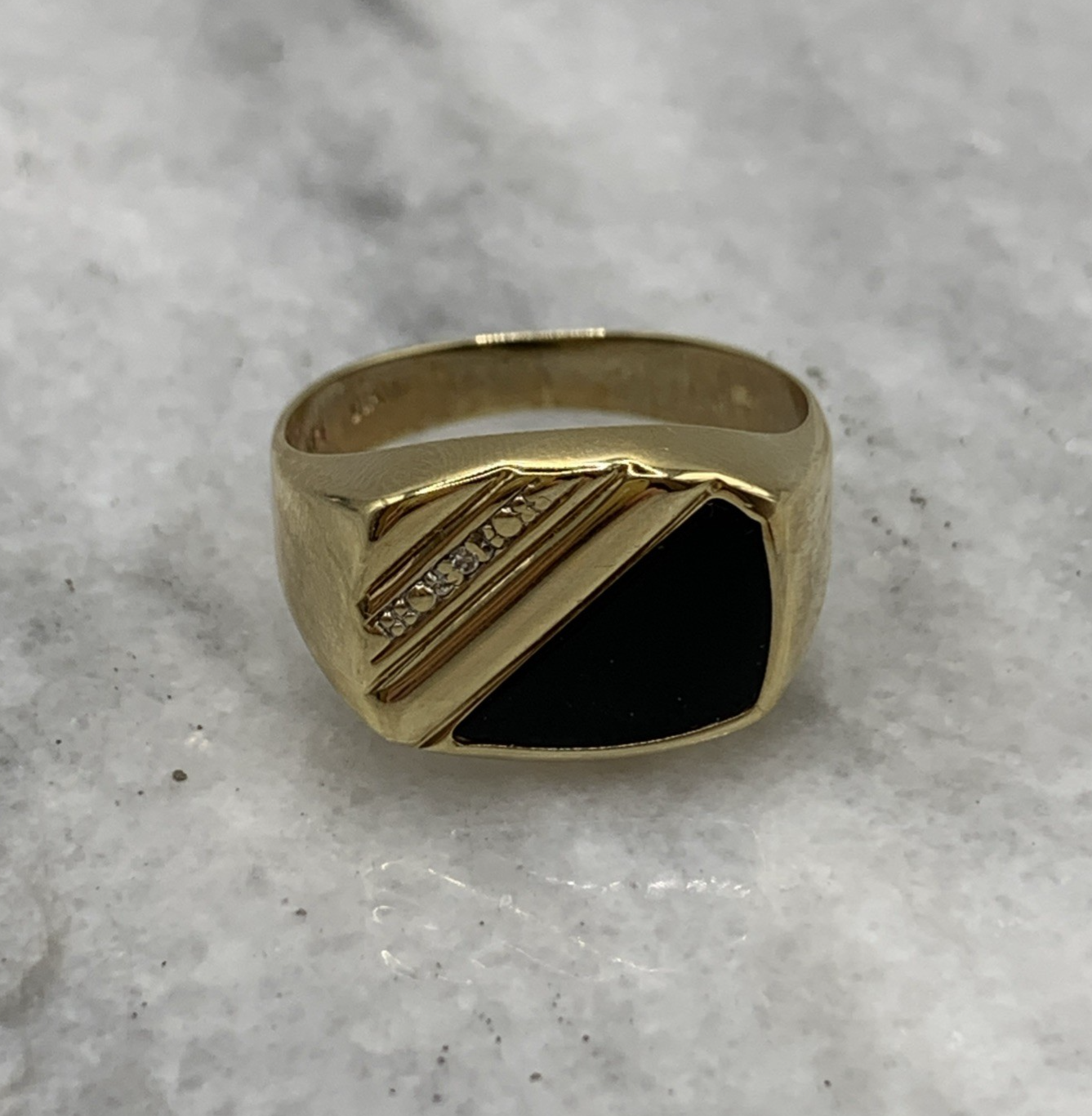 A stunning gold signet ring featuring striped patterns accented by a piece of onyx and a petite bar set diamond.