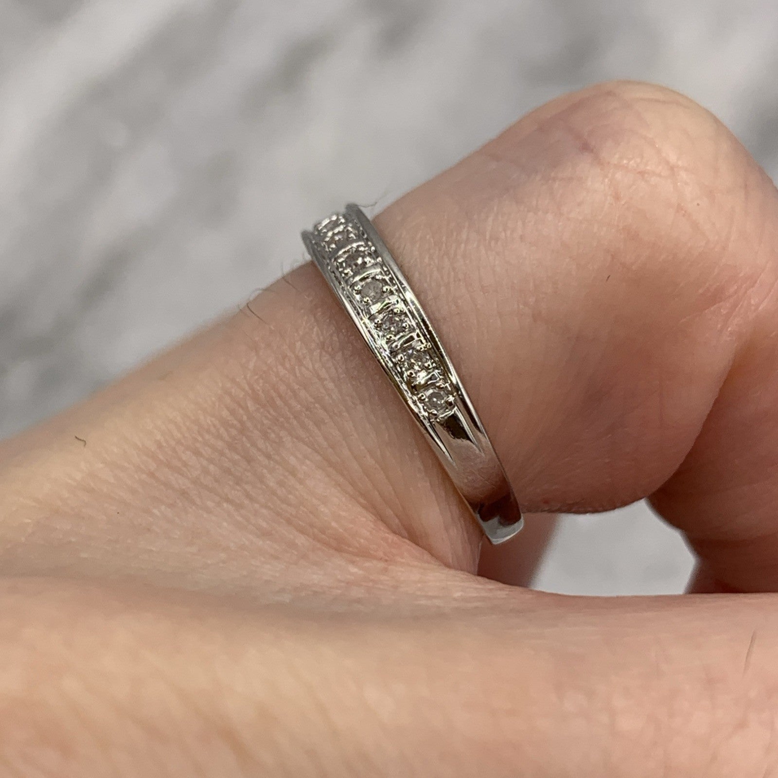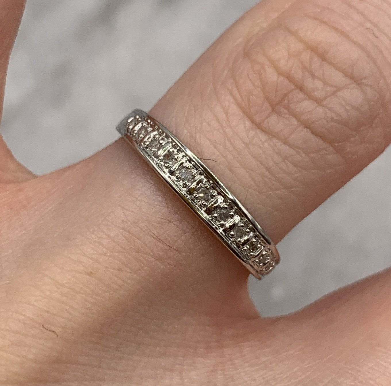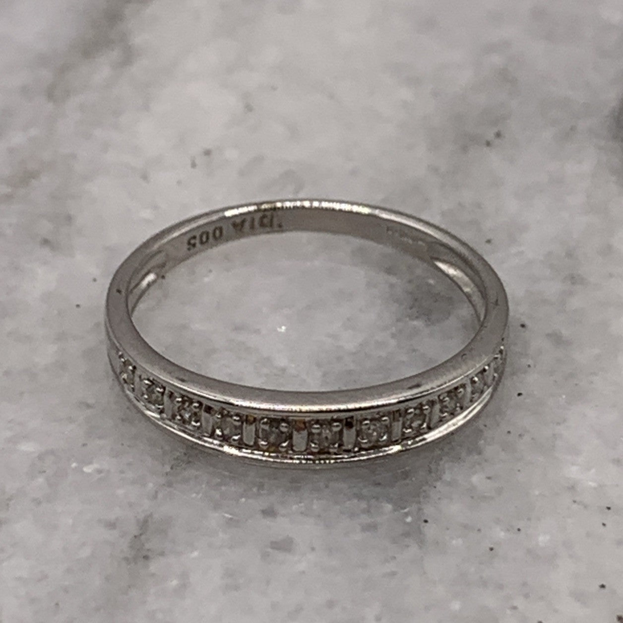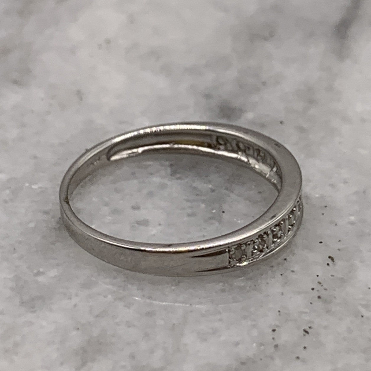 A lovely white gold band ring featuring 0.05ct petite pave set diamonds in the half eternity style.