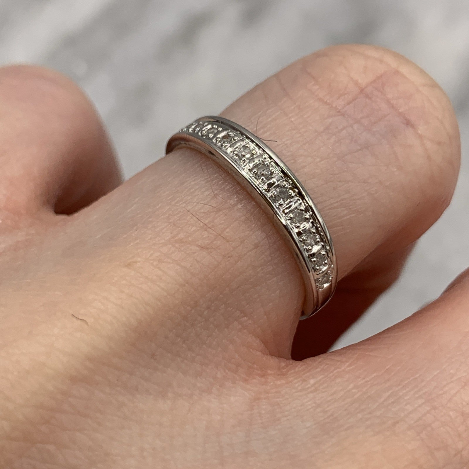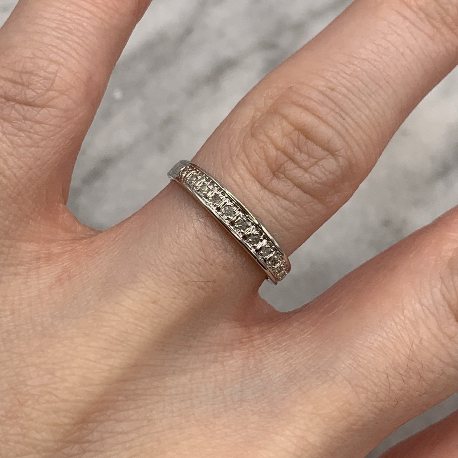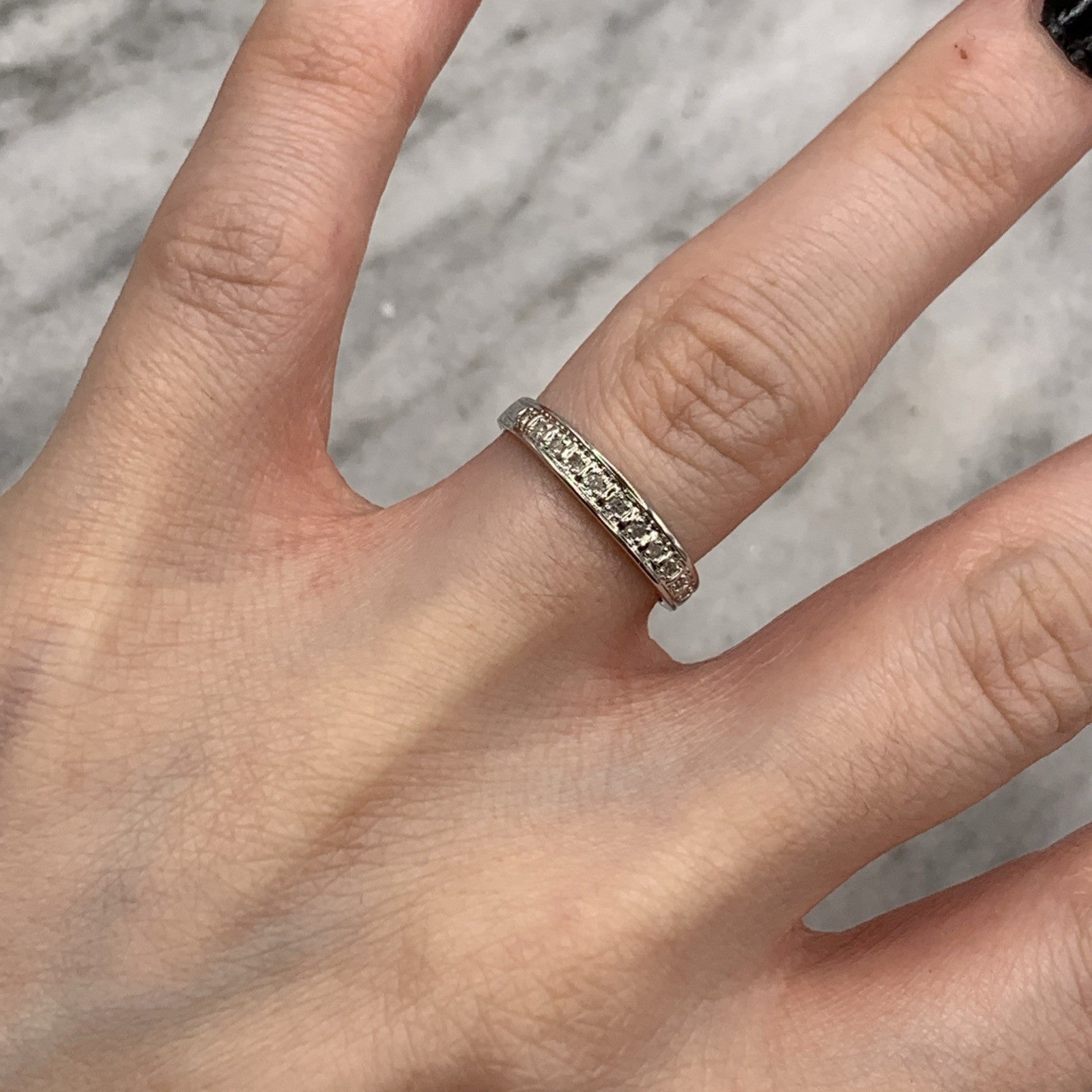 A lovely white gold band ring featuring 0.05ct petite pave set diamonds in the half eternity style.