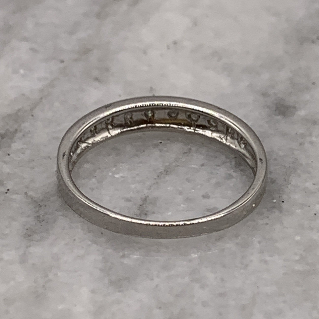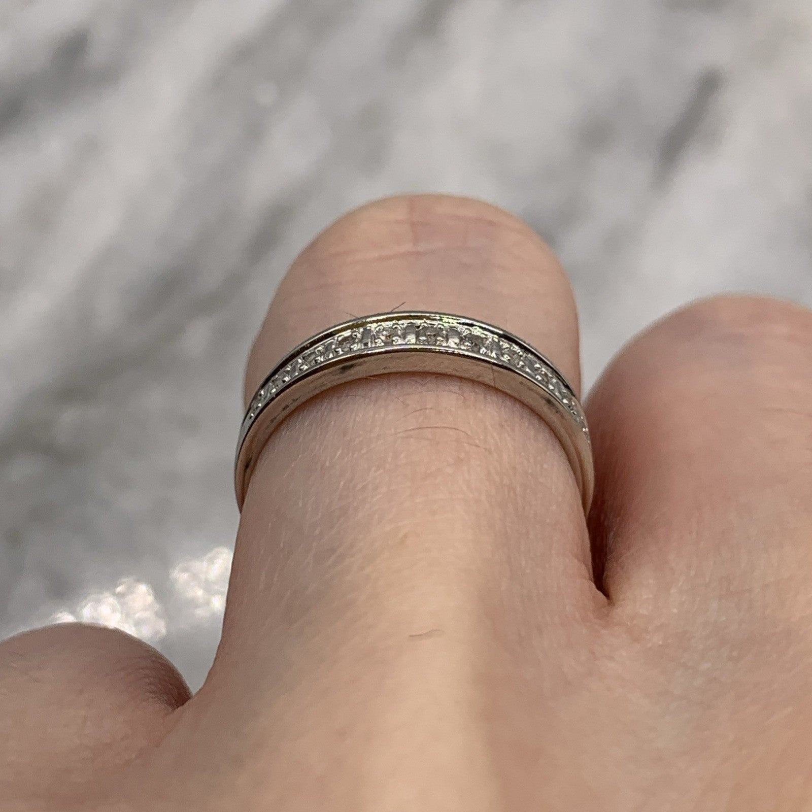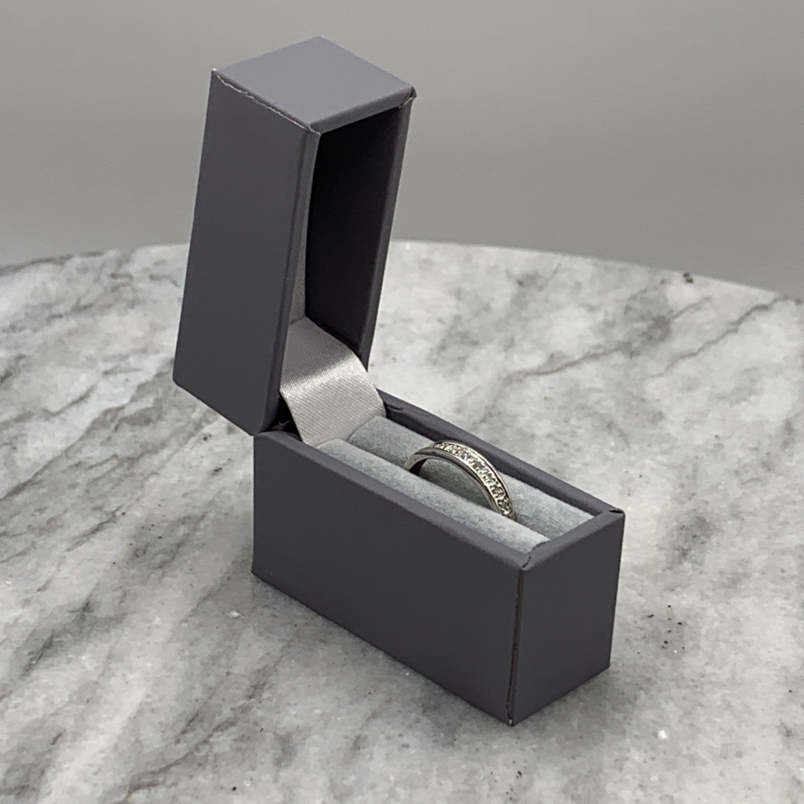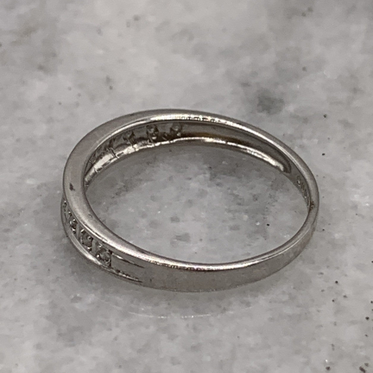A lovely white gold band ring featuring 0.05ct petite pave set diamonds in the half eternity style.