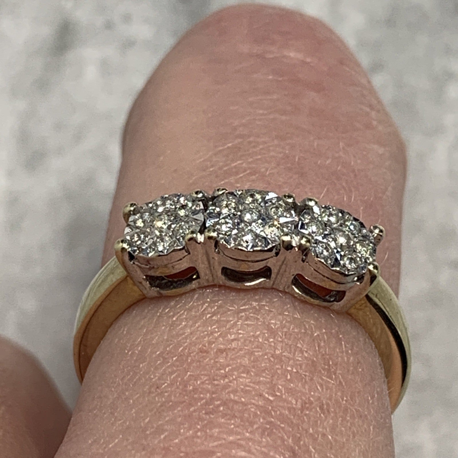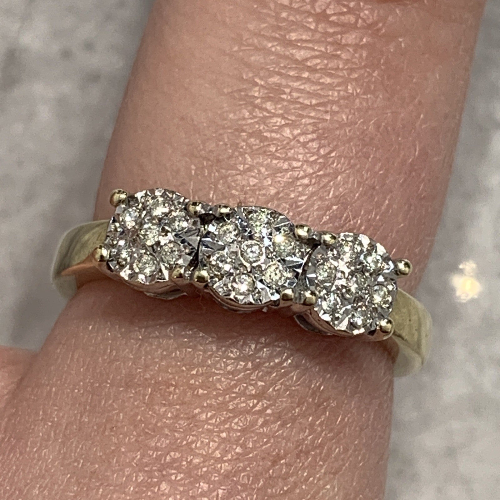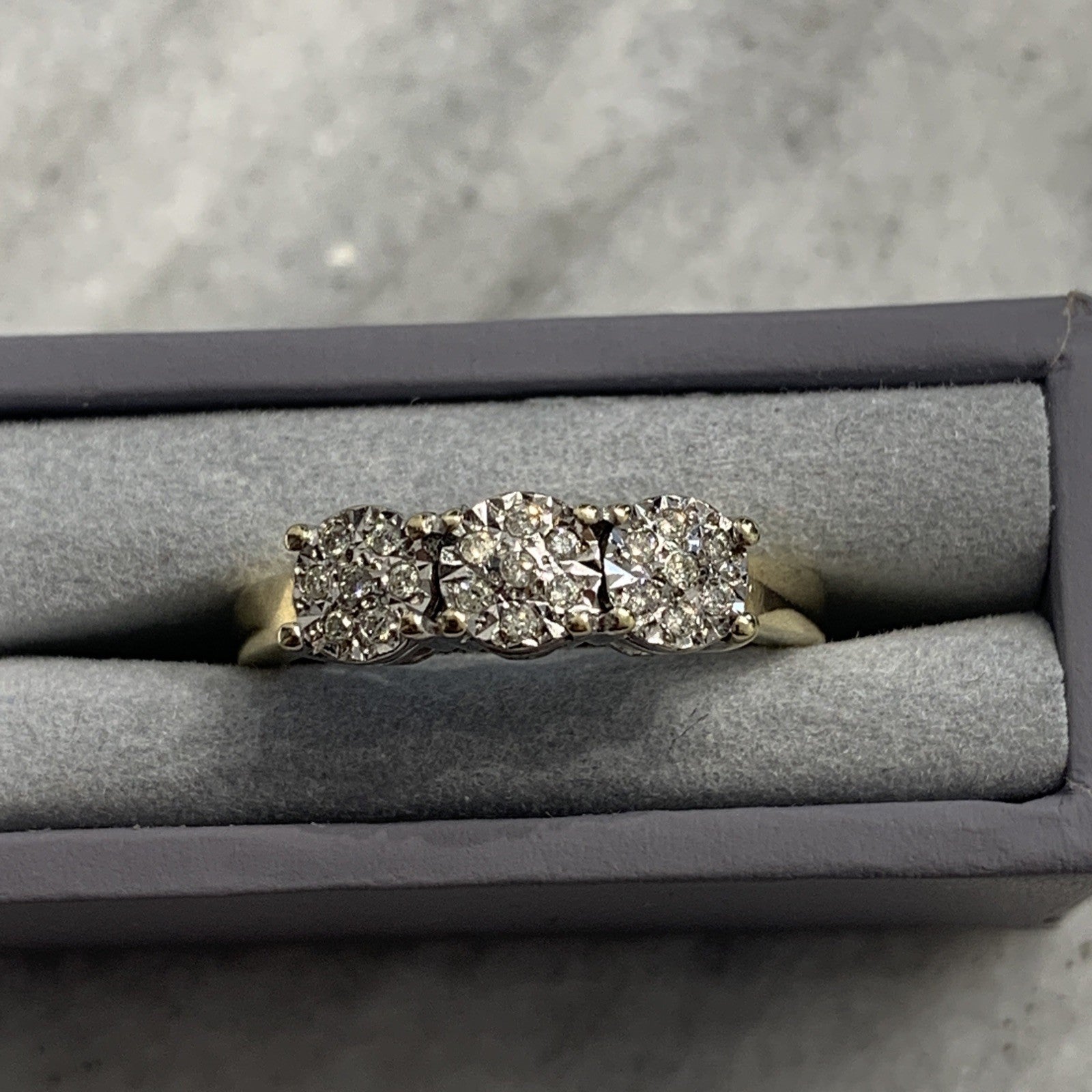9 ct Gold Diamond Ring .10ct Illusion Cluster Trilogy 375 Yellow Gold - Size N