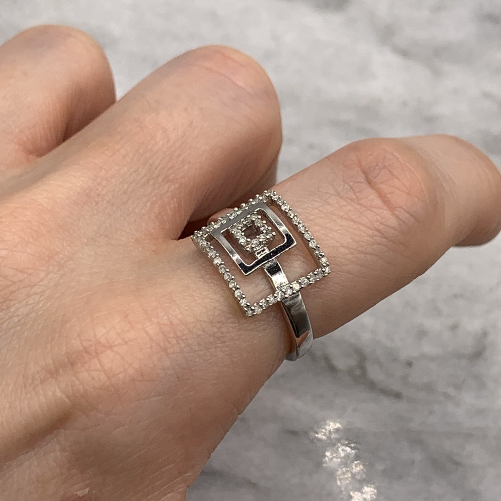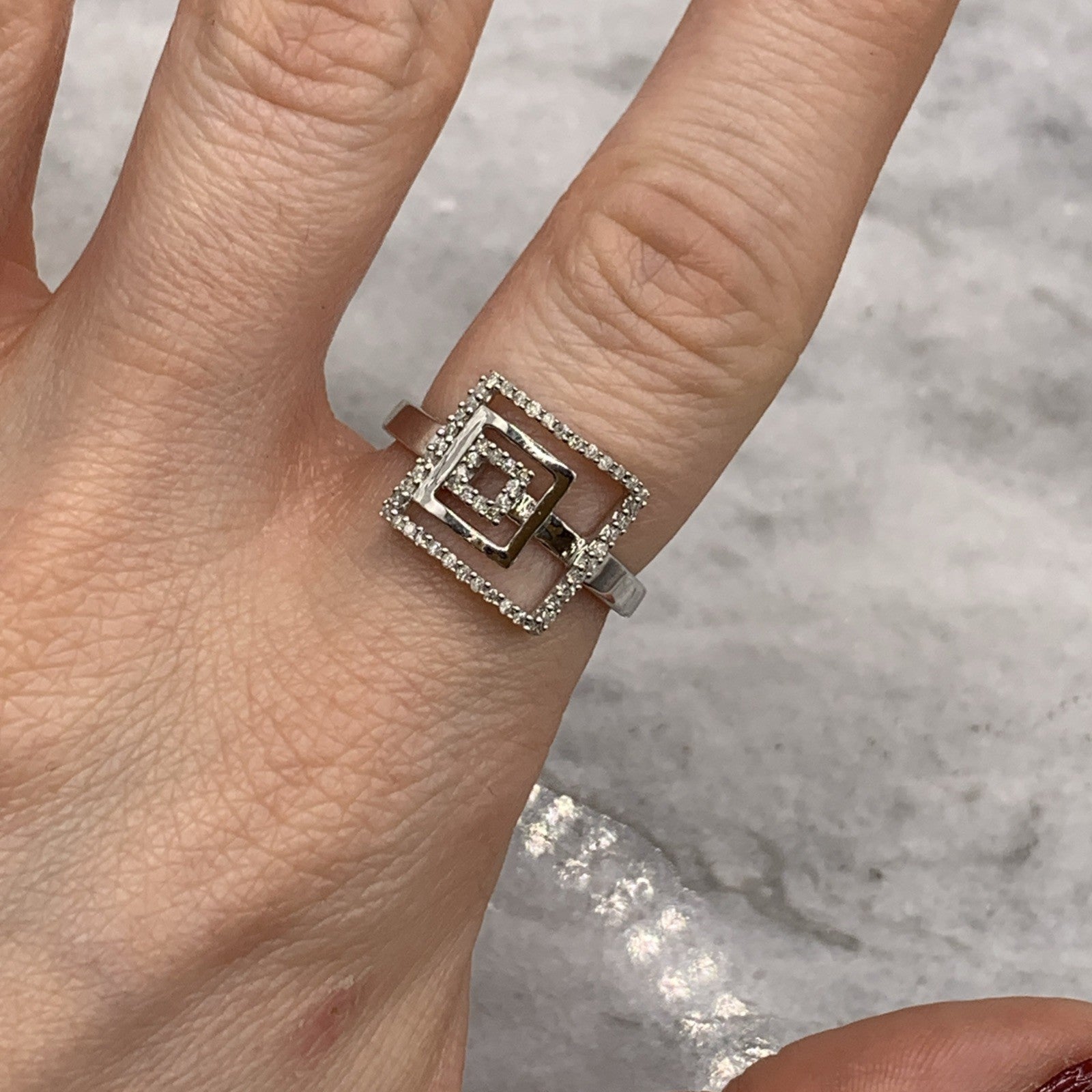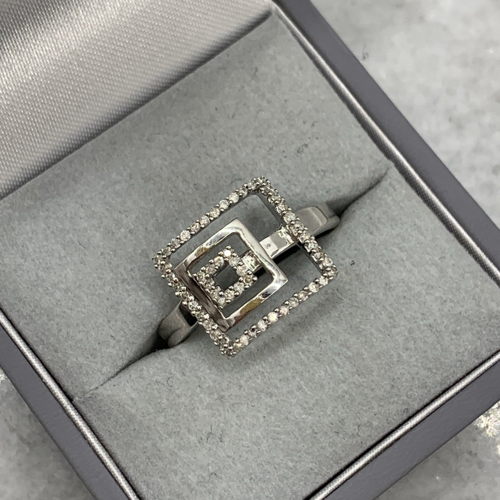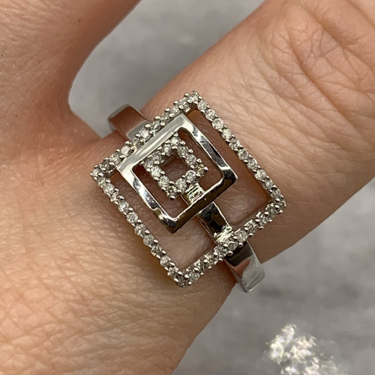 A unique white gold ring featuring abstract square motifs adorned with petite pave set diamonds.