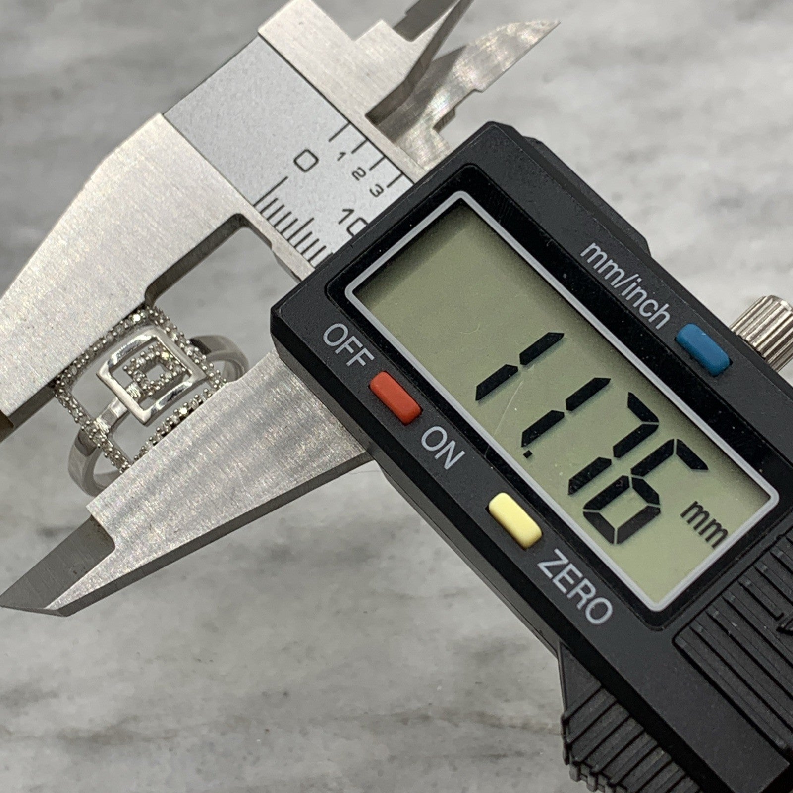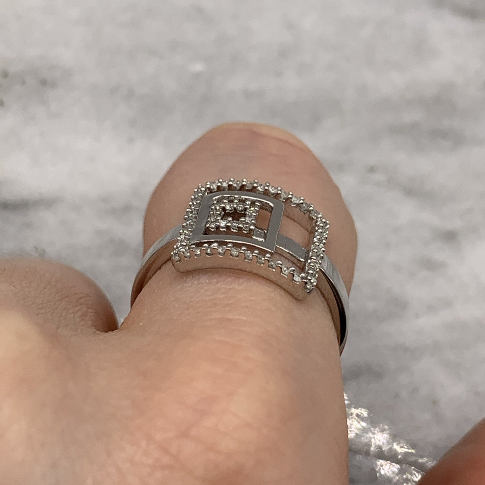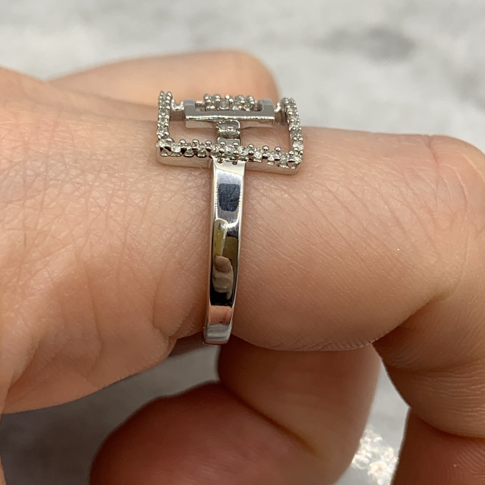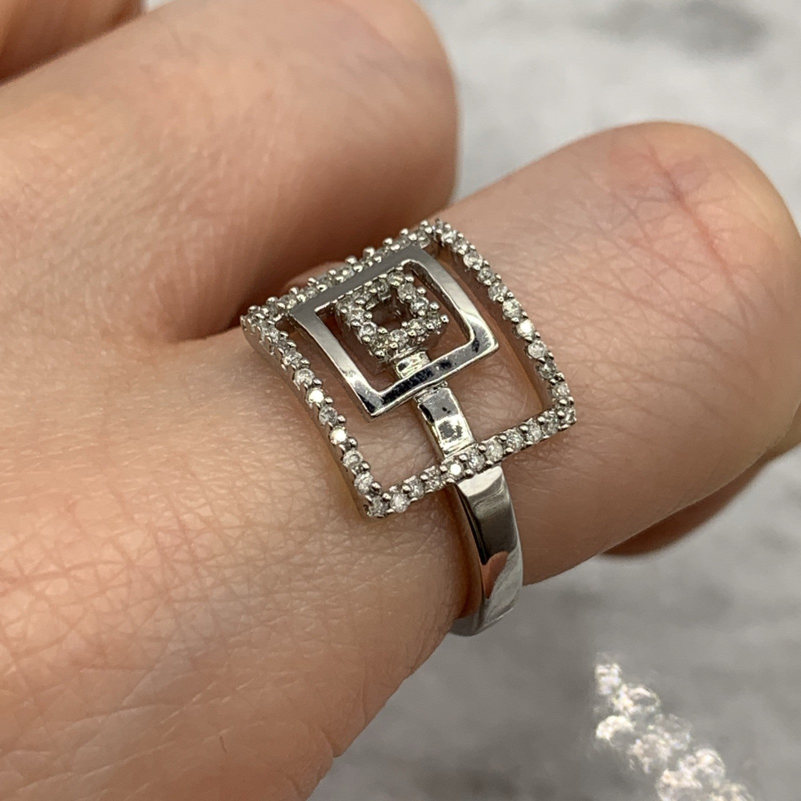 A unique white gold ring featuring abstract square motifs adorned with petite pave set diamonds.