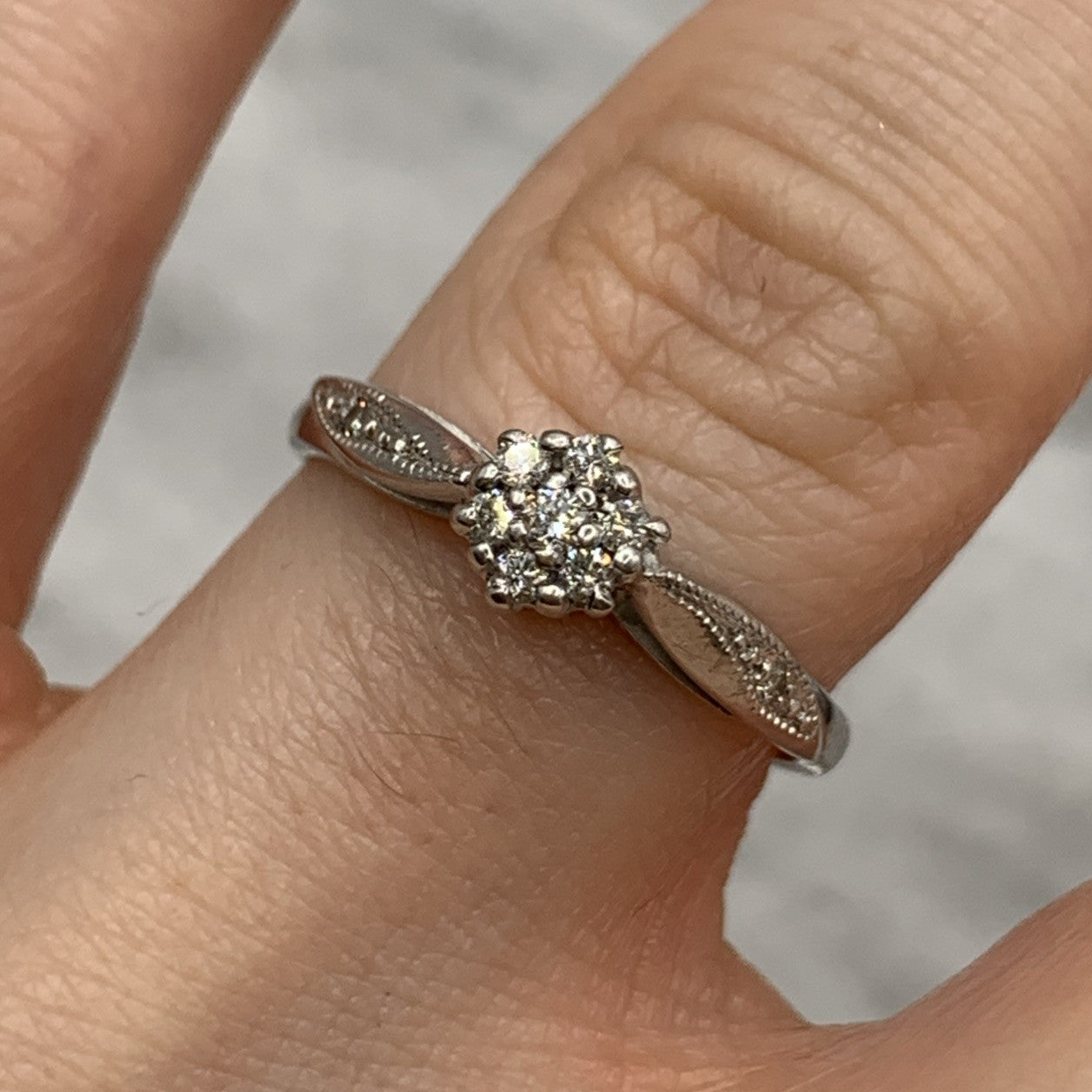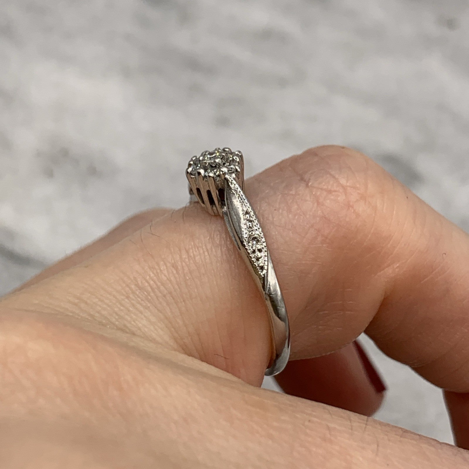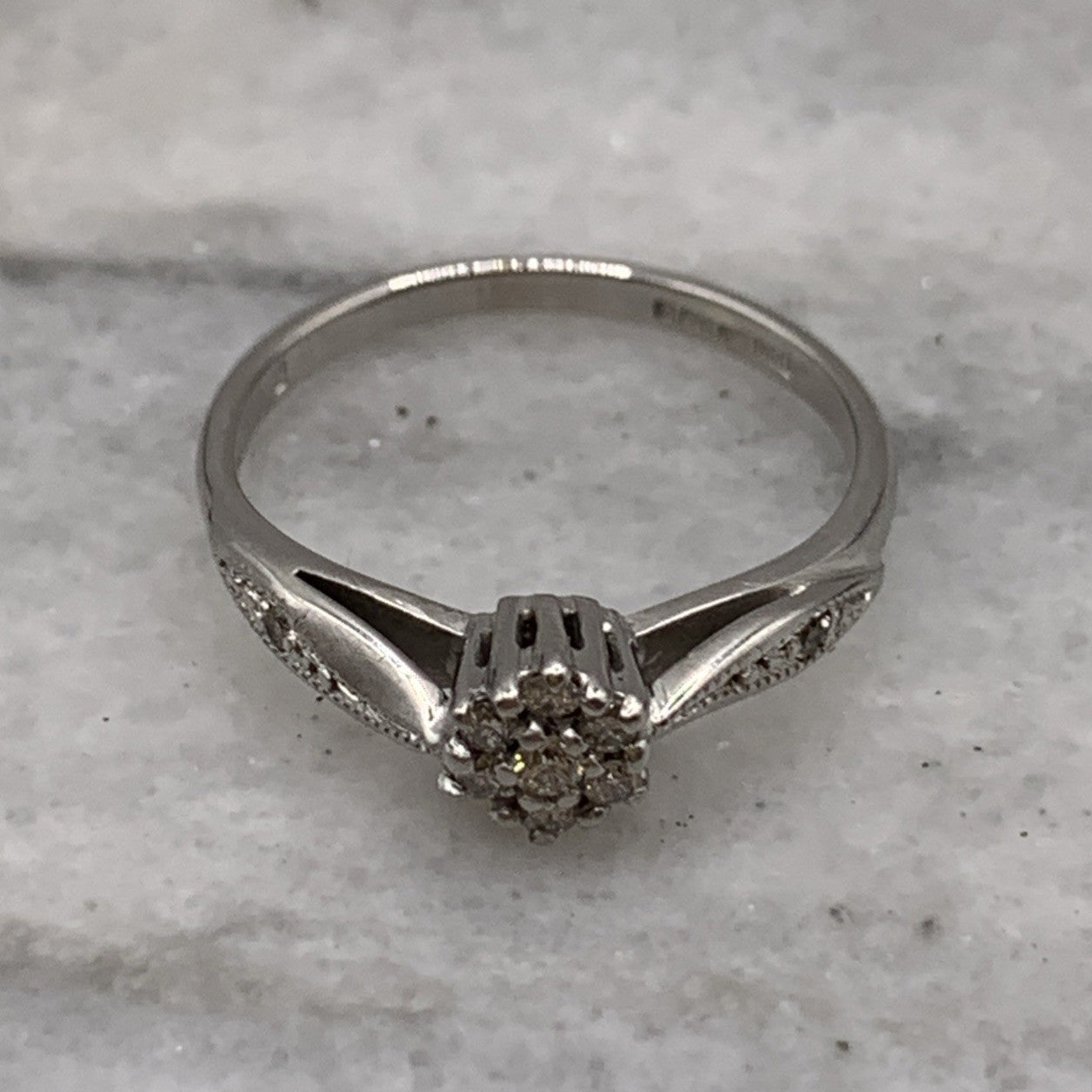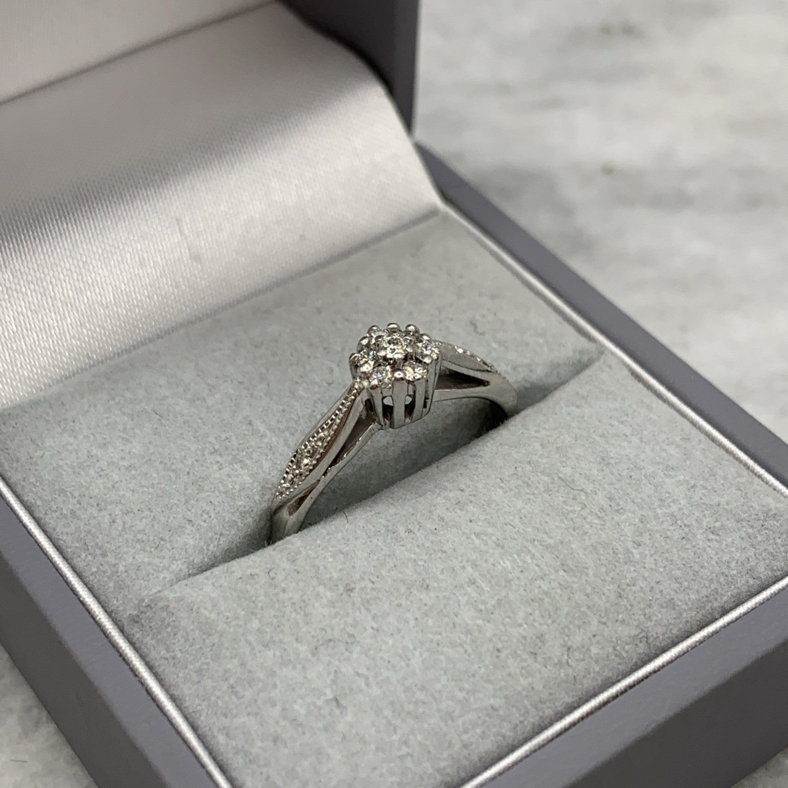 9 ct Gold Diamond Ring Cluster Milgrain Shoulder 375 White Gold - Size M