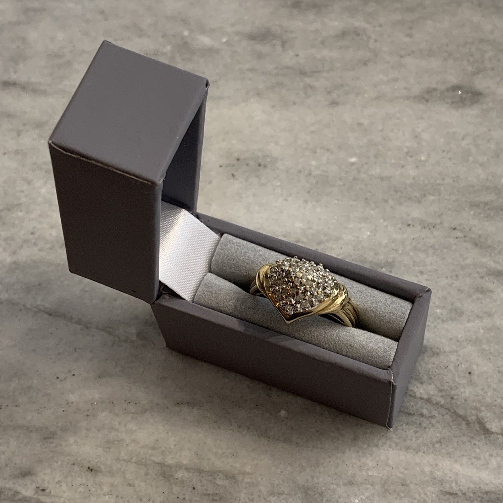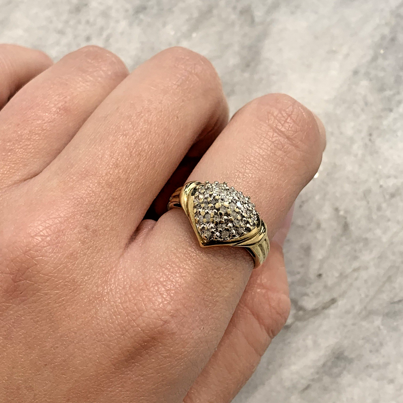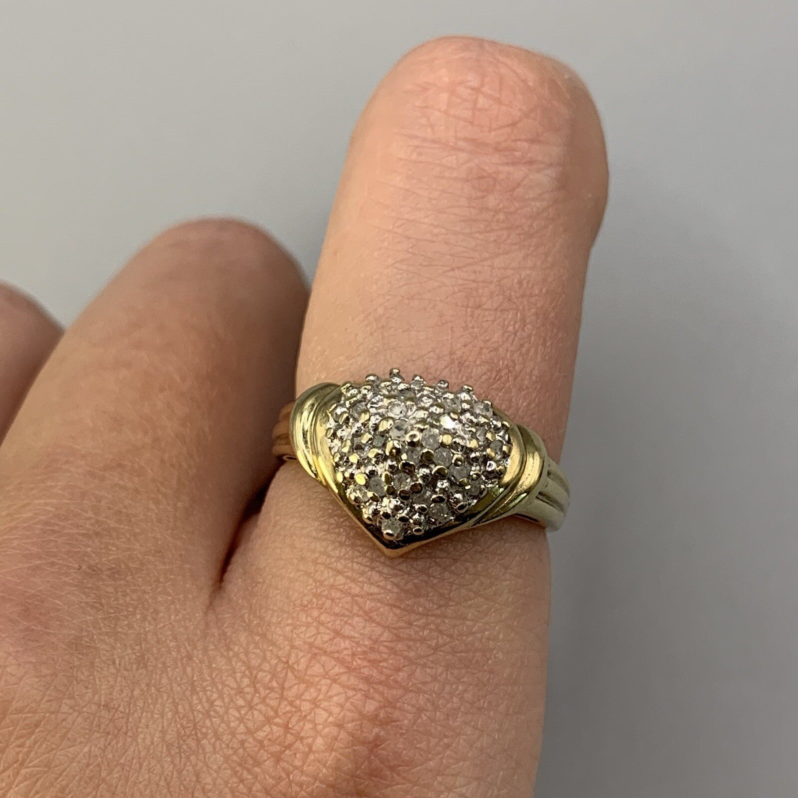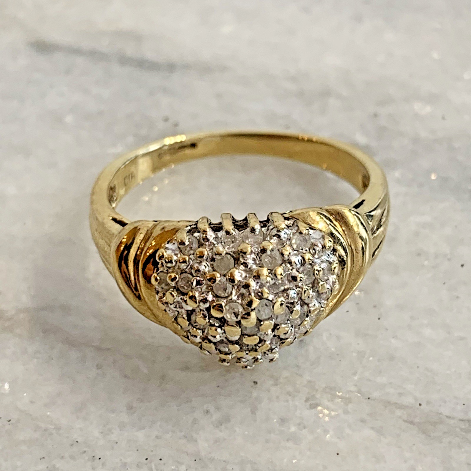 A beautiful gold ring showcasing an ornate heart shaped cluster of petite diamonds.