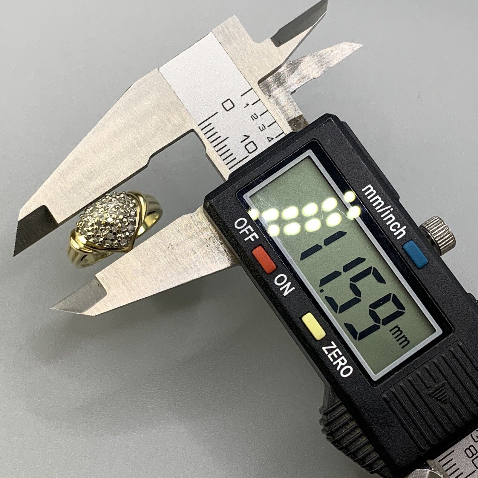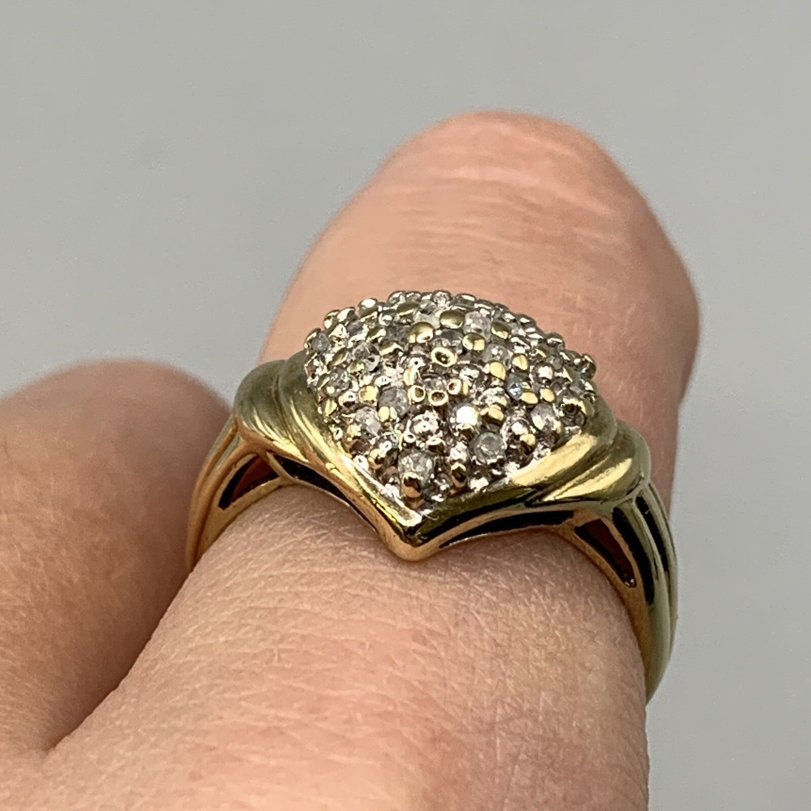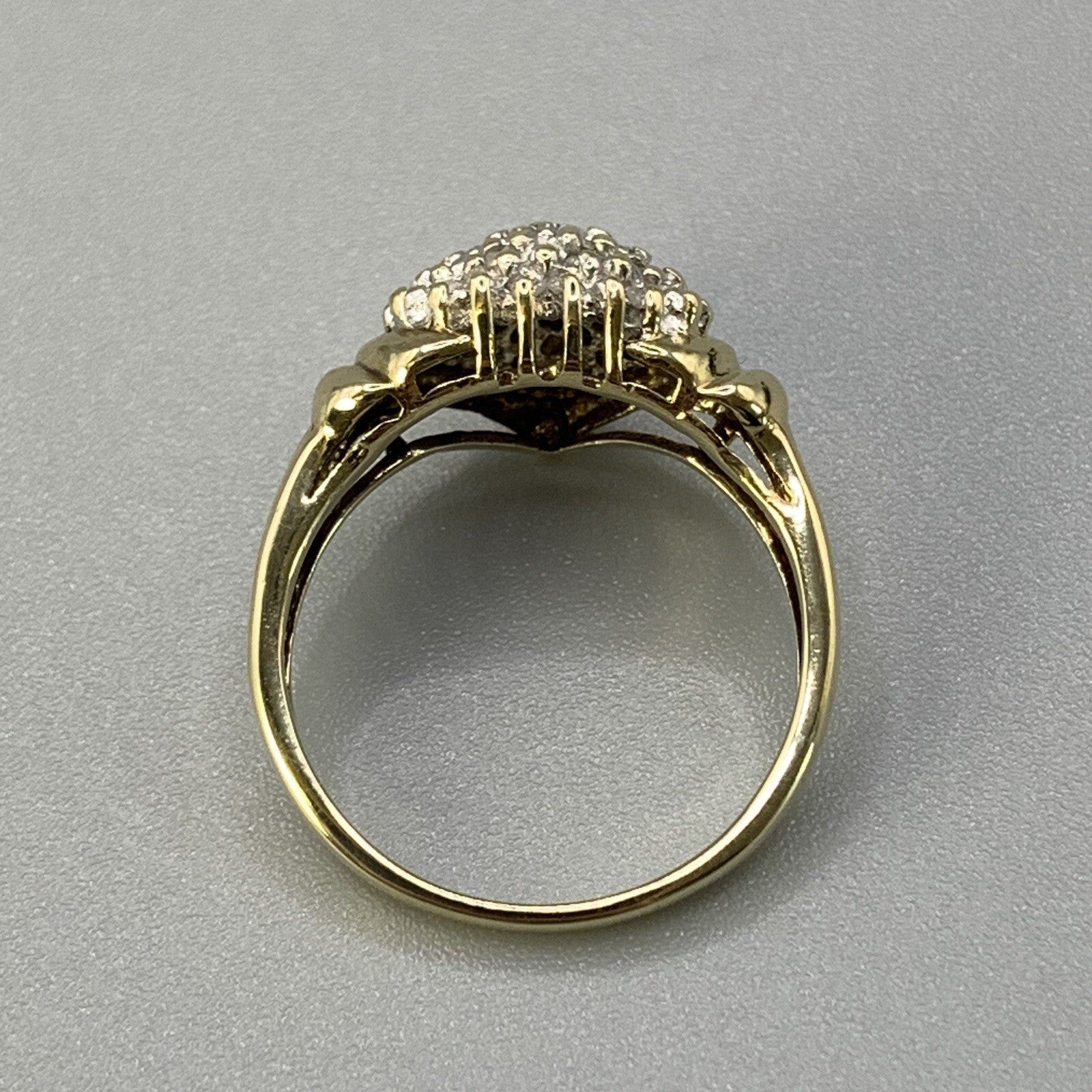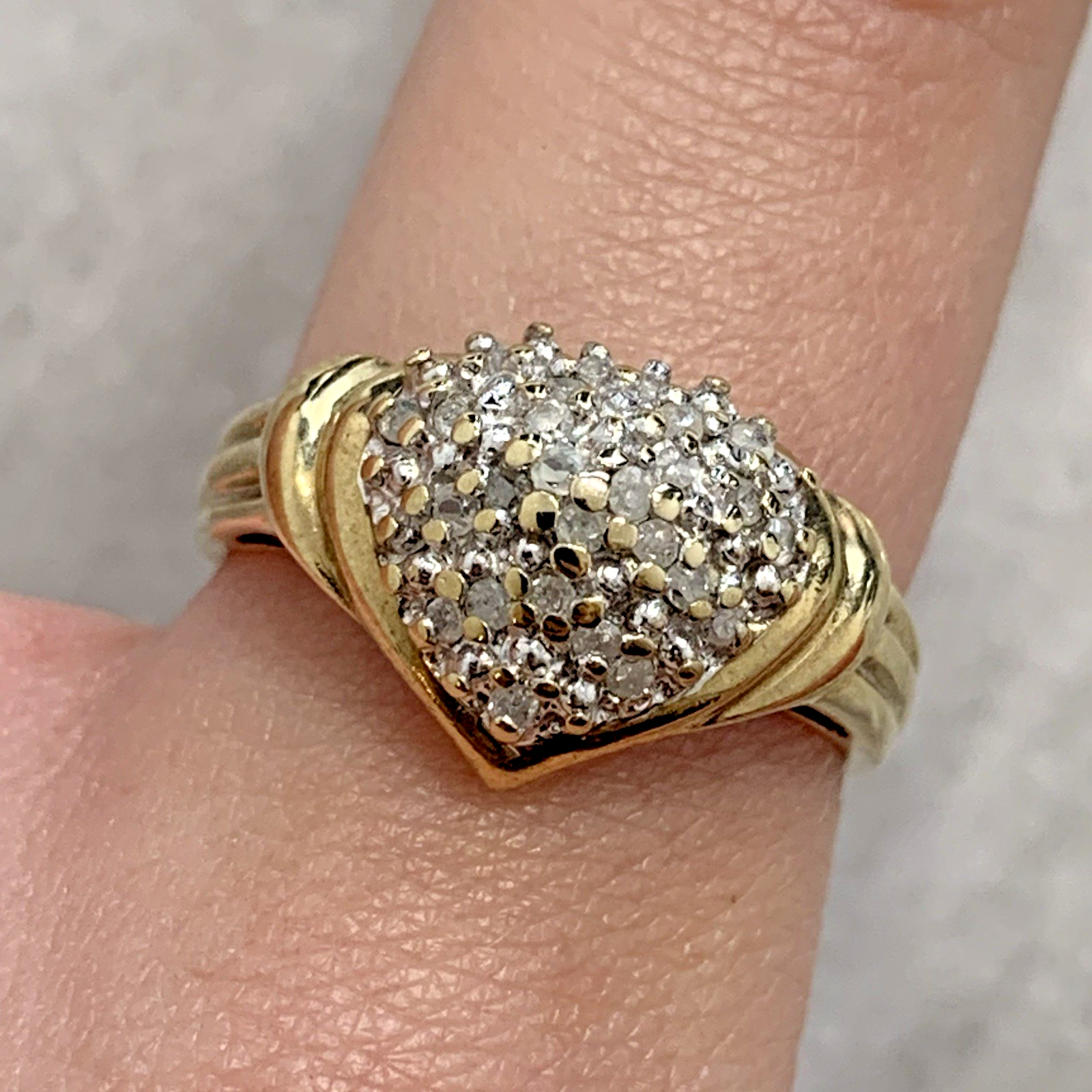 A beautiful gold ring showcasing an ornate heart shaped cluster of petite diamonds.