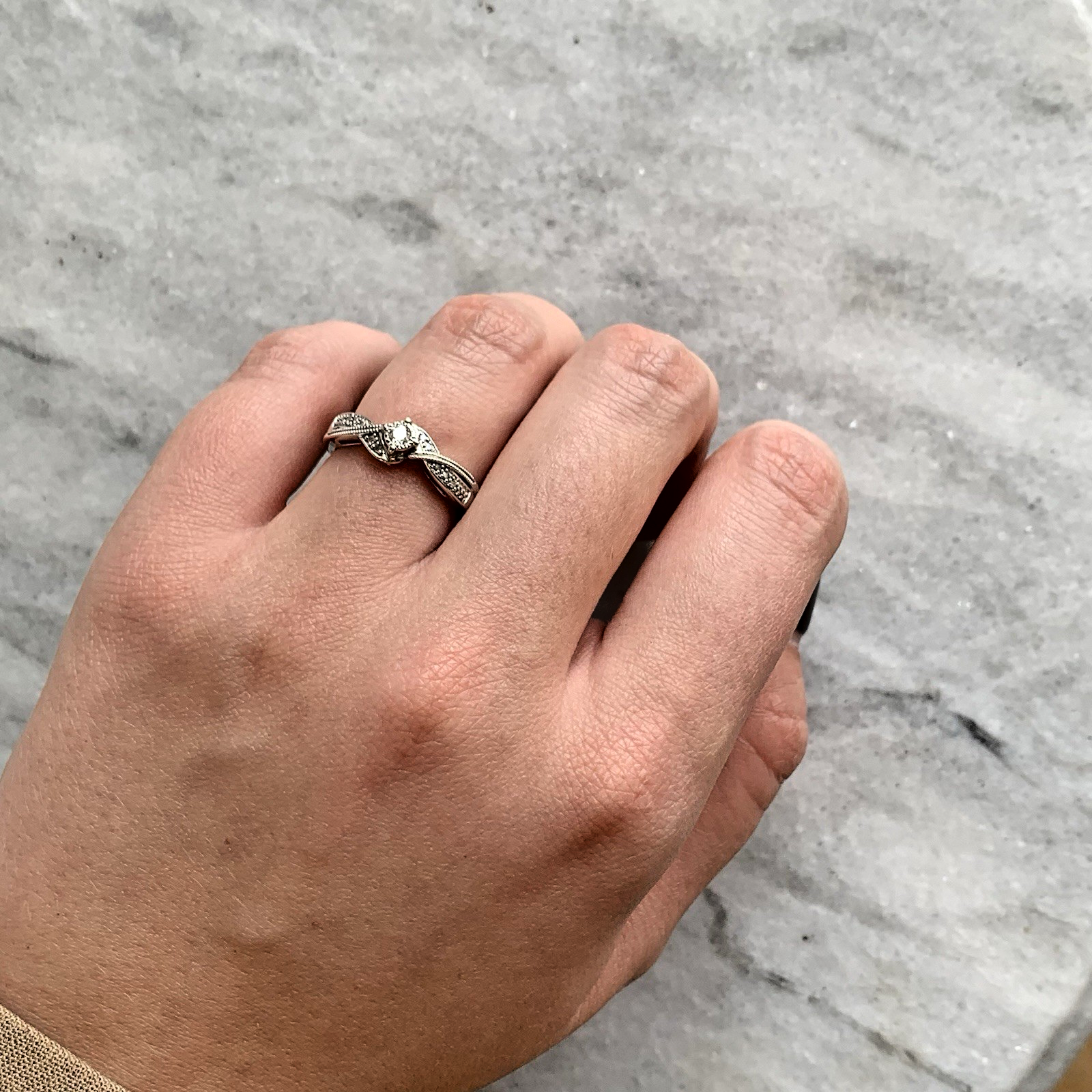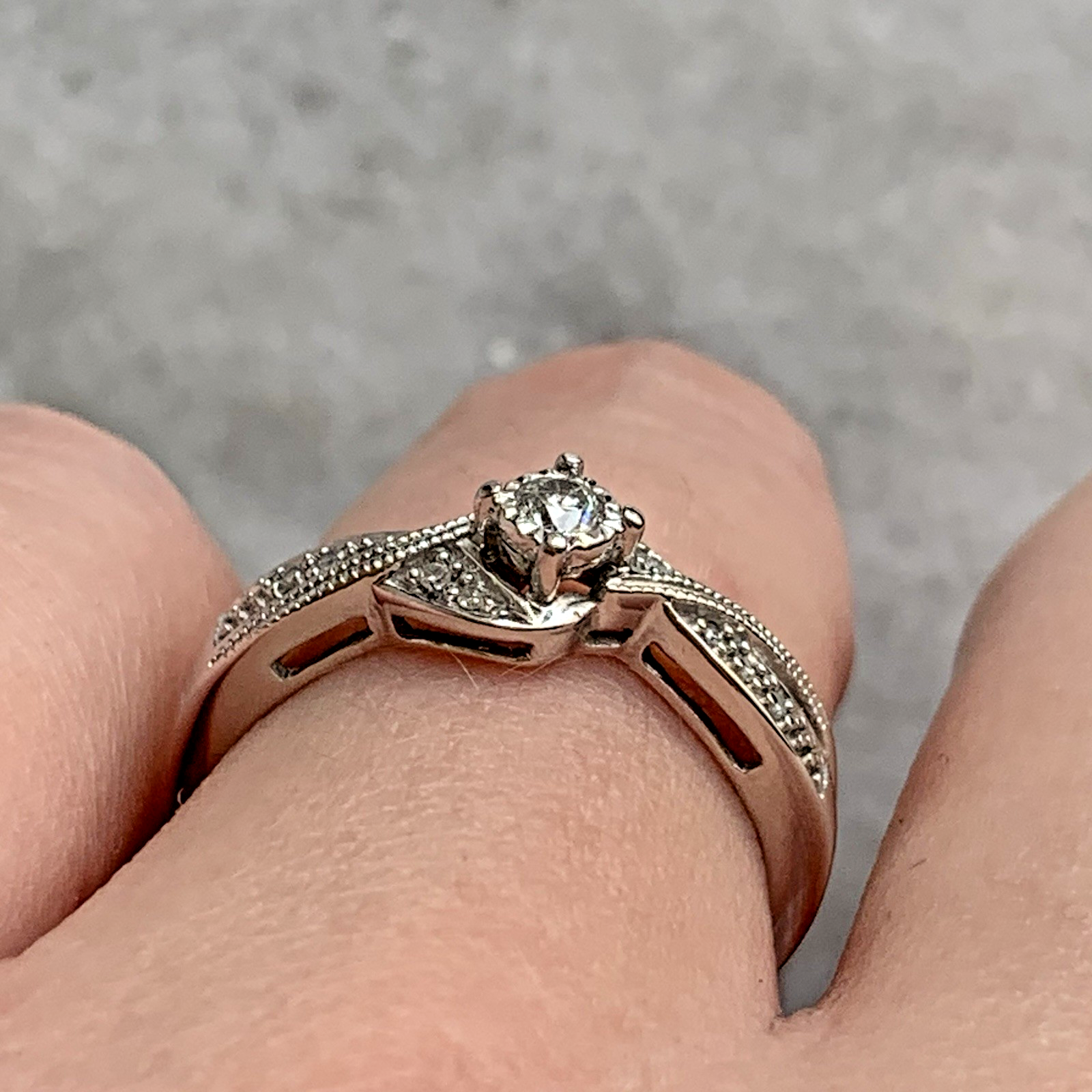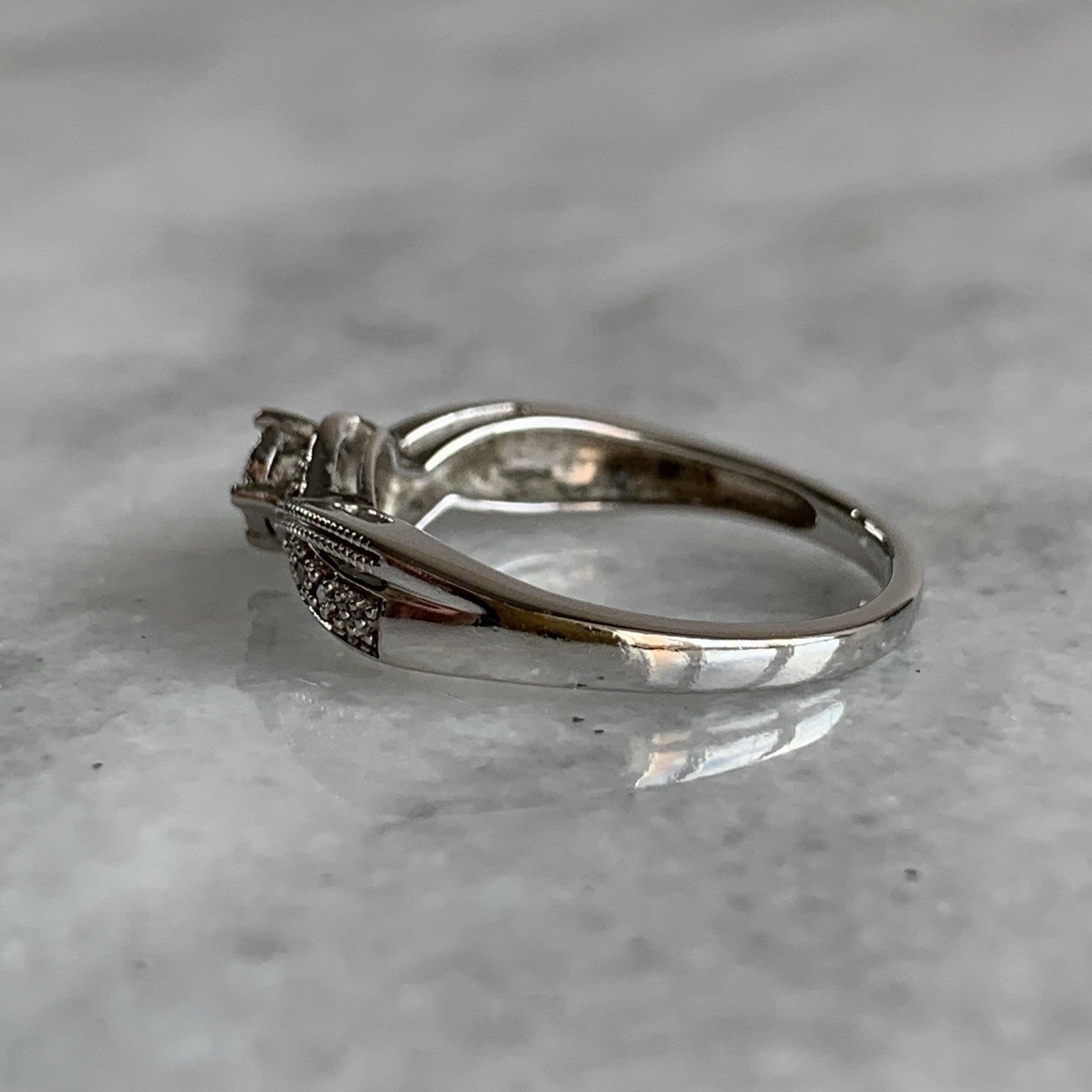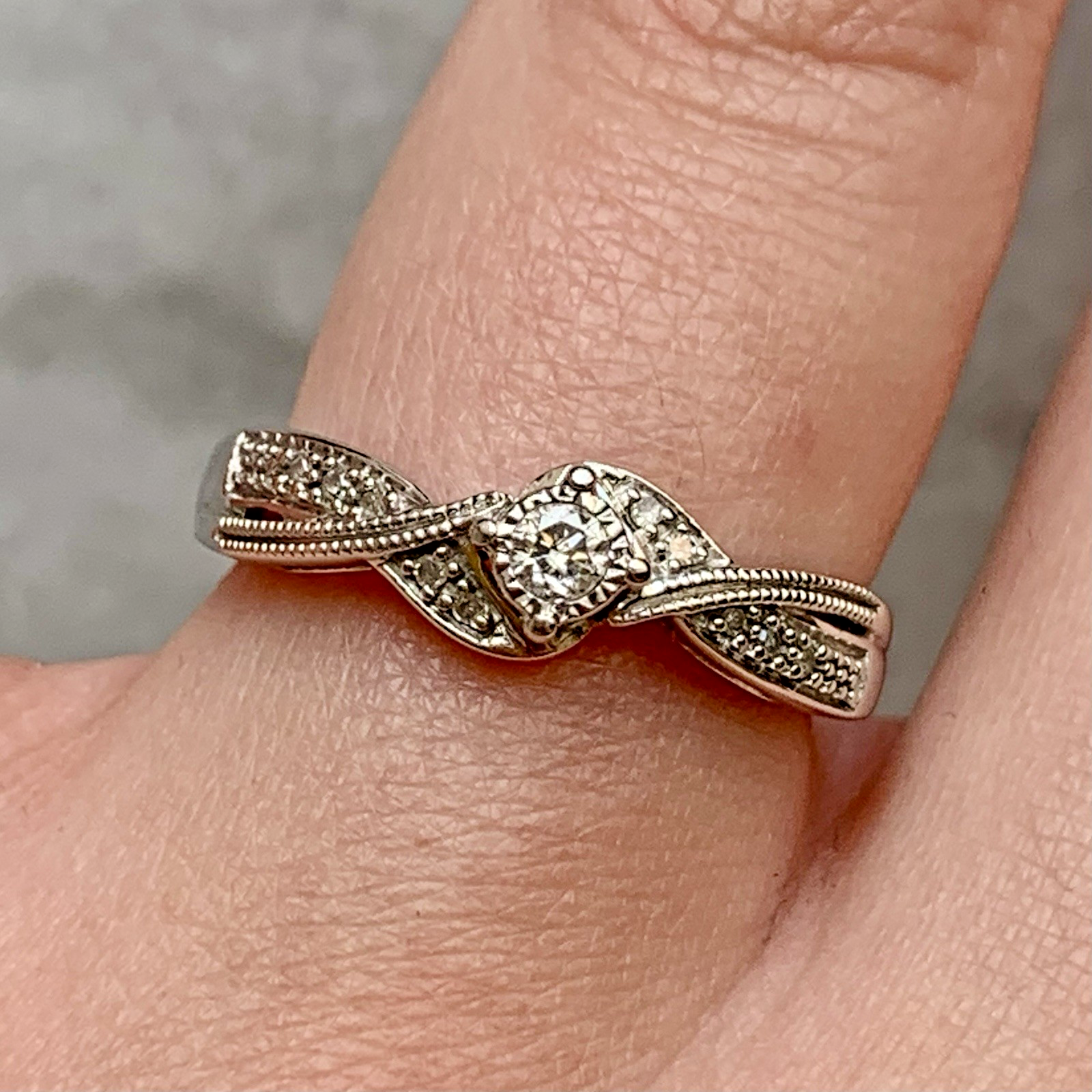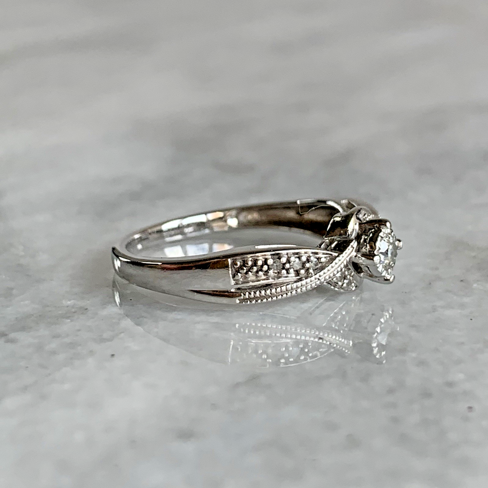 A gorgeous ring featuring a central solitaire diamond accented by twisted shoulders with a milgrain design and further pave set diamonds. Diamond carat weight .10ct.