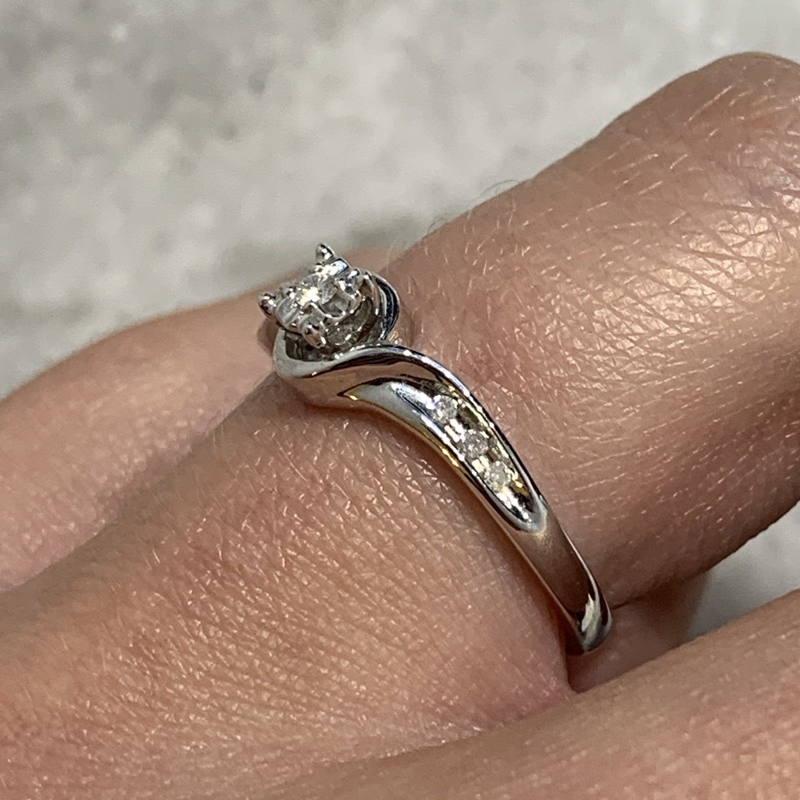 - A stunning white gold ring showcasing a solitaire diamond within a bypass style setting, accented by additional petite diamonds on the shoulders in a channel setting.
