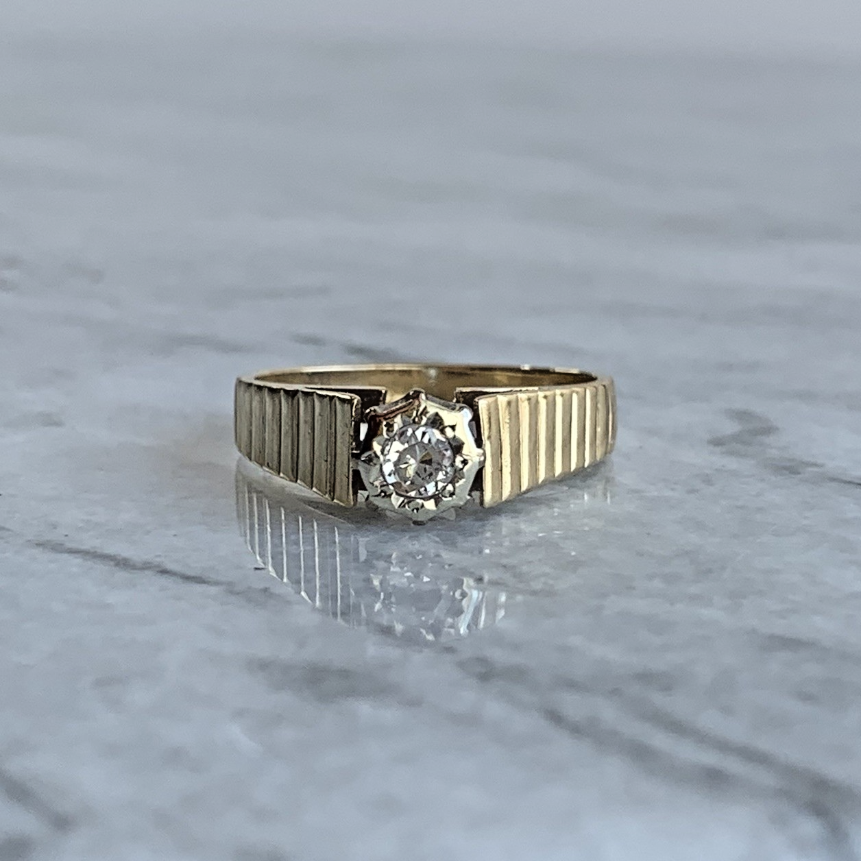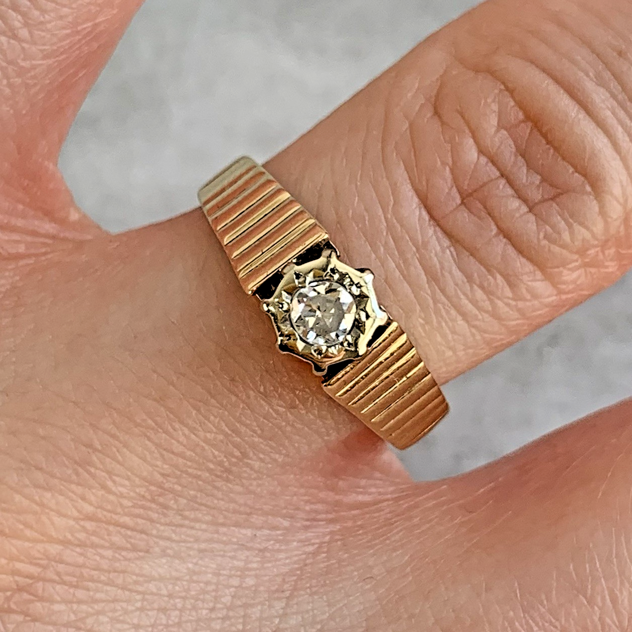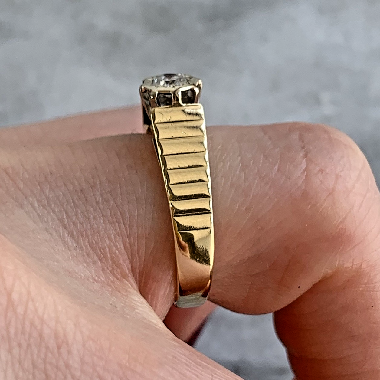 A beautiful gold ring showcasing a solitaire illusion set diamond upon antique style shoulders with a textured finish.