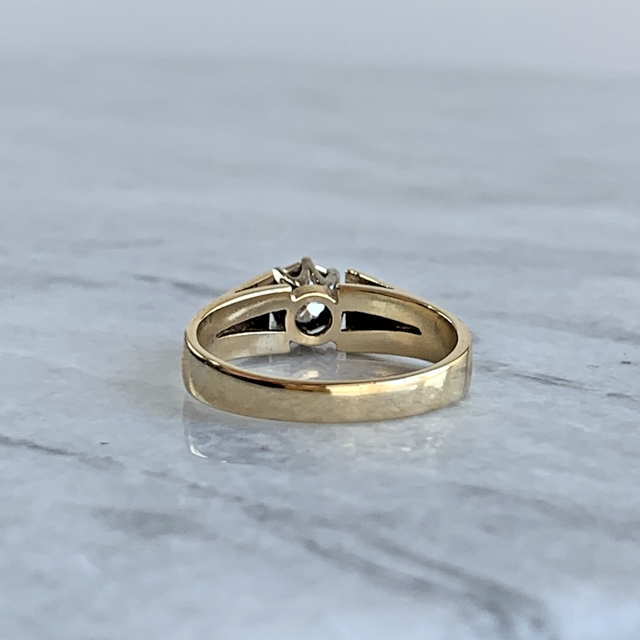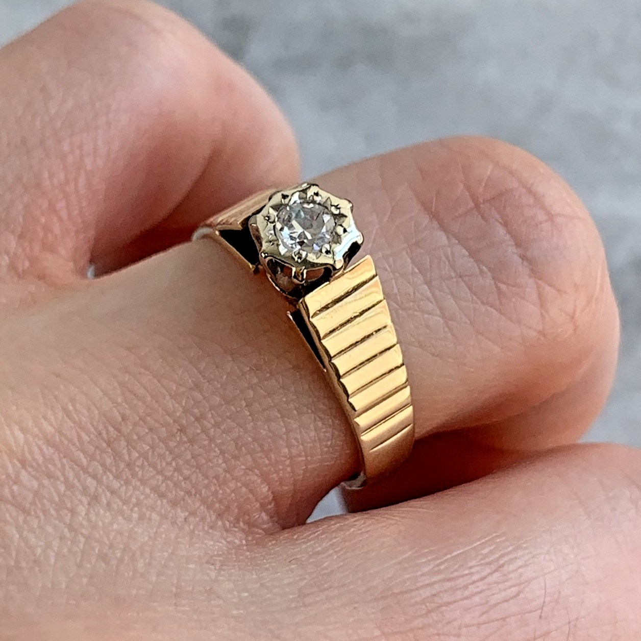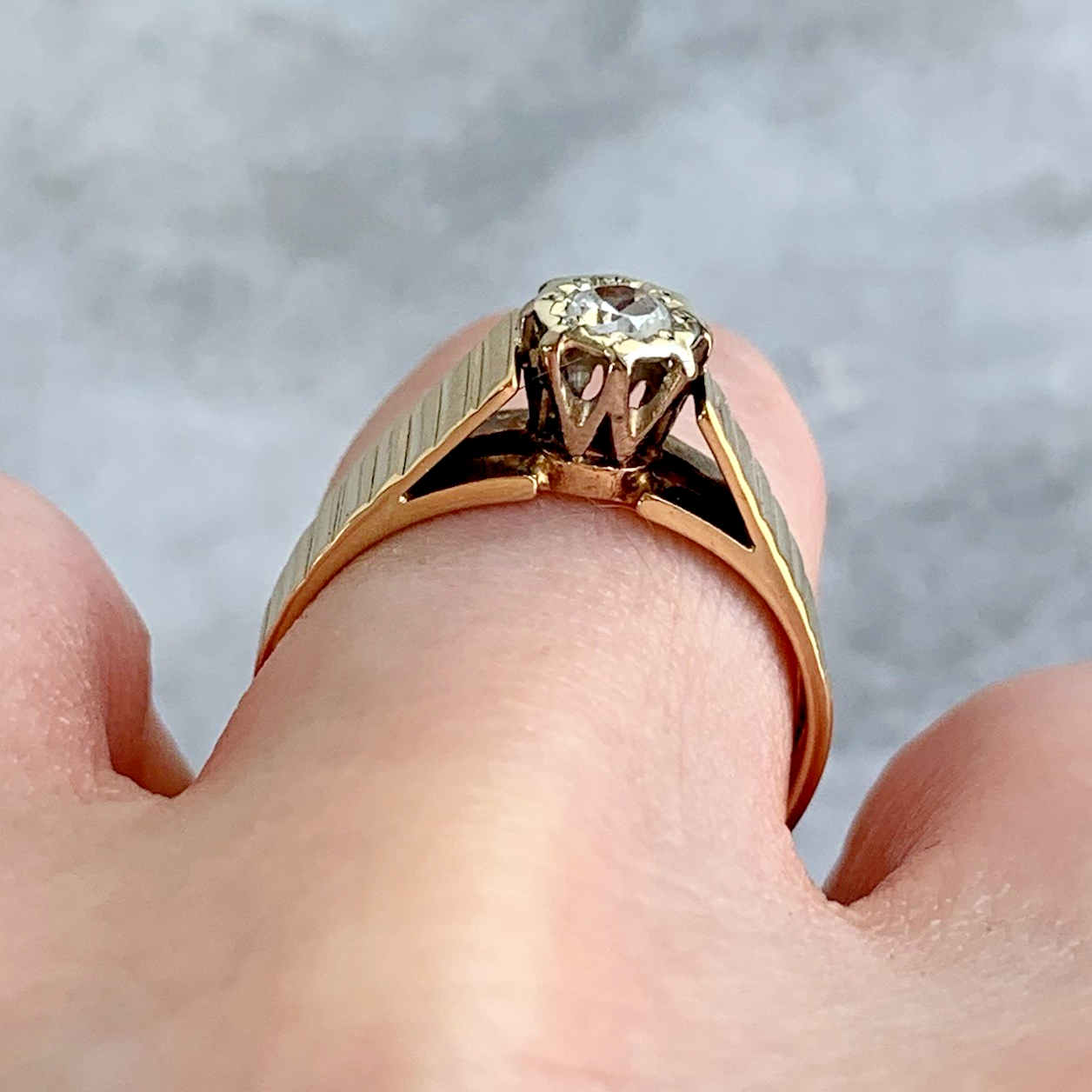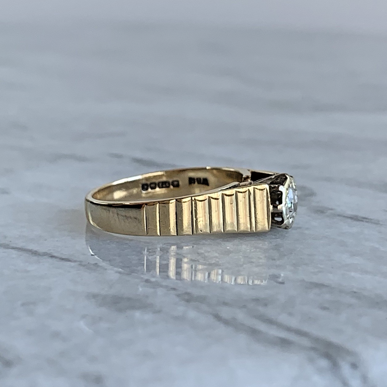 A beautiful gold ring showcasing a solitaire illusion set diamond upon antique style shoulders with a textured finish.