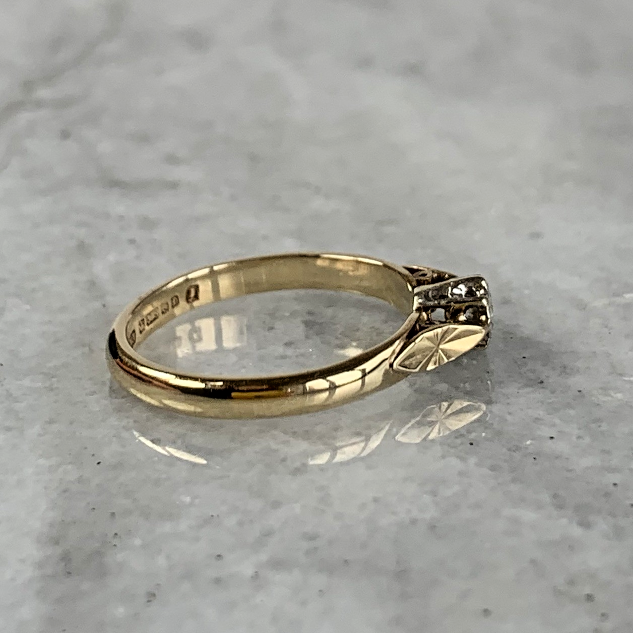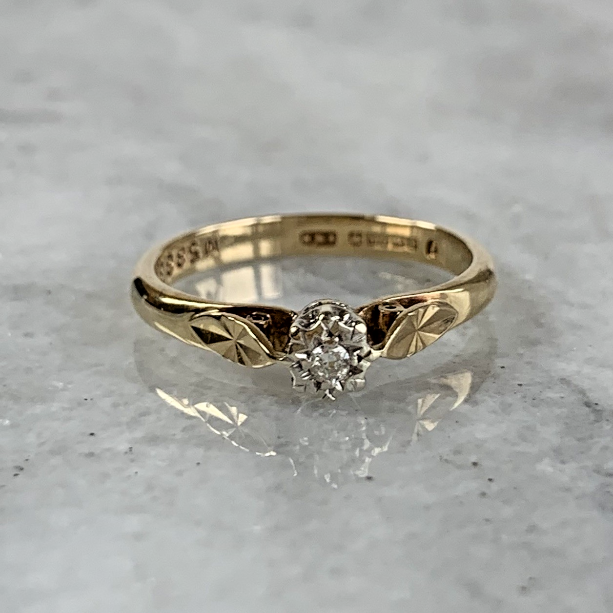A stunning gold ring showcasing a solitaire illusion set diamond upon cathedral style embossed shoulders.