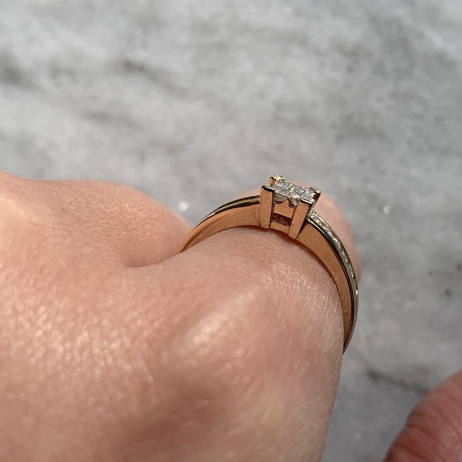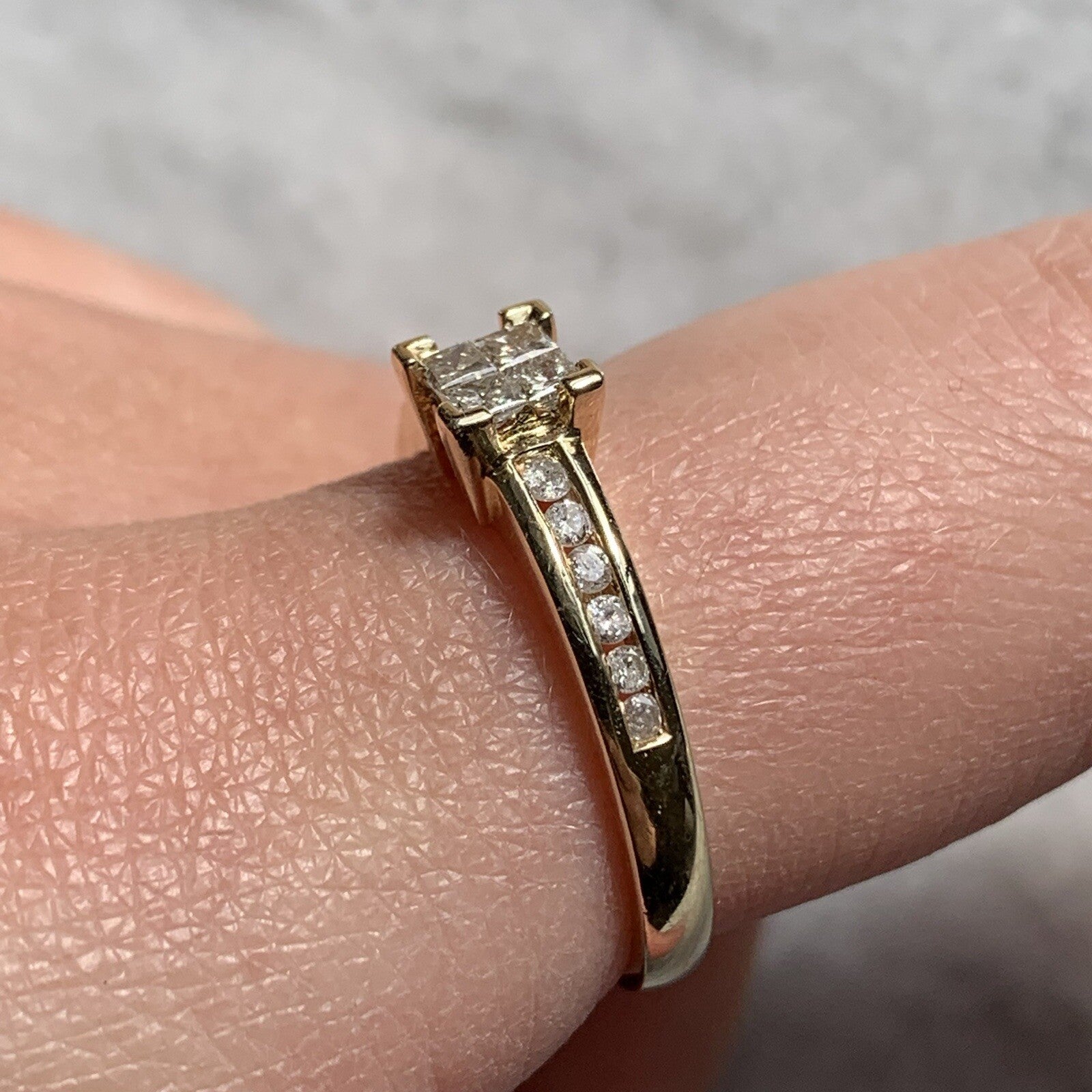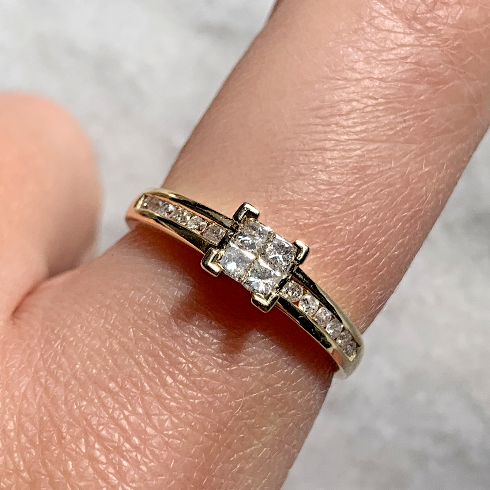 A beautiful gold ring showcasing an invisible set quartet of diamonds, further accented by channels of additional diamonds on the shoulders.