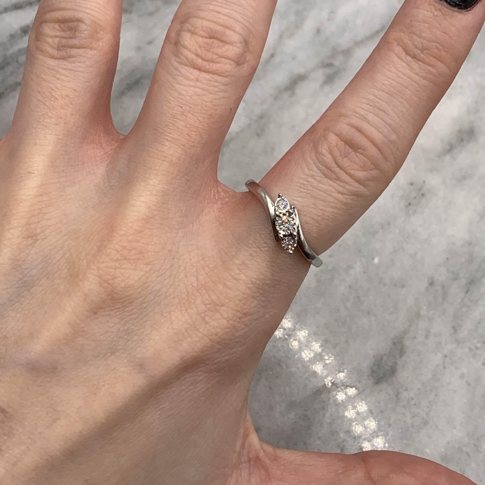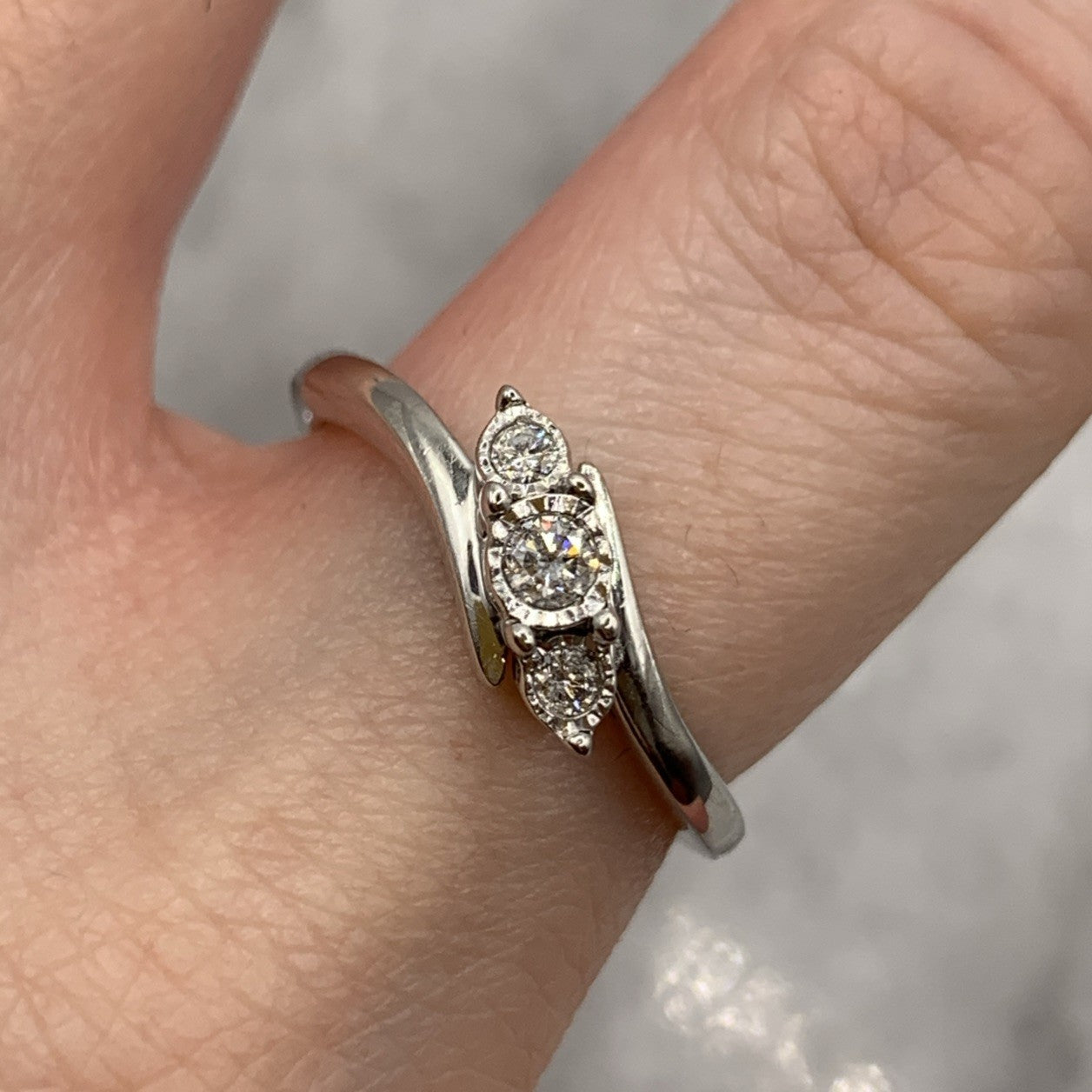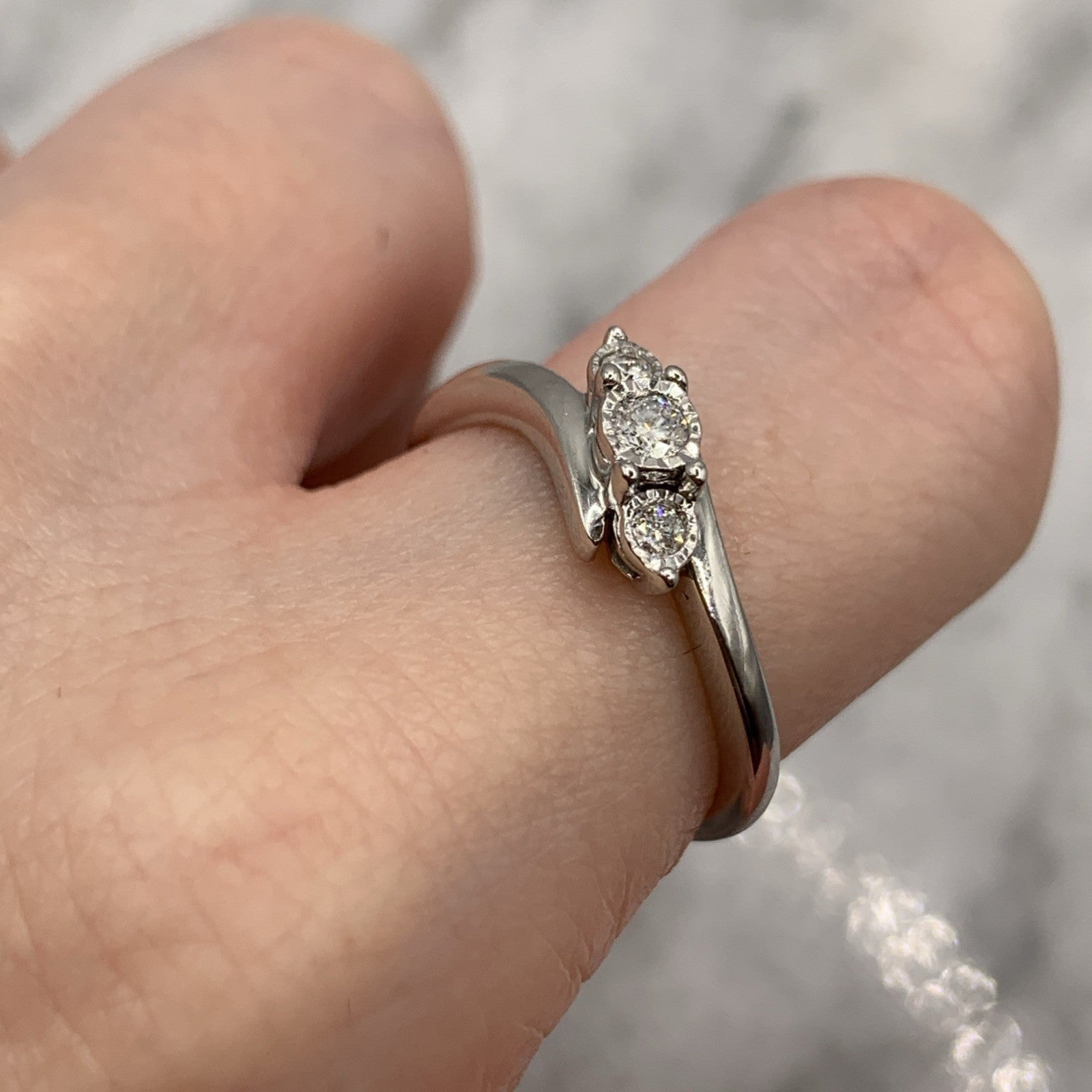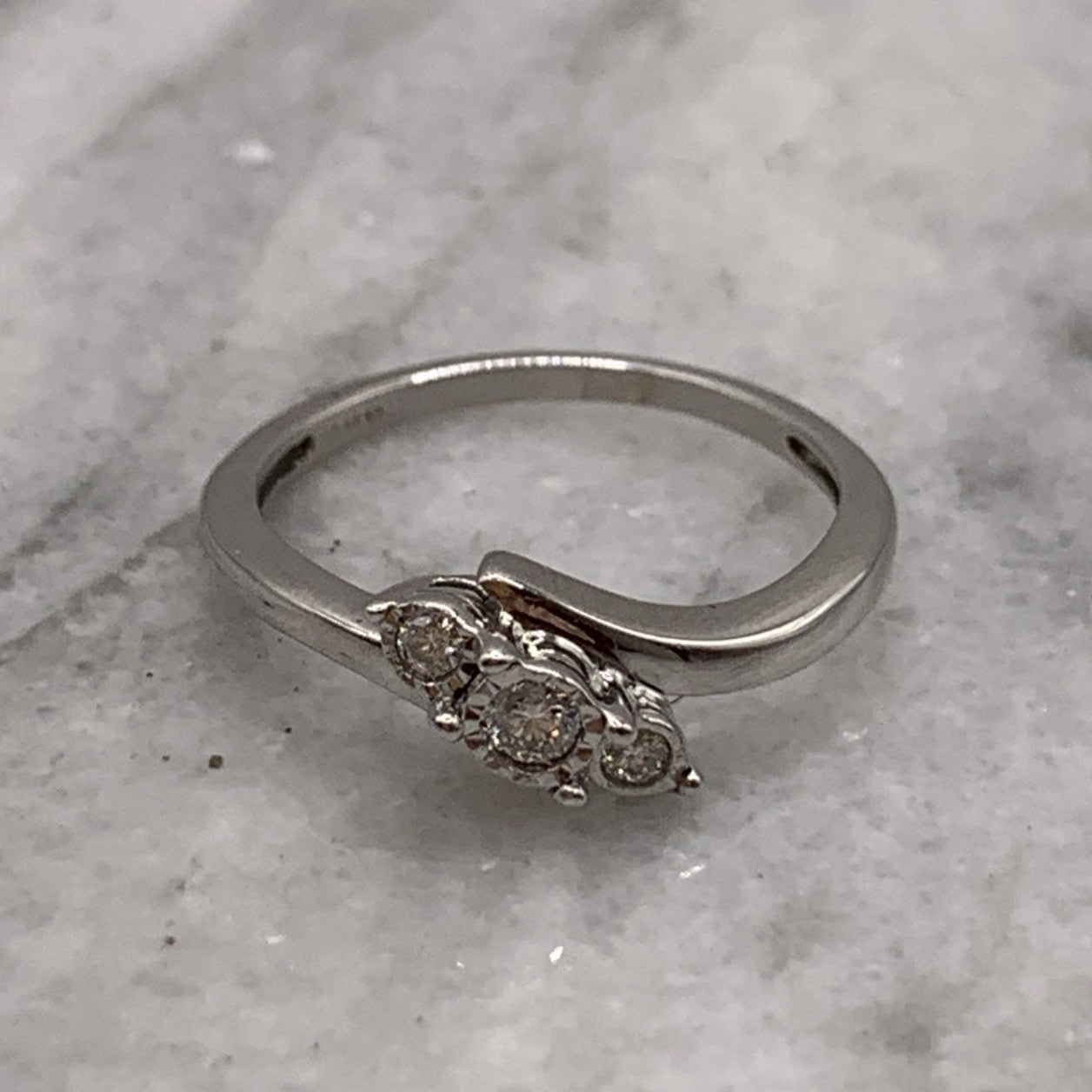A stunning white gold bypass style ring featuring a trilogy of illusion set diamonds.