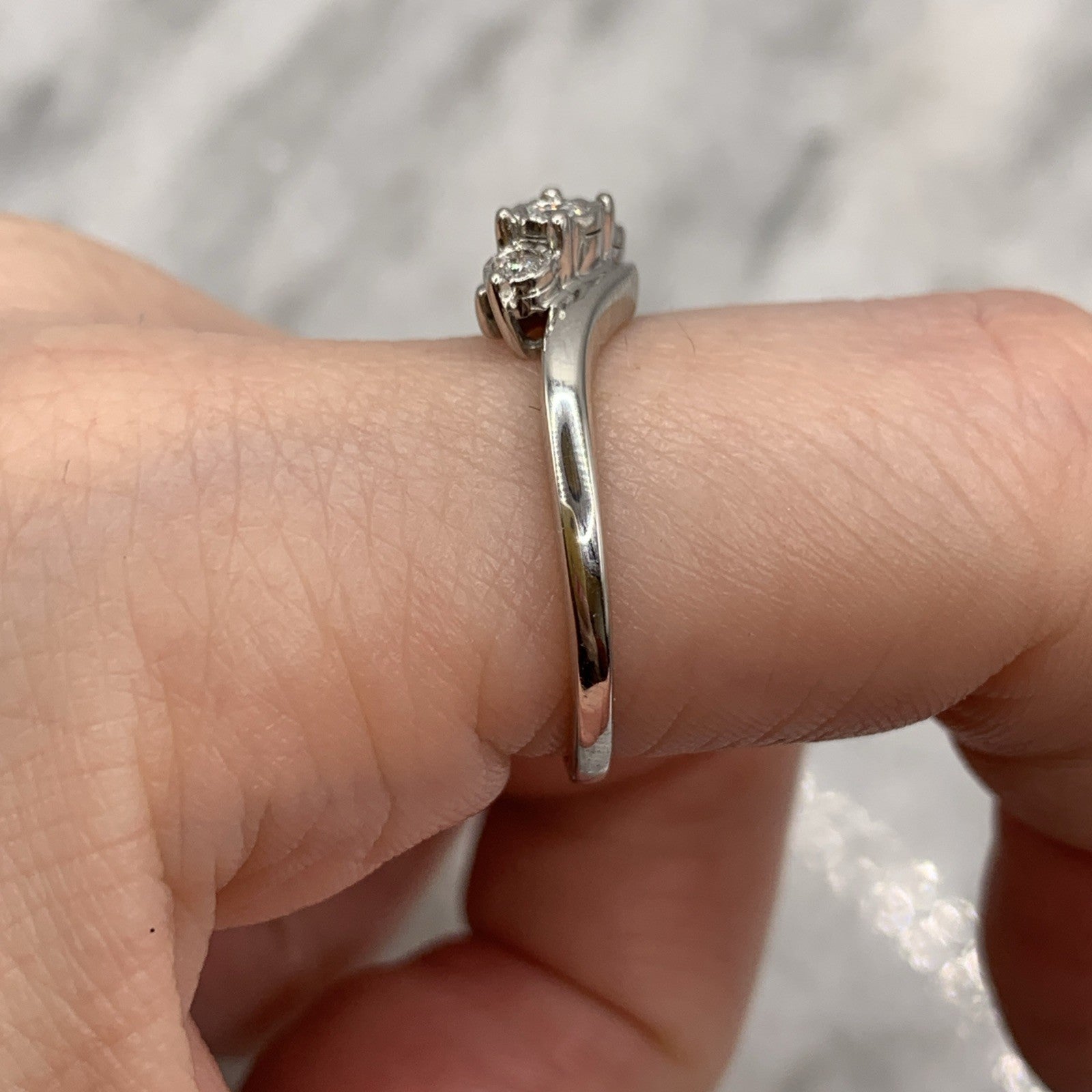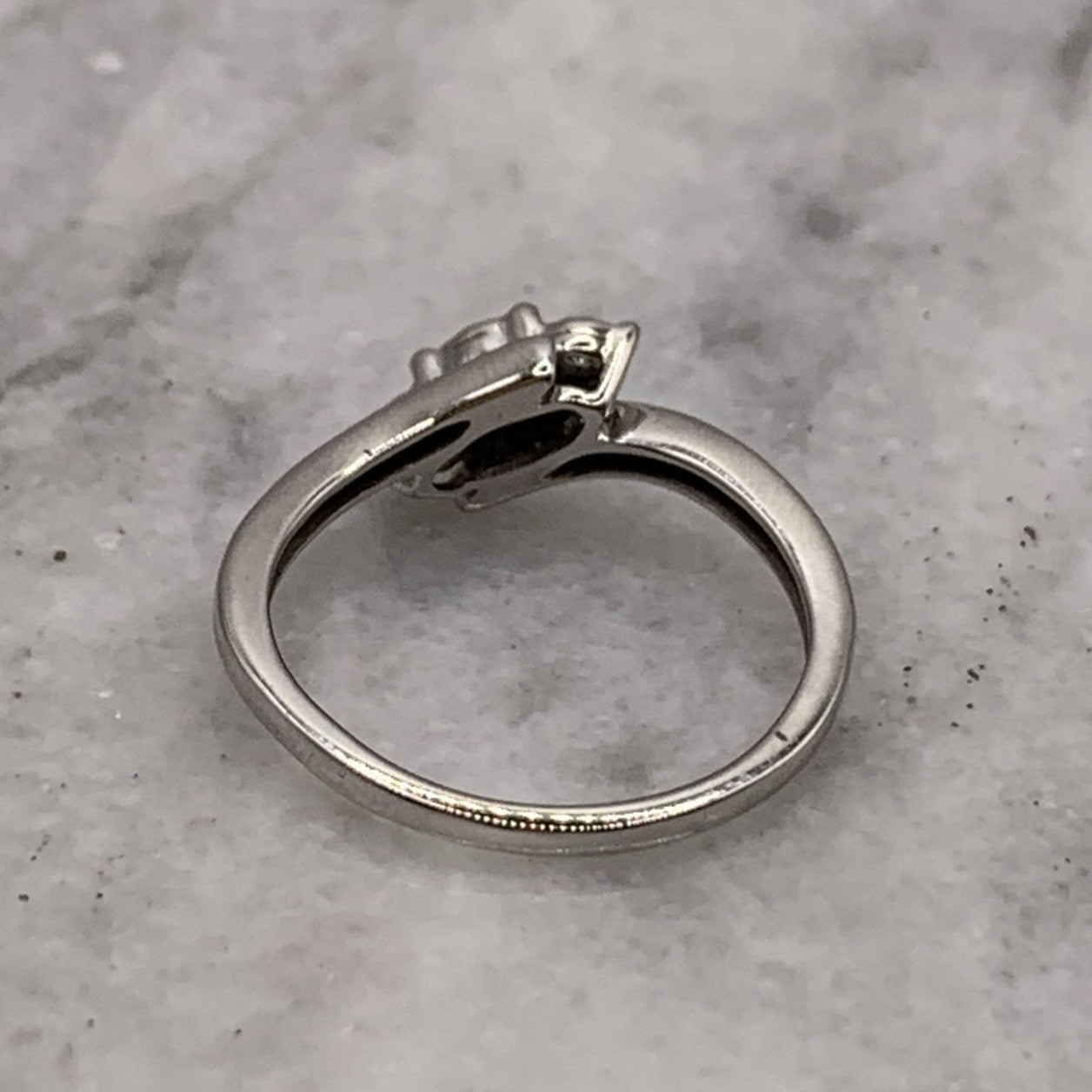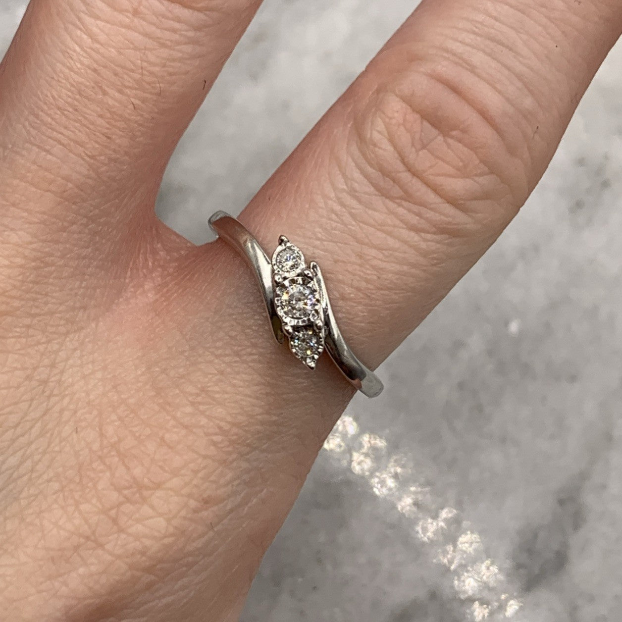 A stunning white gold bypass style ring featuring a trilogy of illusion set diamonds.