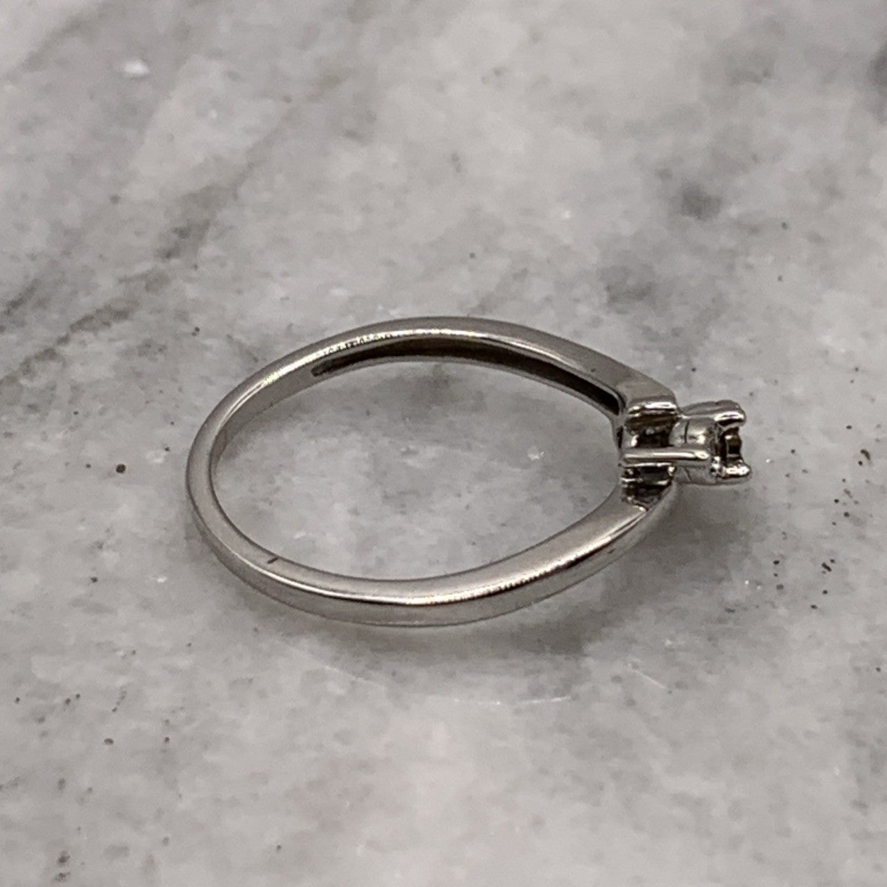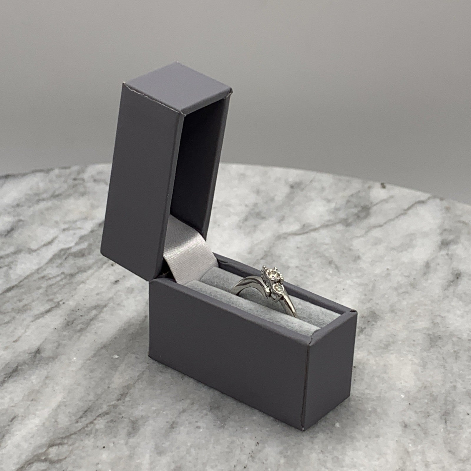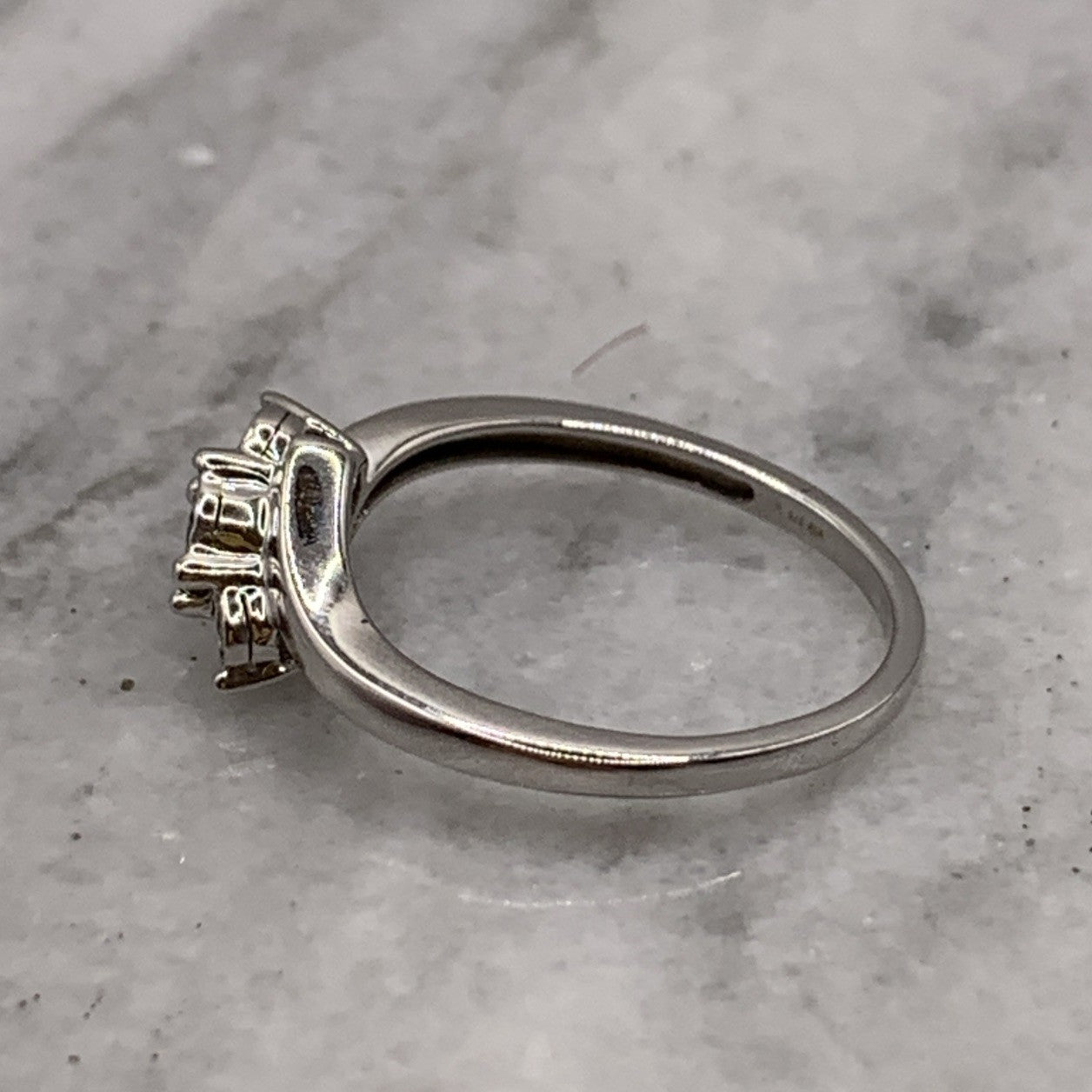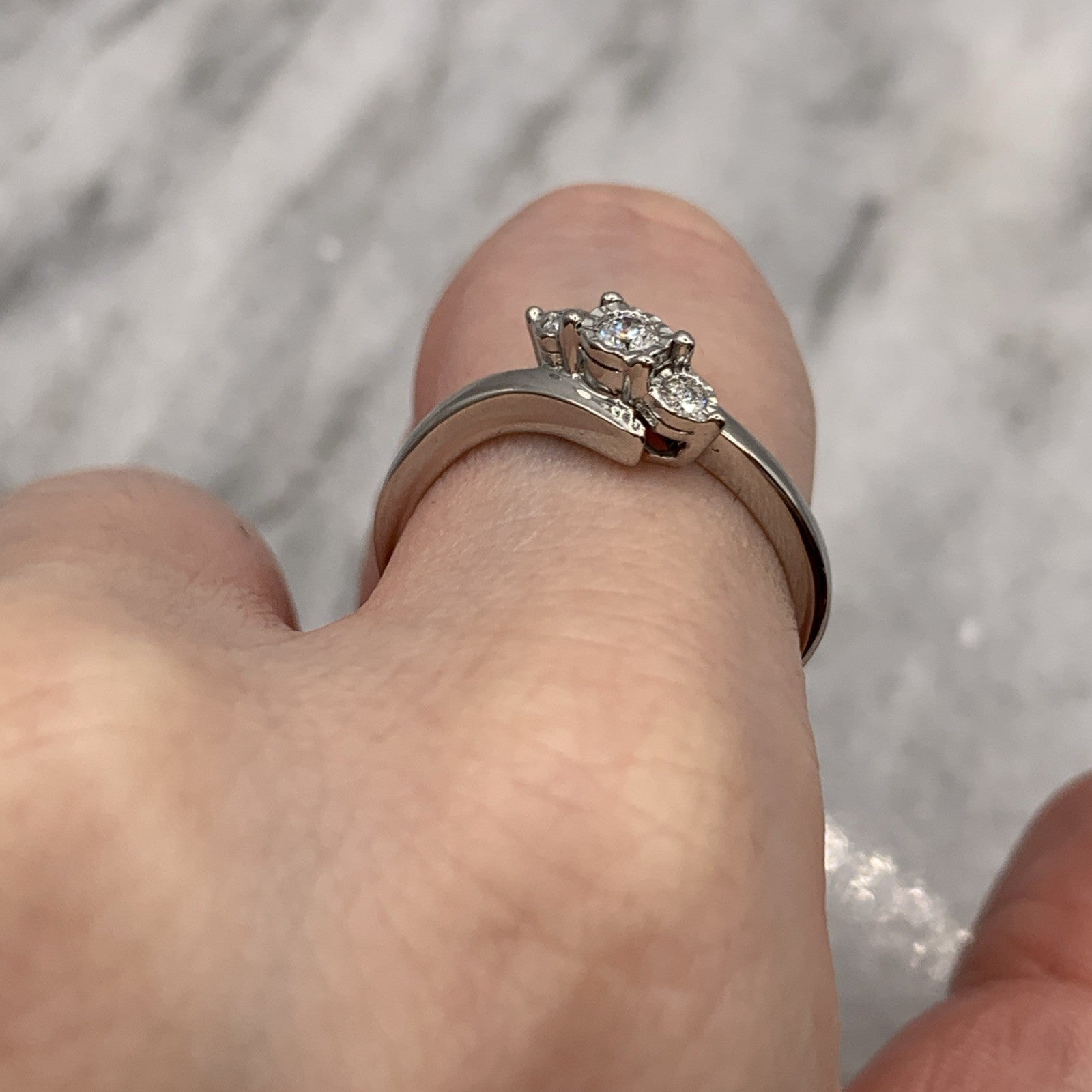 A stunning white gold bypass style ring featuring a trilogy of illusion set diamonds.