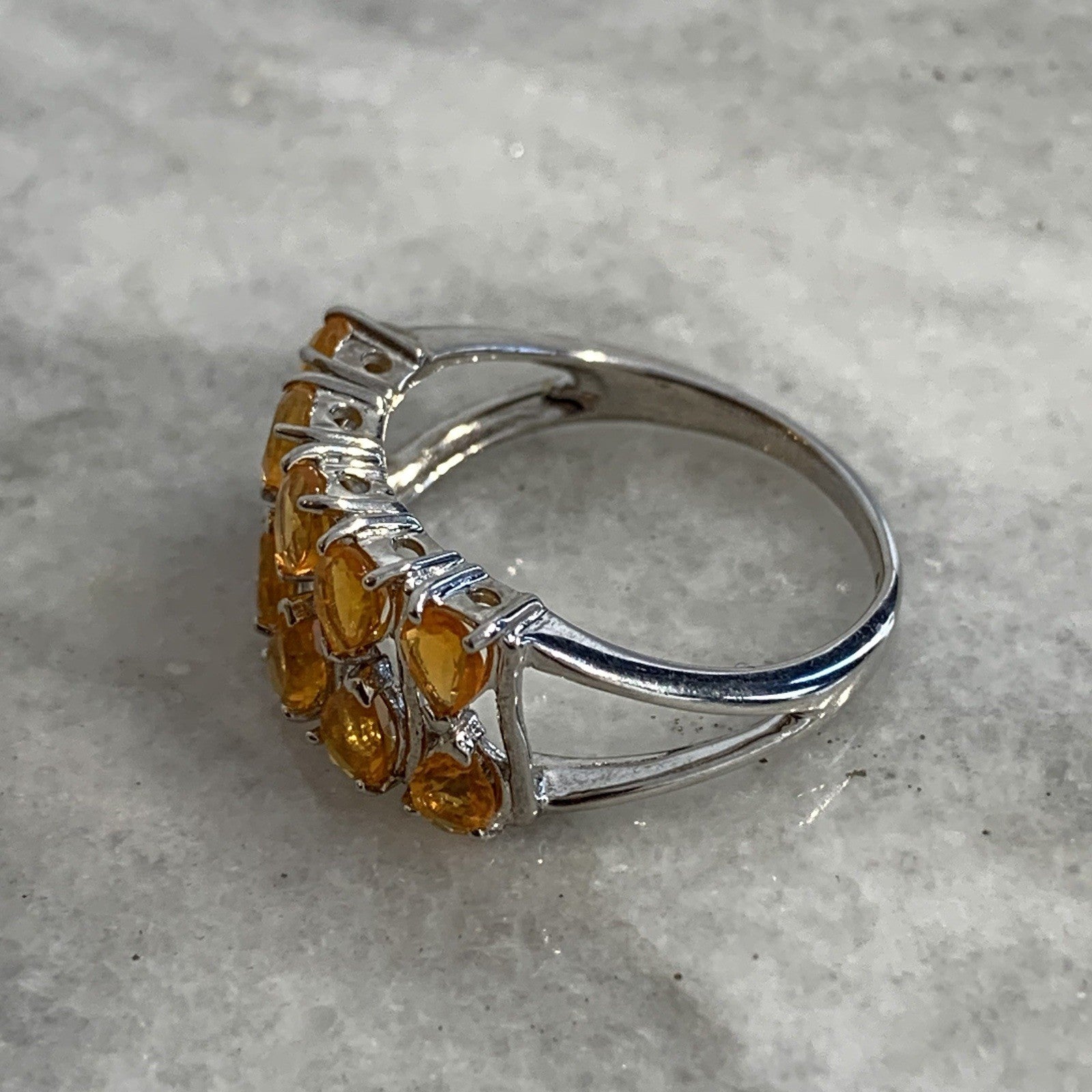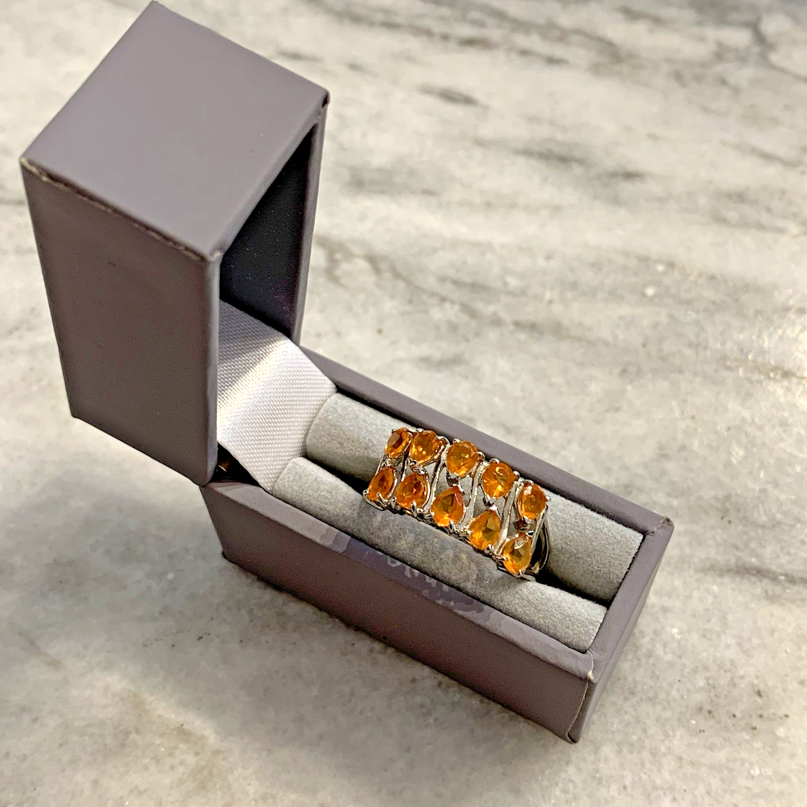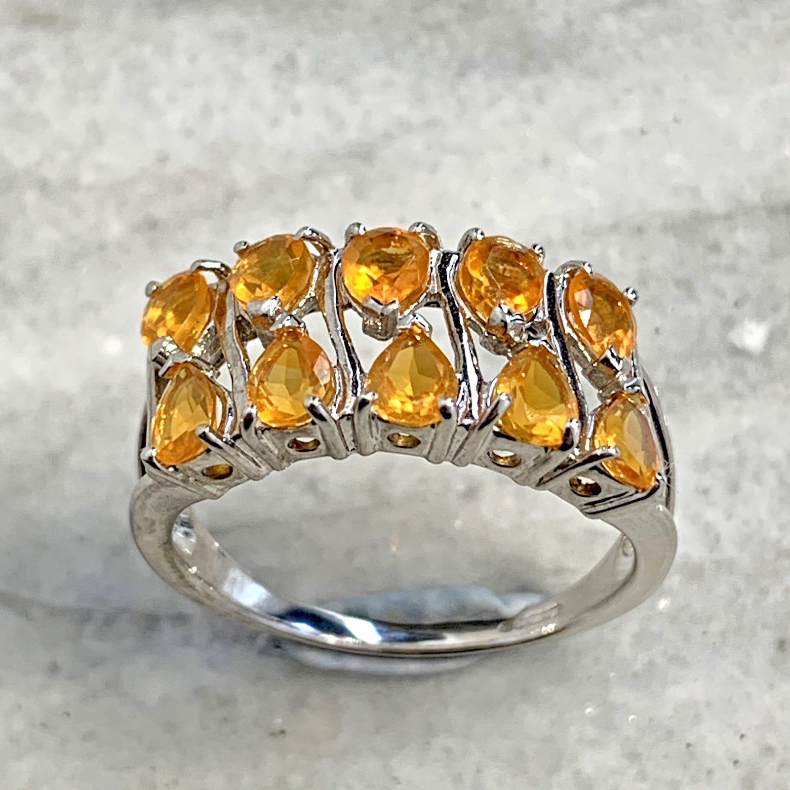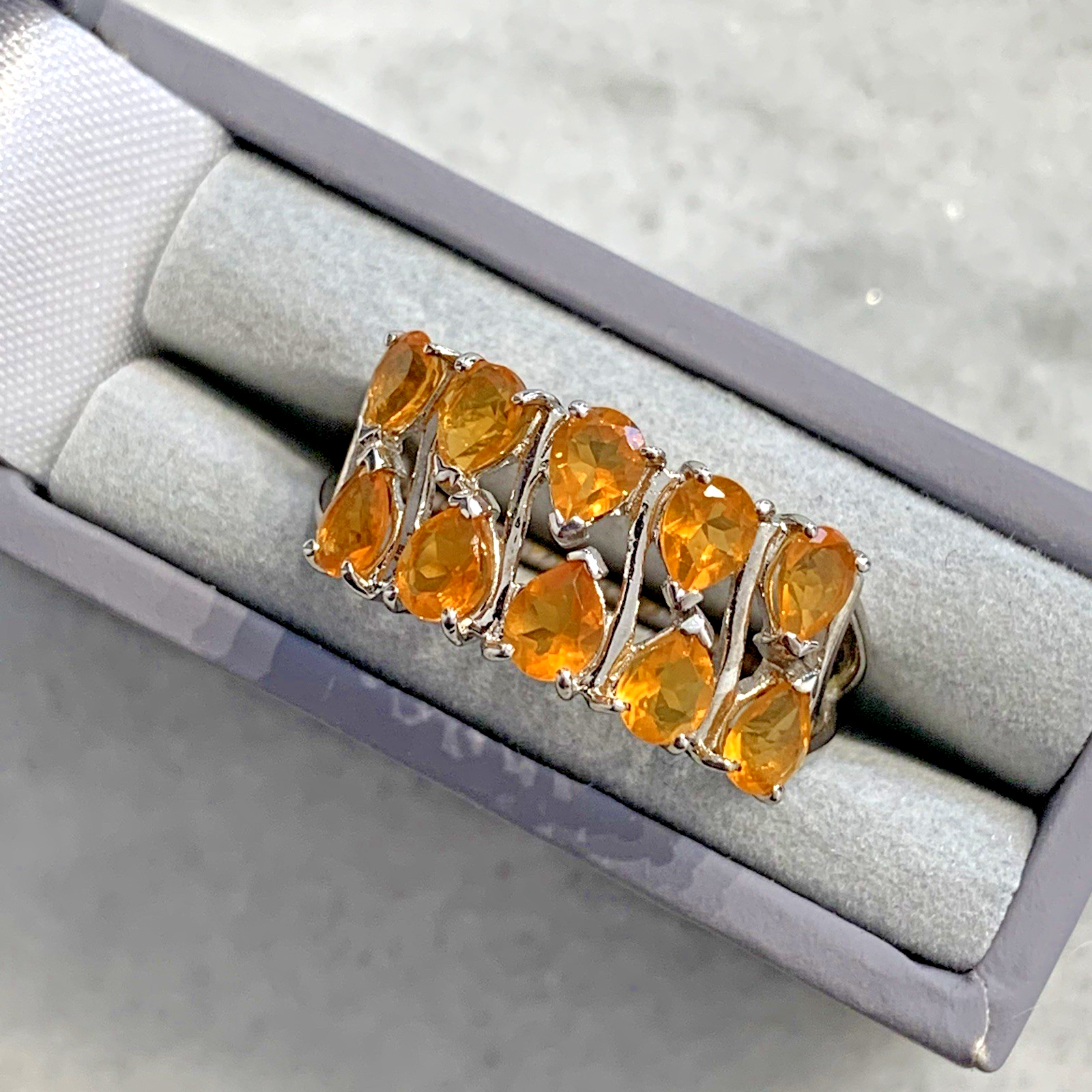 - A stunning white gold ring showcasing an ornate cluster of pear cut fire opal gemstones at .87ct.