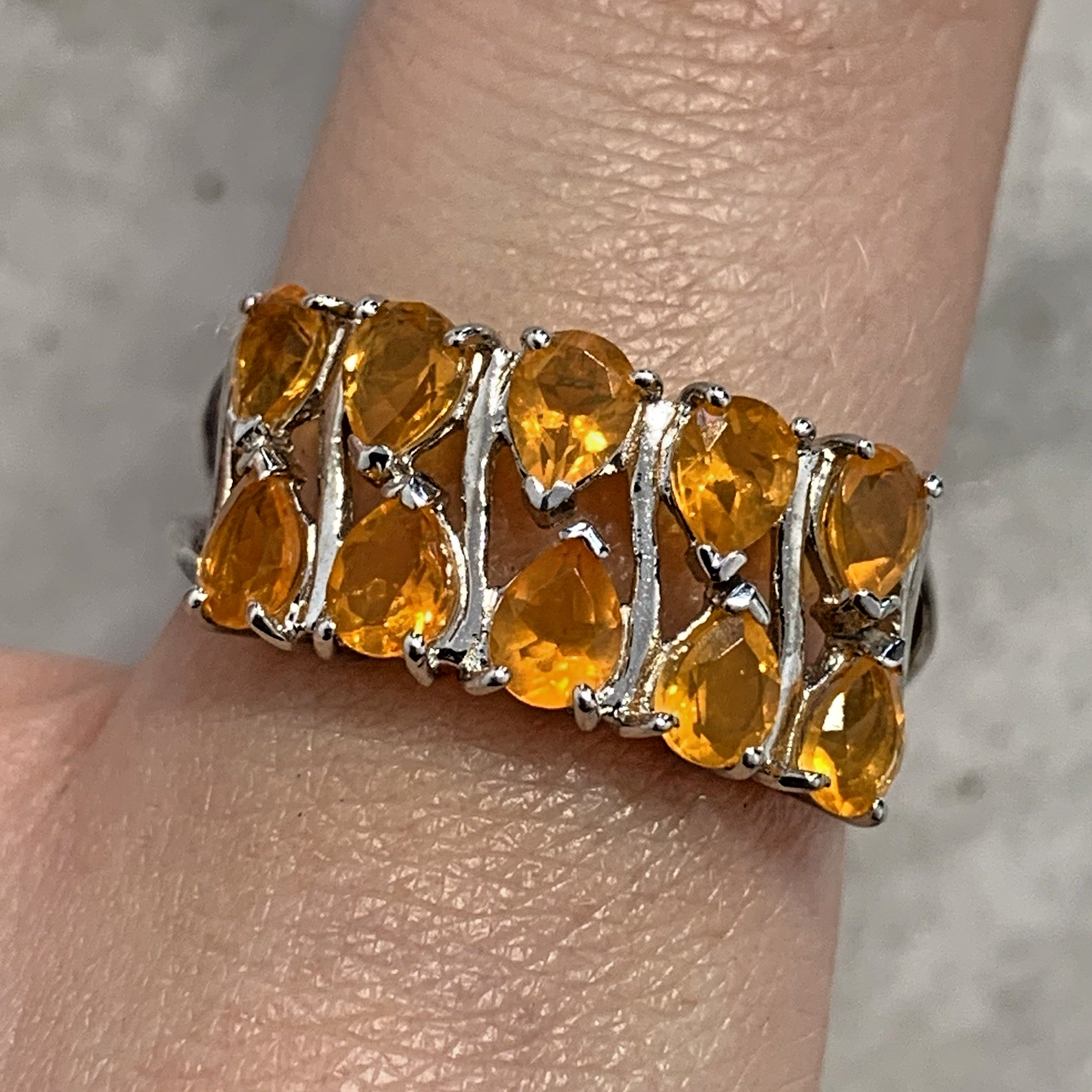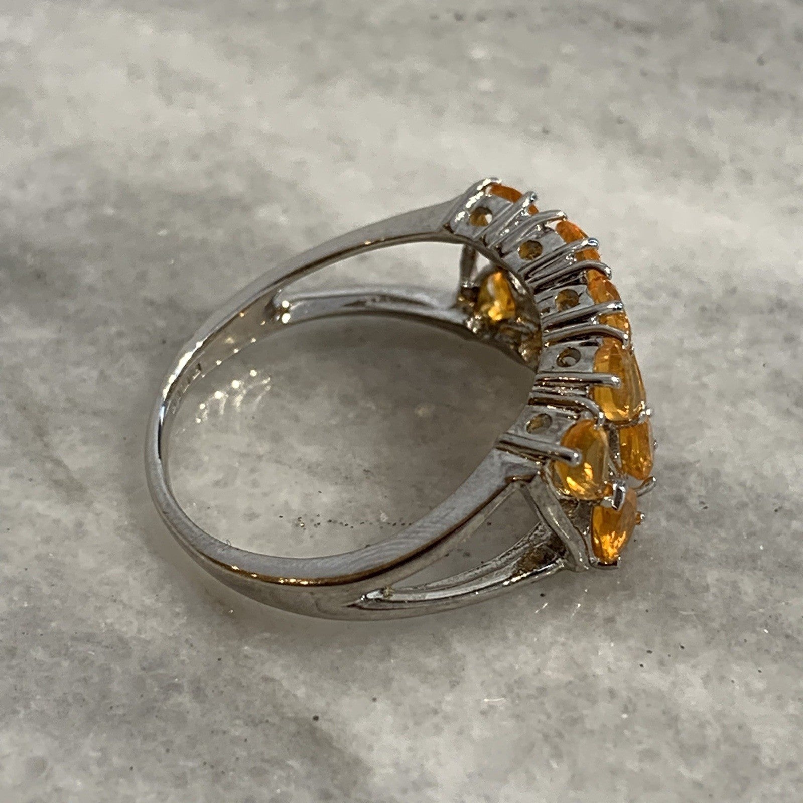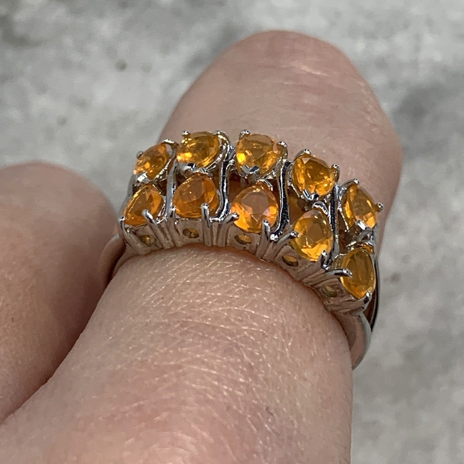 - A stunning white gold ring showcasing an ornate cluster of pear cut fire opal gemstones at .87ct.